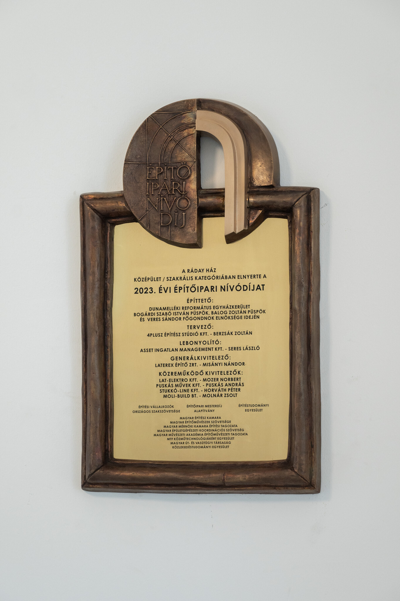 Felkerült a 2023-ban elnyert Építőipari Nívódíj táblája az újjáépült Dunamelléki Református Egyházkerület Székháza és Konferencia Központja épületére.