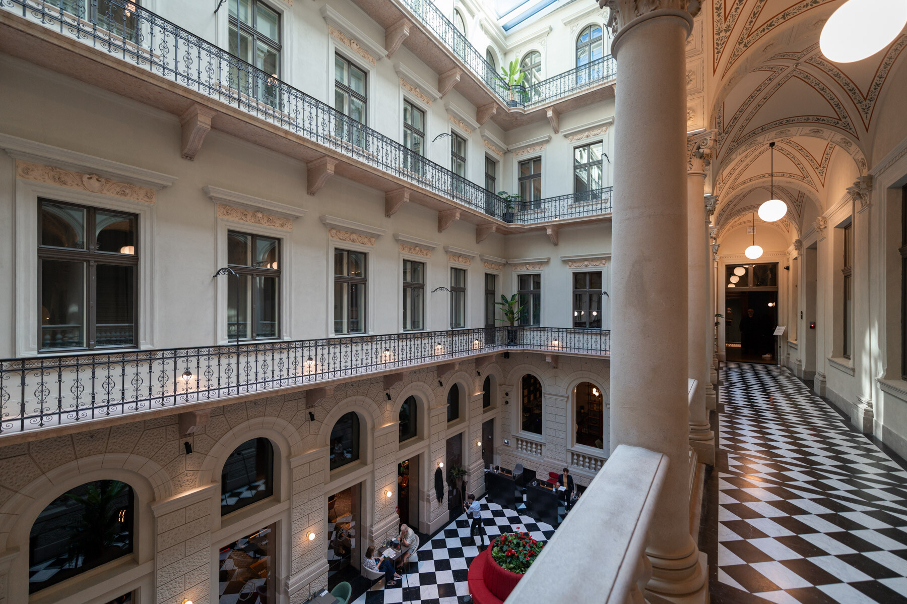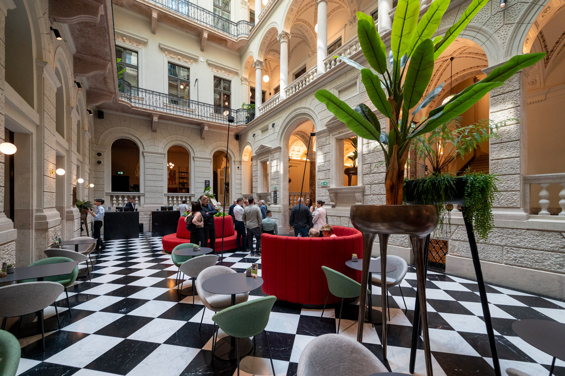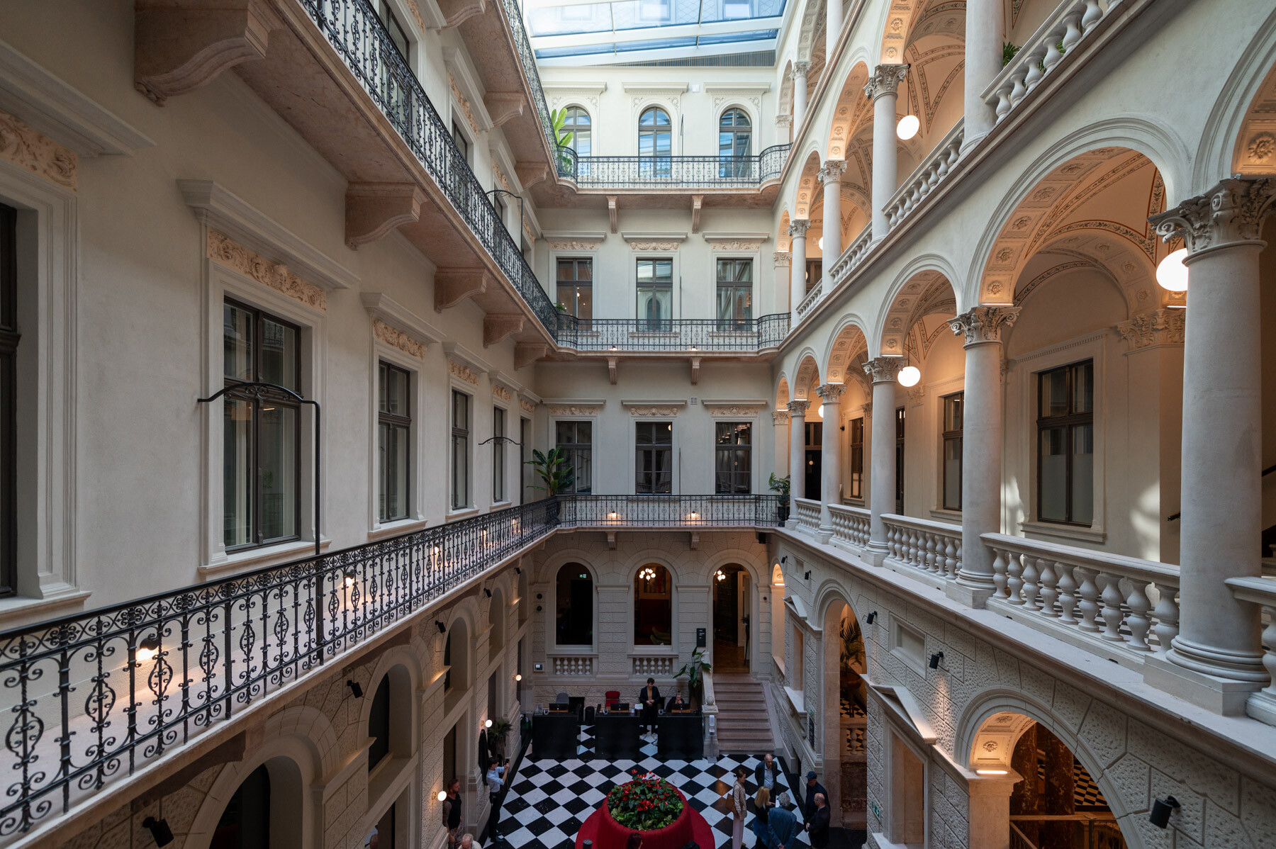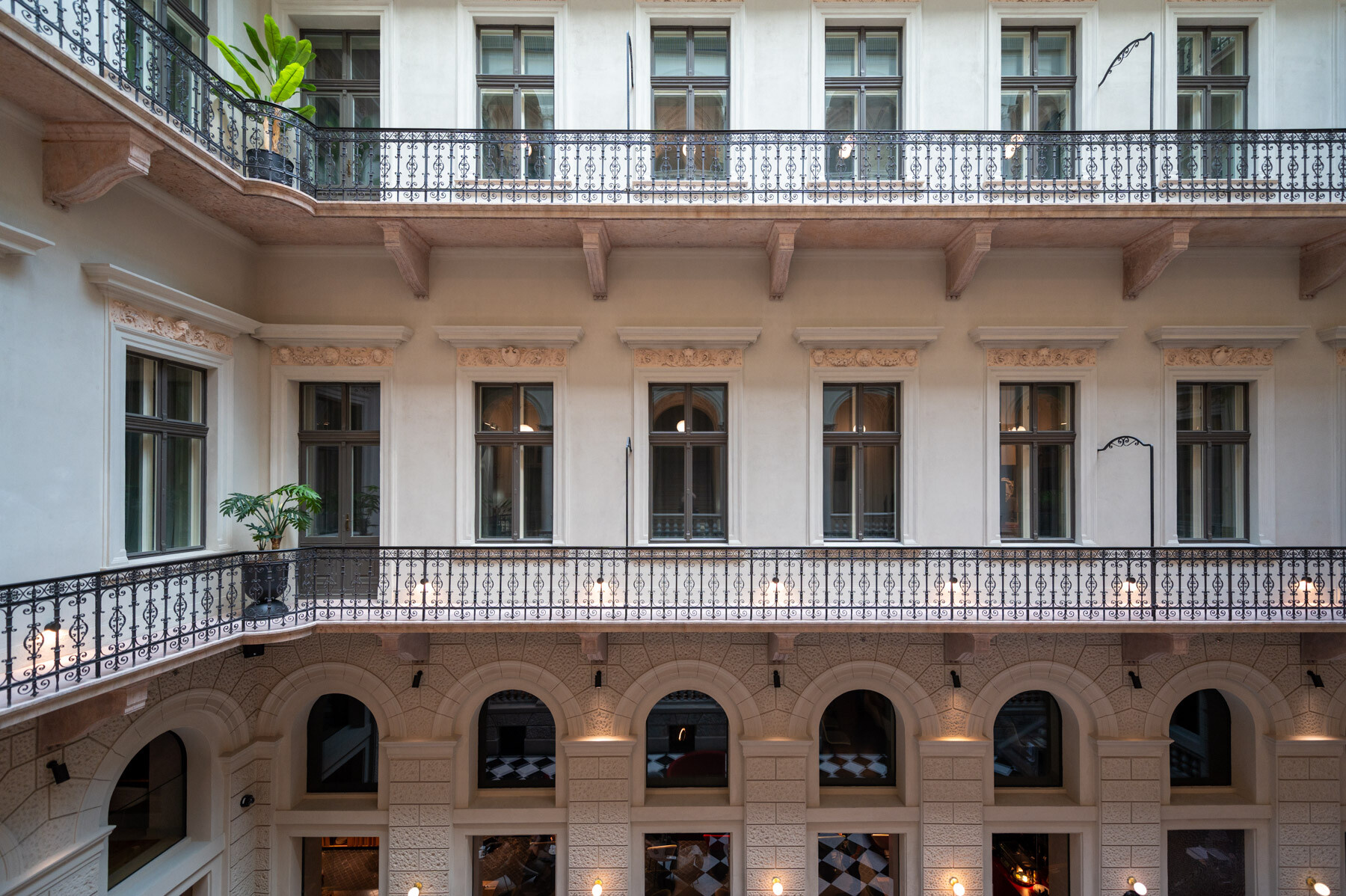 Az átalakítás követte a gangos fővárosi bérházak felújításának receptjét: az udvar üvegfedésével kialakult az épület központi tere, a lobbi, körülötte pedig a közlekedőrendszer. A neoreneszánsz palota sűrű homlokzatrasztere és ablakosztása kedvezett a szállodai szobák elhelyezésének. A reggeliző a lobbi mögött kapott helyet; a wellness részleg a pincébe került, a gépészet pedig a pince- és tetőszinten leeső területeken kapott helyet. Mint hozzátette: