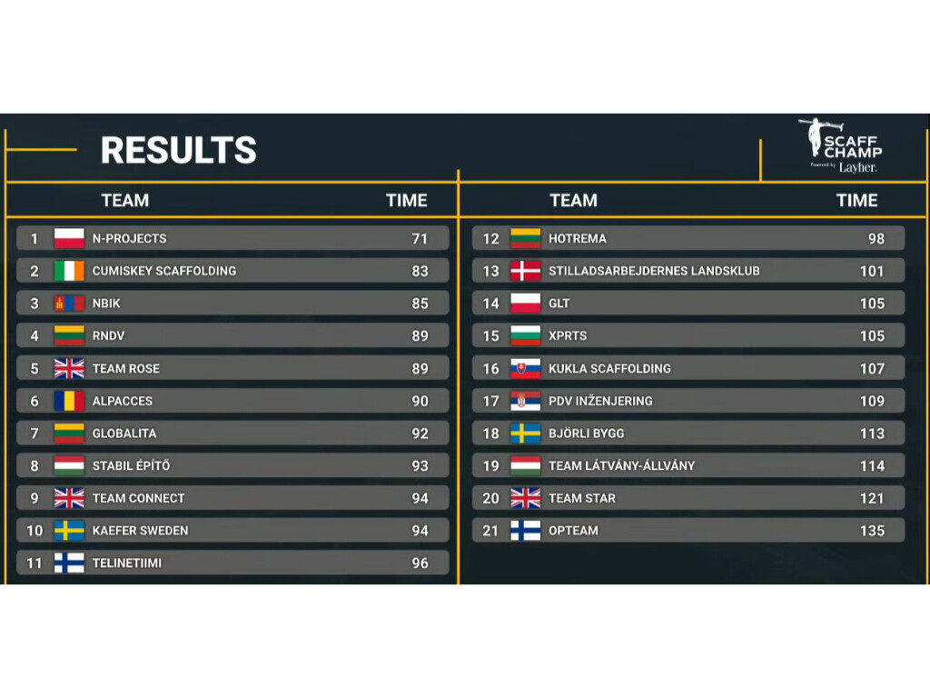 A világdöntő magyar indulói, a Layher Kft. Tiszaújvárosban megrendezett nemzeti versenyének legjobbjai voltak: a Stabil Építő Kft. és a Látvány-Állvány Kft. szakemberei. Ők mérték össze felkészültségüket az Egyesült Királyság, Finnország, Svédország, Mongólia és Litvánia csapataival. A Stabil Építő Kft. csapata a nyolcadik legjobb idővel zárta a küzdelmet. A másik gárda a 19. helyen végzett.