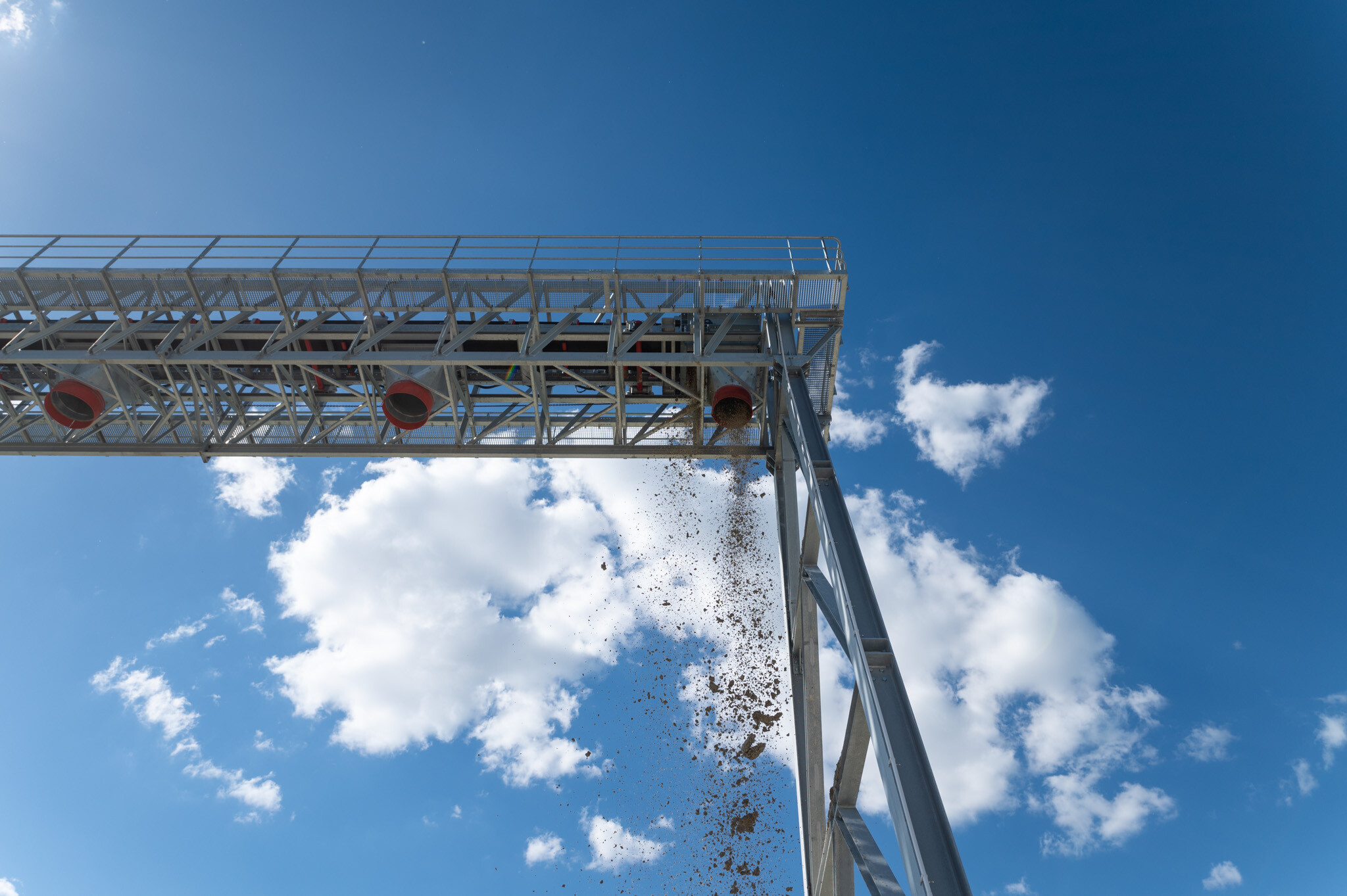A bányában megvalósított fejlesztéseknél lényeges szempont volt a környezeti terhelés csökkentése, ezért a teherautós homokszállításról áttértek a szállító hevederes (gumiszalag) szállításra.