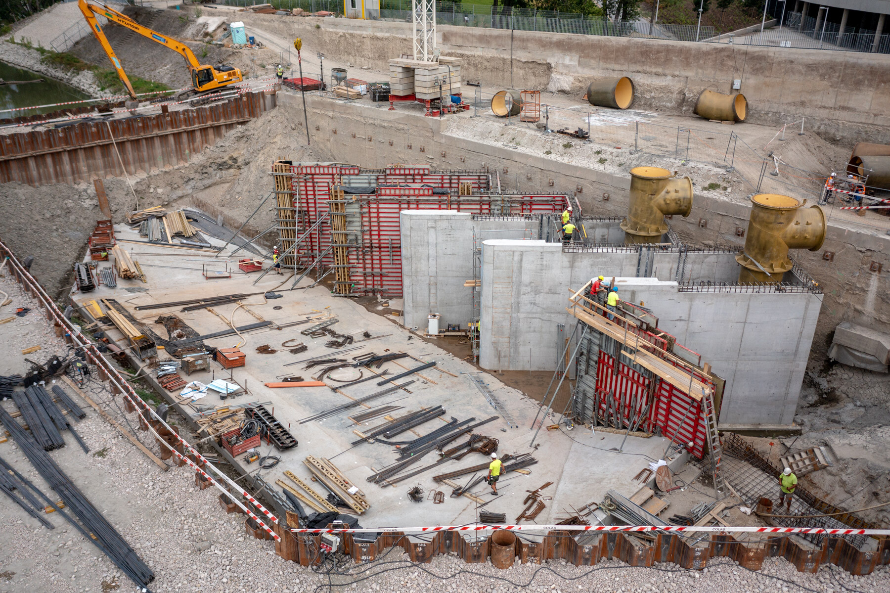 A kivitelezés feszített ütemezése miatt két műszakban, tehát éjjel-nappal folyik a munka a vízerőtelepnél. Emiatt is a MEVA nagytáblás zsaluzáshoz használt Mammut termékeit alkalmazták a műtárgynál, amellyel harminc százalékkal is lefaragható a zsaluzási idő.
