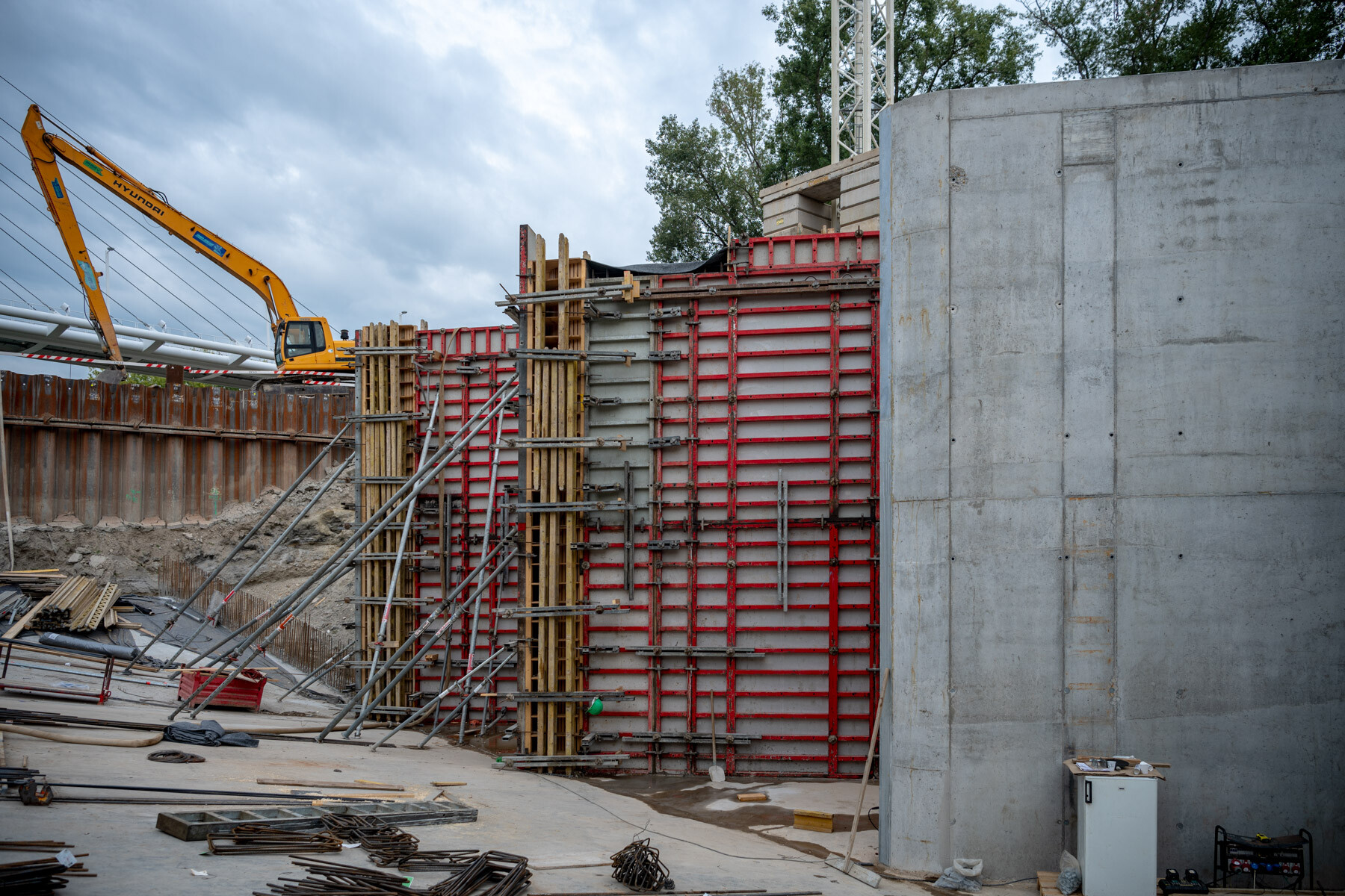 A projekt megvalósításában szerepet vállalt a Horizont Invest Szerkezet Kft. is, a cég szakemberei pedig a MEVA Zsalurendszerek Zrt. zsaluzatainak segítségével több mint hét méteres falmagasságig készítik el a folyómederben a műtárgyat.