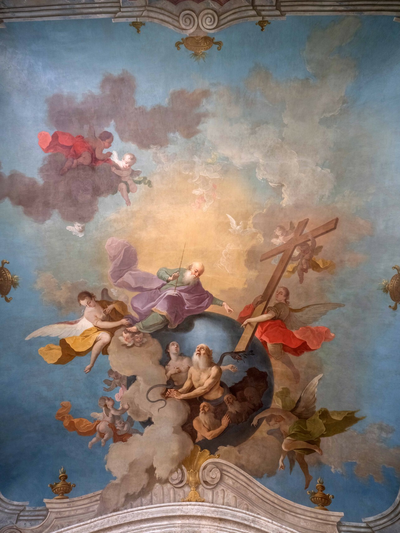 A kápolna mennyezetképét Johann Ignaz Cimbal készítette, azonban egészen meglepő technikával.