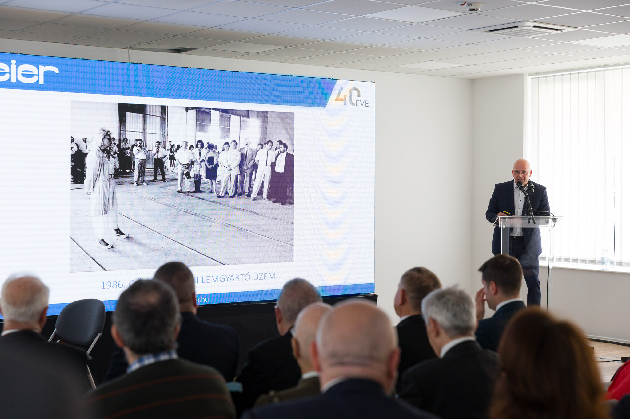 Komlós Andor, a Leier Hungária Kft. ügyvezető igazgatója nosztalgikus prezentációval tekintett vissza az elmúlt négy évtized mérföldköveire. Többek között a Leier Hungária első termékére, egy belső szigeteléssel ellátott falazóelem gyártására, a jánossomorjai gyár fejlődésére – 400 dolgozójával ez ma a cég legnagyobb telephelye -, a mátraderecskei téglagyár modernizálására, vagy a Leier belépésére az alapanyag-előkésztés területére.