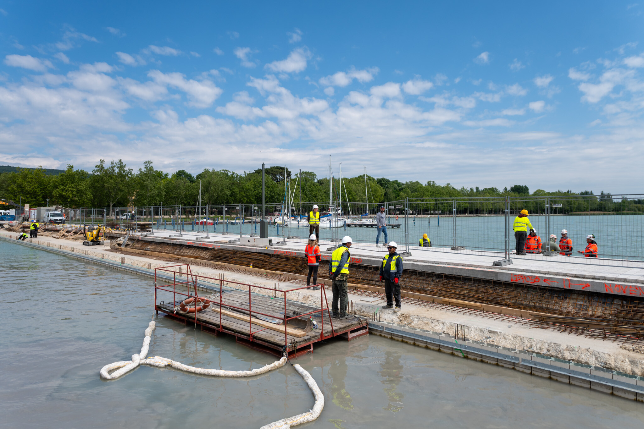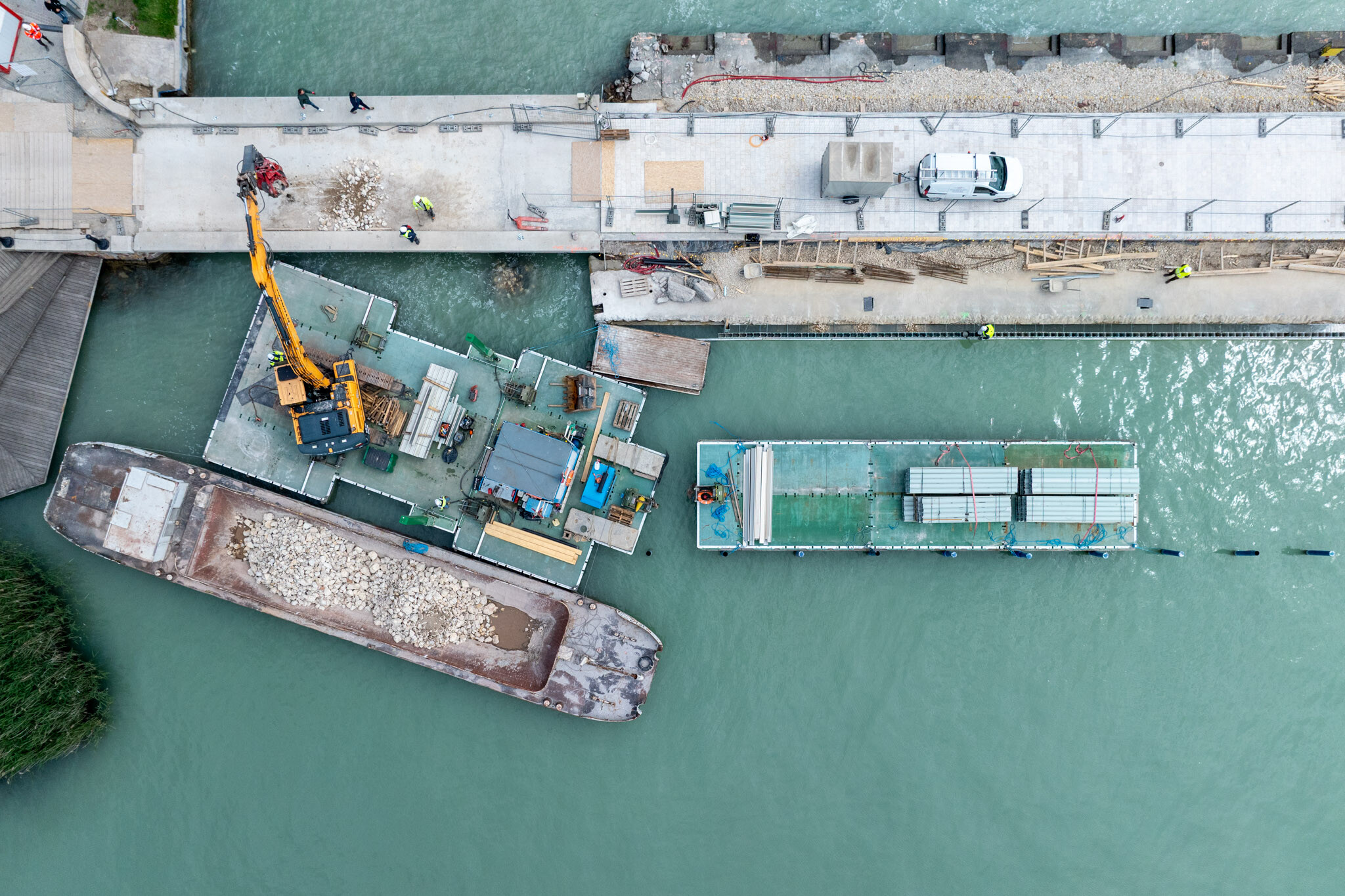 A kivitelezés munkálatait nemcsak a feladat tette különlegessé, hanem a sajátos organizációs adottságok is. Folyamatos kihívást jelentett az építési forgalom bejutásának biztosítása a munkaterületre a népszerű Tagore sétányon át – árulta el portálunknak Fekete Katalin. A STRABAG építésvezetője hozzátette, a kivitelezési munkák elkezdésének tavaly decemberi időpontjában műjégpálya nyílt, ami februárig korlátozottá tette a móló part felőli megközelítését a munkagépek számára.