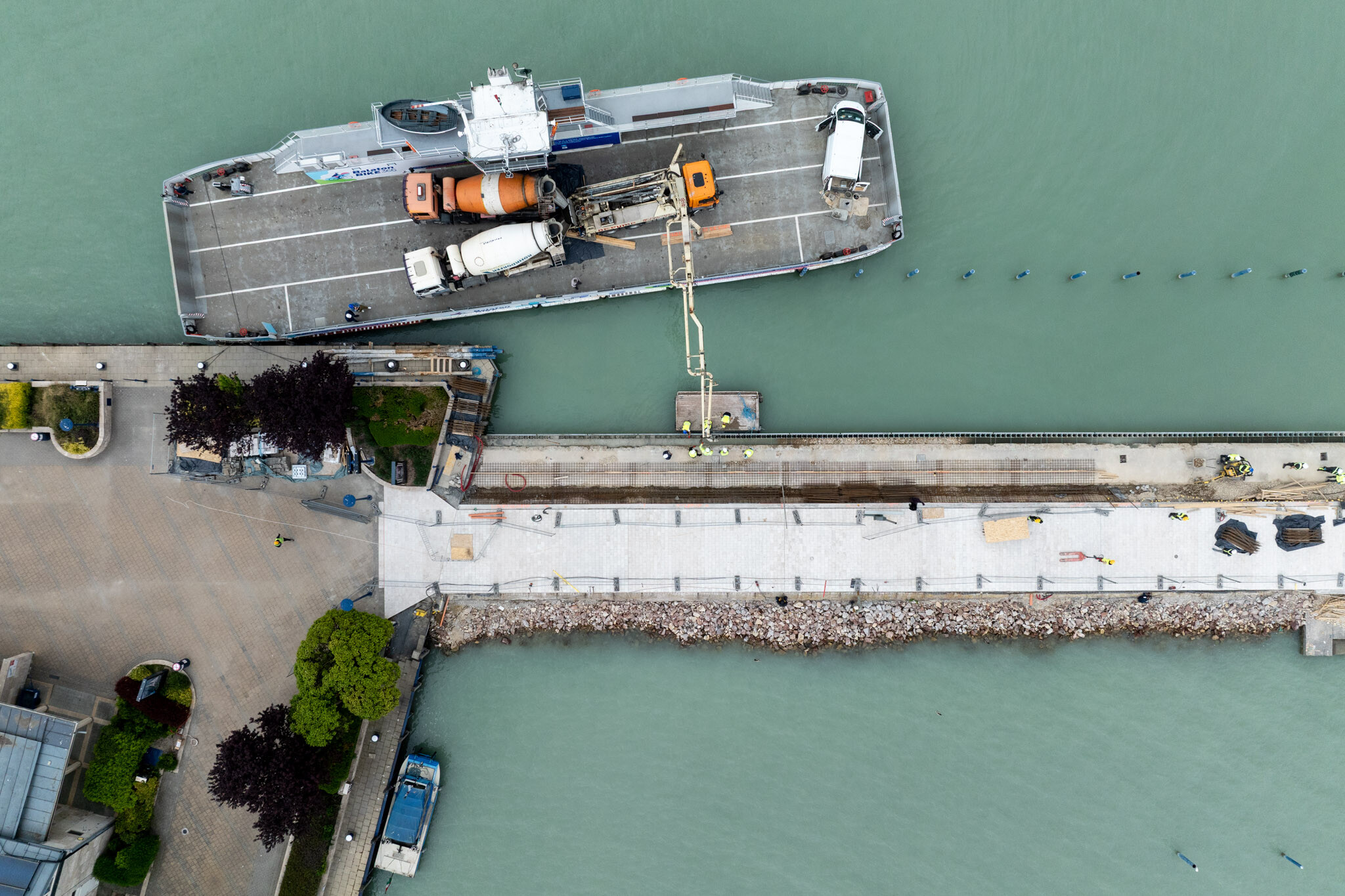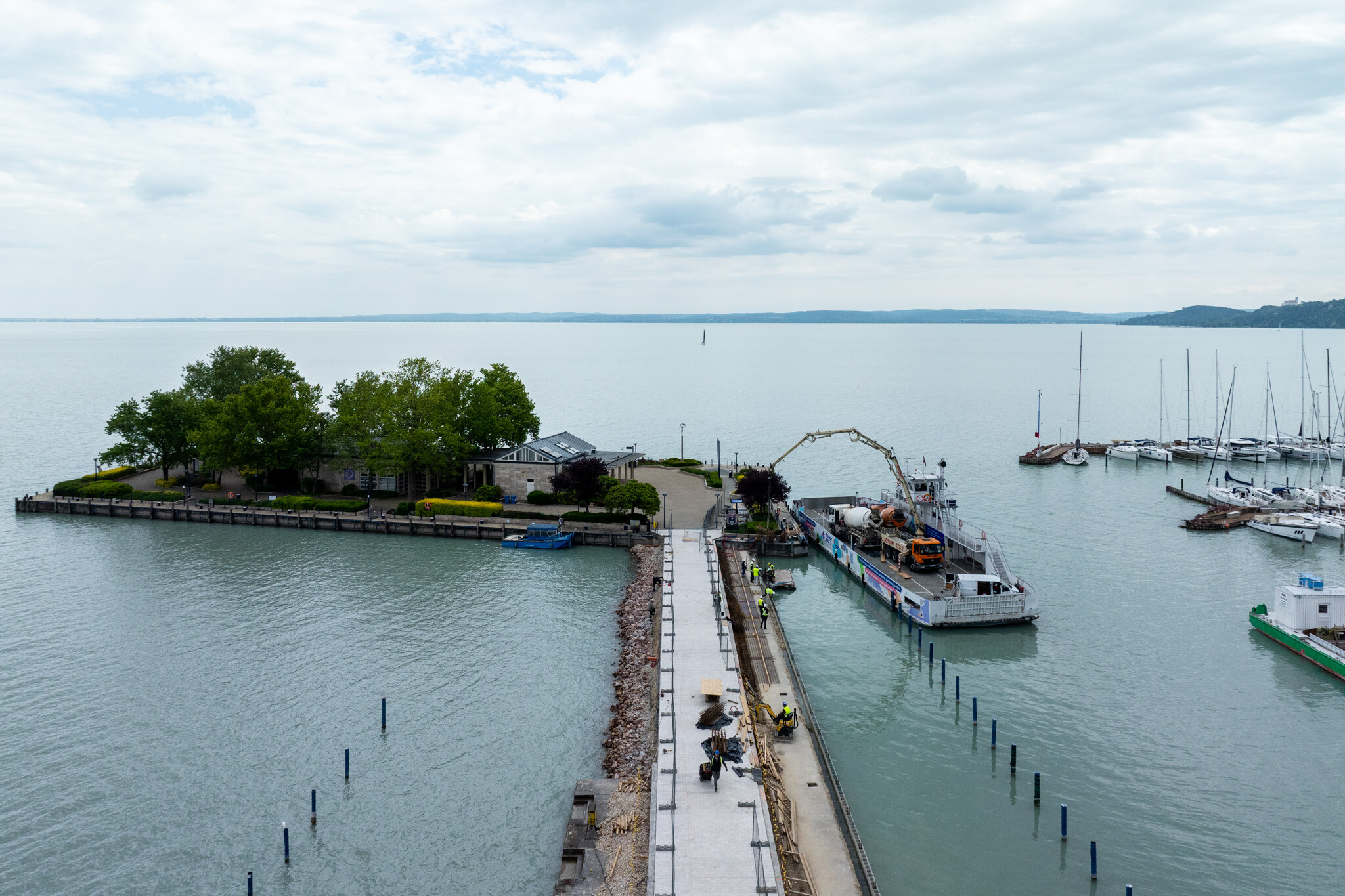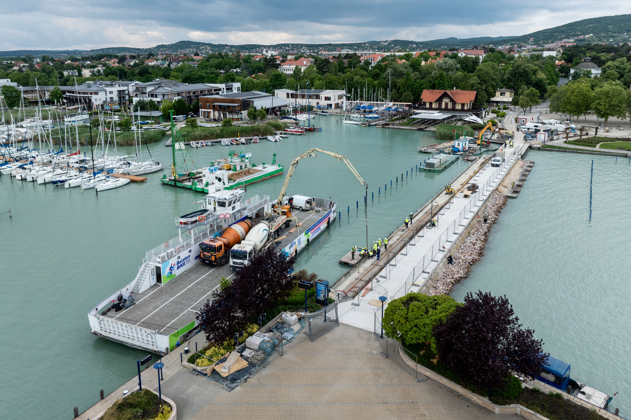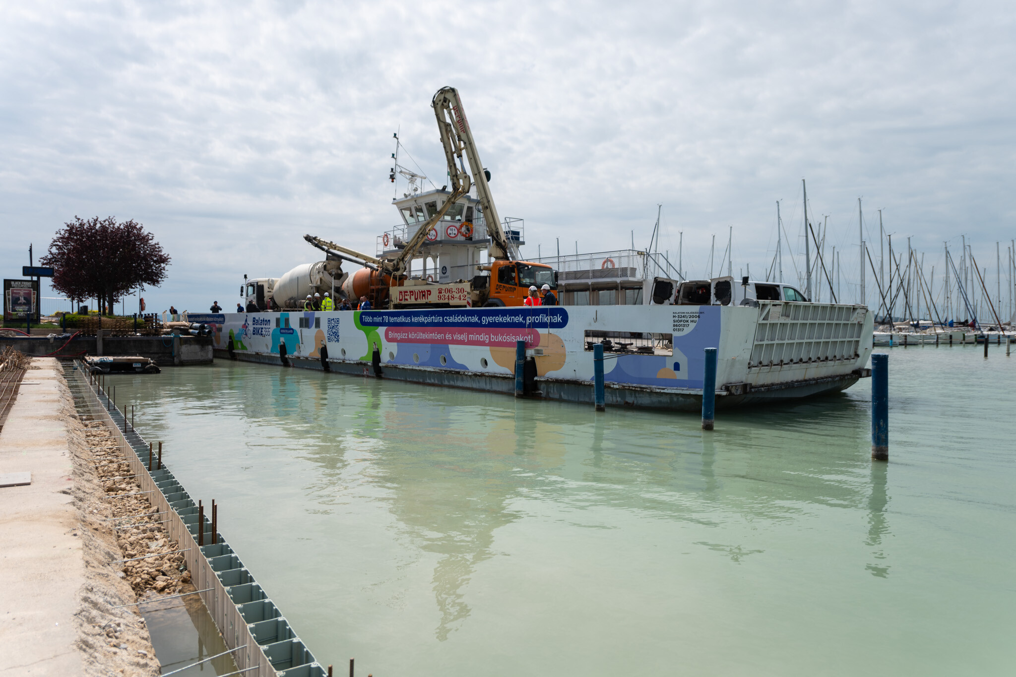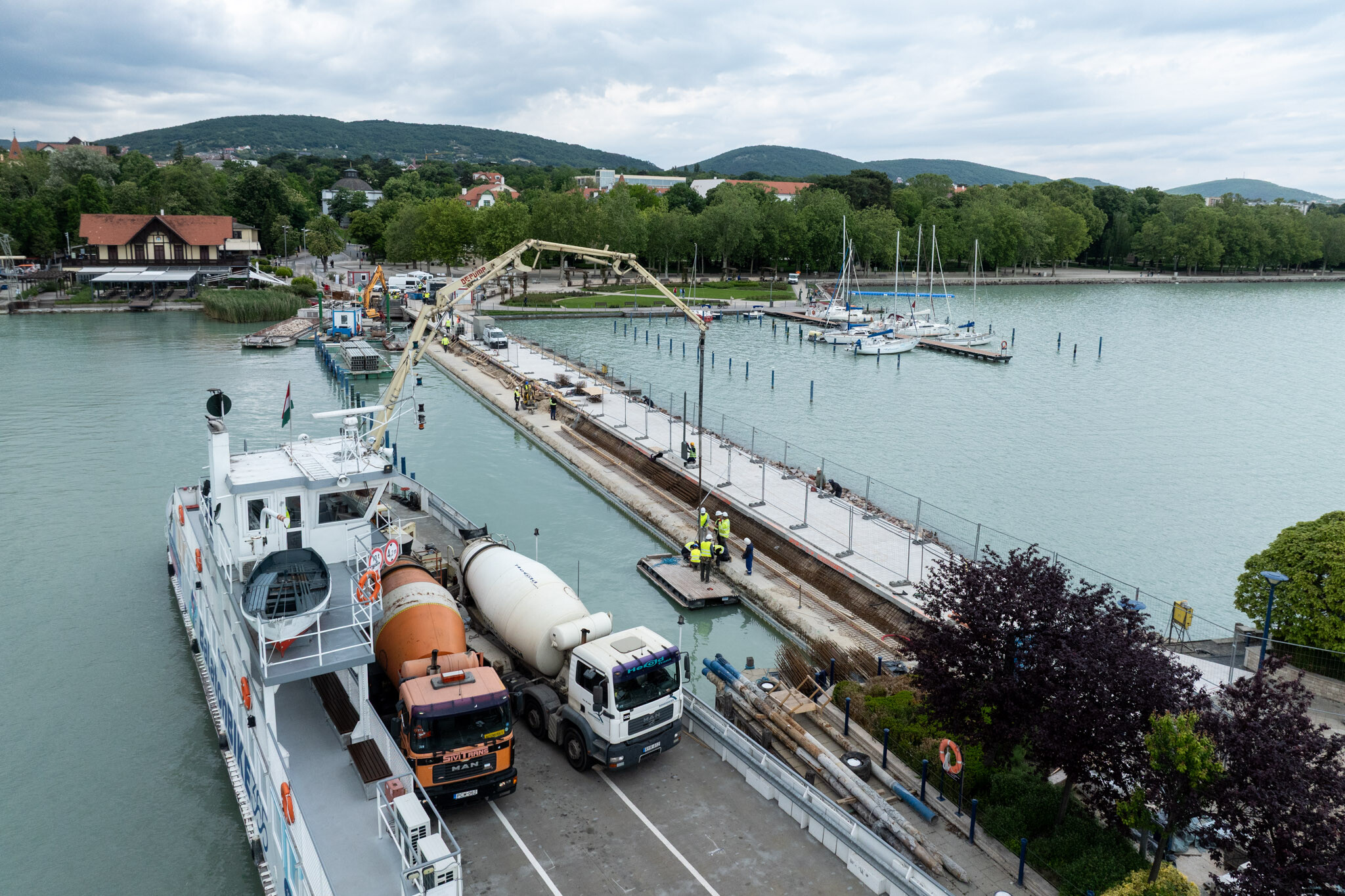 Szokatlan és különleges látvány volt a Balatonon haladó komp, amely fedélzetén két betonmixerrel és a betonpumpával hajózott be a balatonfüredi személyhajó kikötő felújításához. Sajátos megoldásokat követelt a kivitelezés, amelyet részletesen ismertetünk.