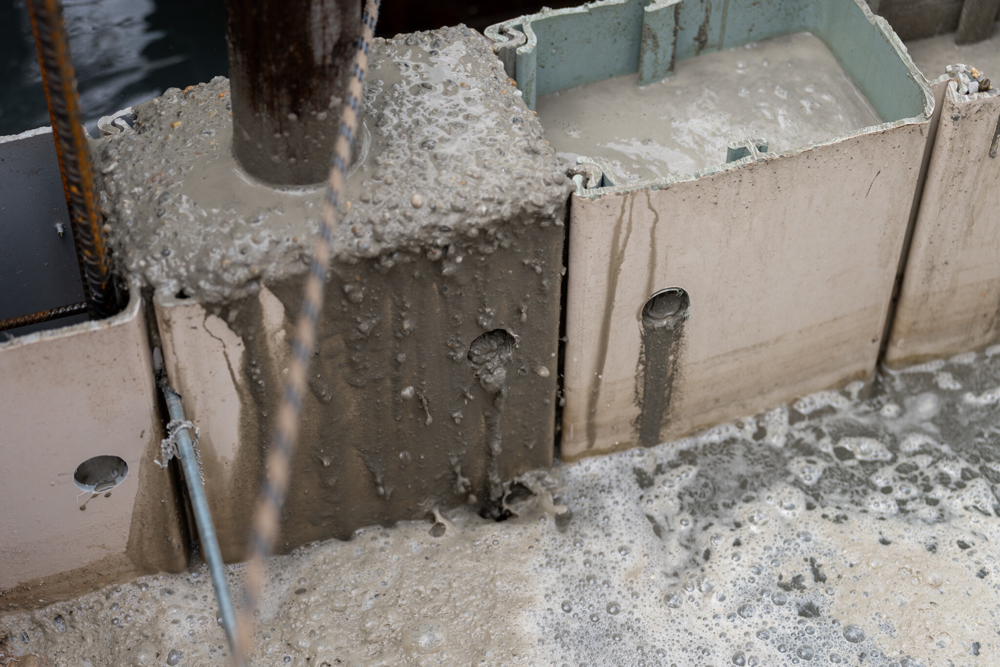 A betonozást emelt cementtartalmú víz alatti betonkeverékkel valósították meg. A szádlemezekbe betonpumpával és betonozócsővel juttatták el a betont. A munkafolyamat során a STRABAG egyik leányvállalatától, a TPA Kft. betontechnológusa folyamatosan a kompon tartózkodott és ellenőrizte a beton minőségét.