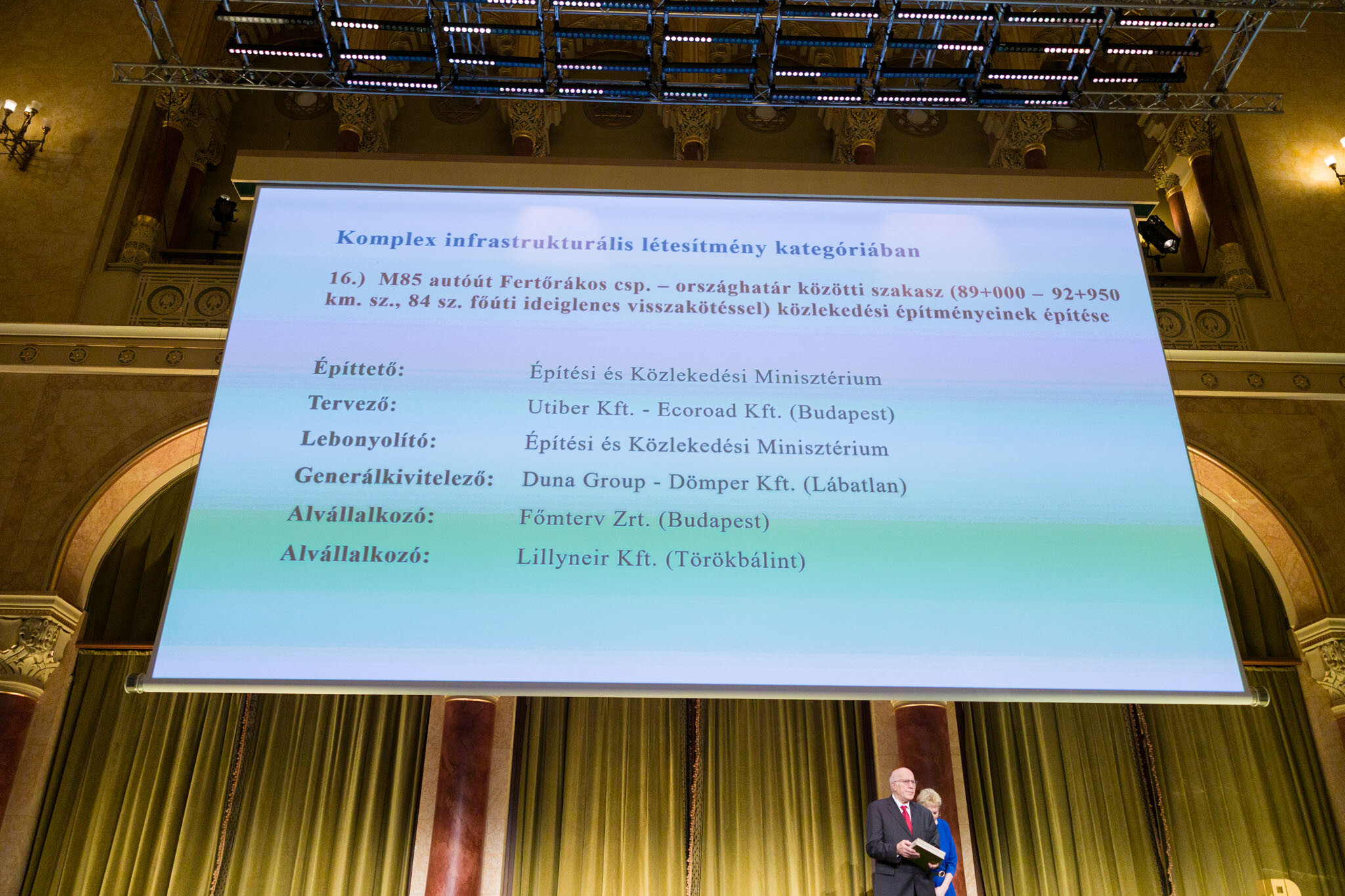 Előbbi beruházás a közlekedési létesítmény kategóriában Építőipari Nívódíjat, míg utóbbi infrastrukturális építmény kategóriában Elismerő Oklevelet nyert. Mindezeken túl Kerékgyártó Attila a Duna Grouphoz tartozó Dömper Kft. projektvezetője Építési Alkotói Díjat vehetett át a szóban forgó M85-ös szakasz közlekedési építményeinek építéséért felelős műszaki vezetőjeként.