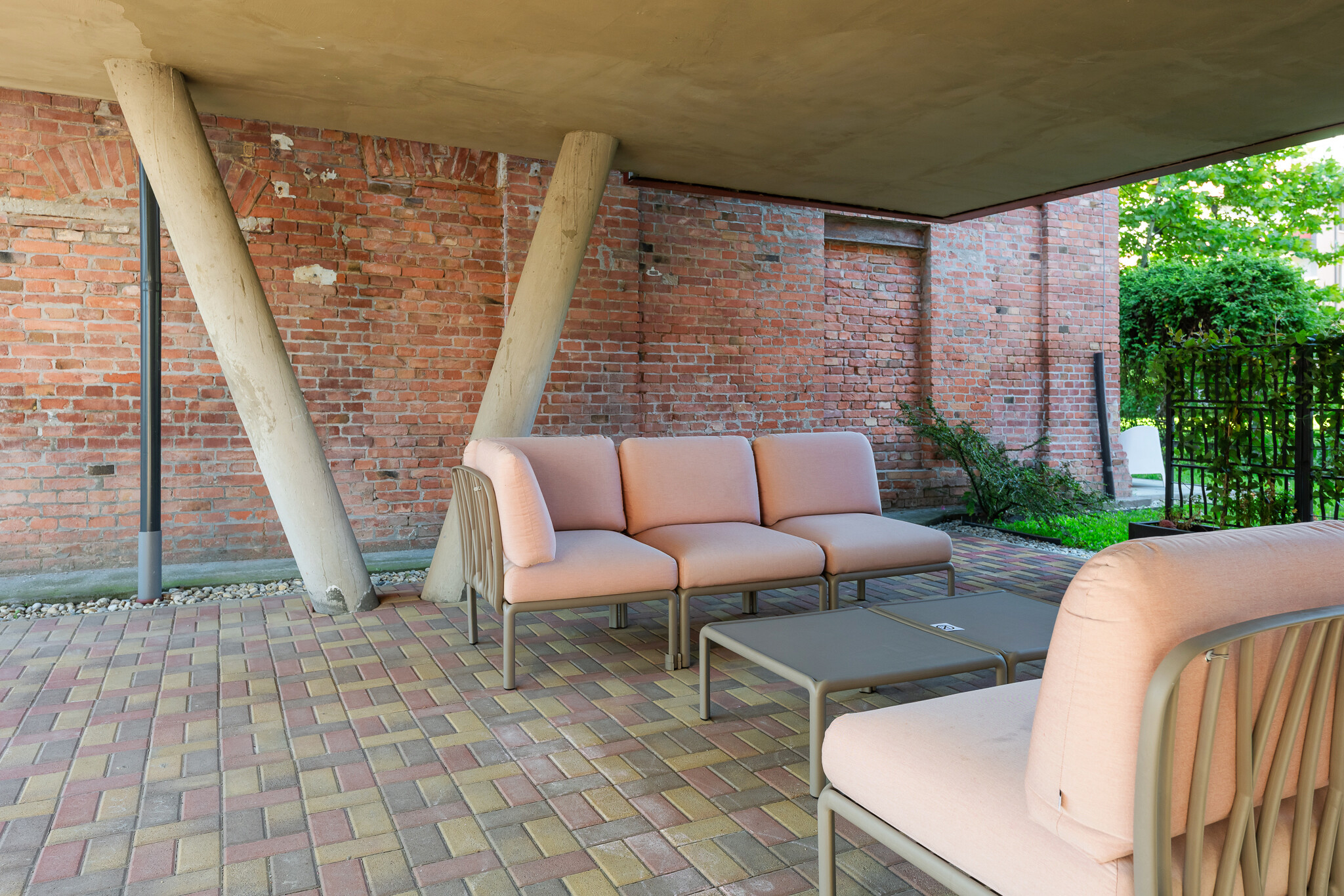 A loft hangulatú belső teret az indusztriális és vintage elemek, az eredeti téglaburkolat karaktere, valamint célzott akusztikai megoldások határozzák meg. A helyiség inspiráló művészeti elemekkel és egy karakteres, bárhangulatú, beépített konyhabútorral vált teljessé, amely a vendéglátási funkciókat is magas színvonalon támogatja. A fedett terasz moduláris kültéri bútorzata tovább erősíti a tér közösségi jellegét és az agilis elrendezést.