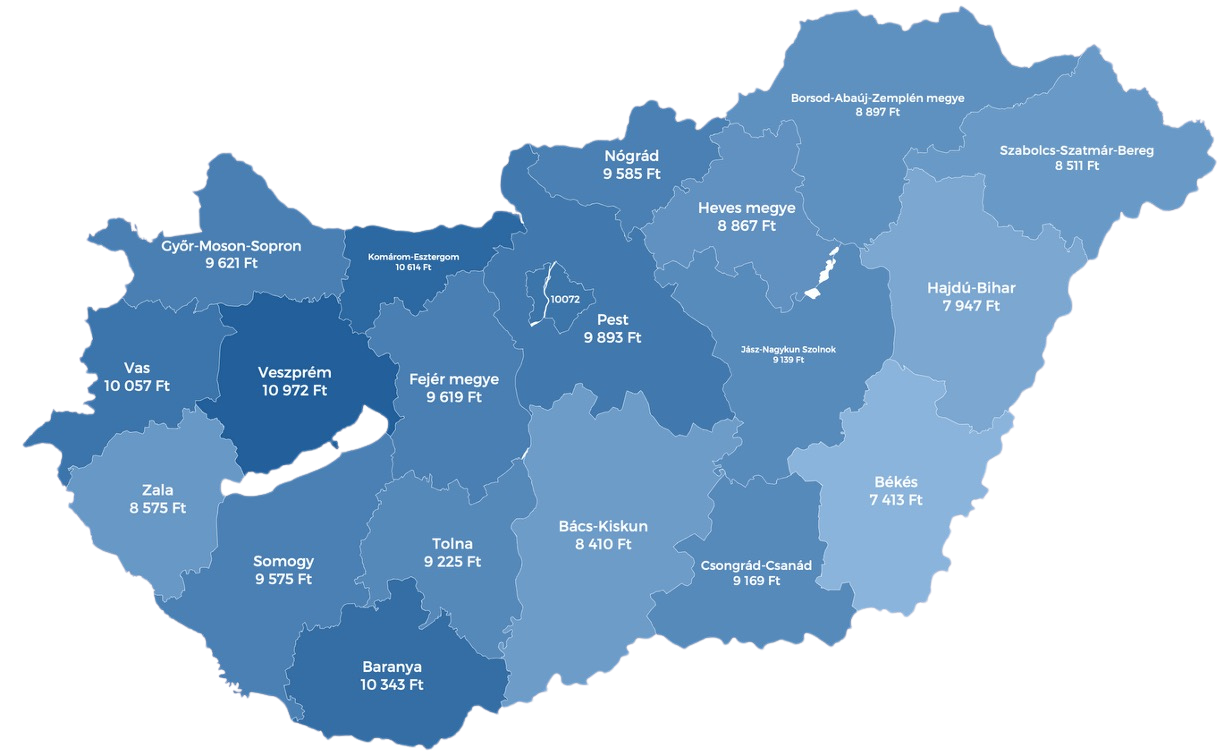 Megyei bontásban még nagyobb különbségek látszanak. A legmagasabb munkadíj Veszprém vármegyében figyelhető meg, ahol átlagosan 10 972 forintba kerül négyzetméterenként a szakipari kivitelezés. Szintén magasak az árak Komárom-Esztergom (10 614 Ft), Baranya (10 343 Ft) és Budapest (10 072 Ft) esetében.