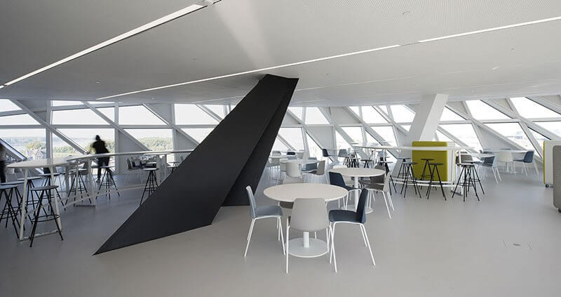 A régi épületrészben kaptak helyet az ügyfélfogadó irodák, tárgyalók és a könyvtár, az új egységben pedig – amely panorámaliftekkel érhető el a központi udvarból – a 90 férőhelyes auditórium, konferenciaterem és a panorámaétterem mellett open office rendszerű irodák helyezkednek el. A komplexumhoz 190 bicikliparkoló és 25 elektromos autó parkoló tartozik.