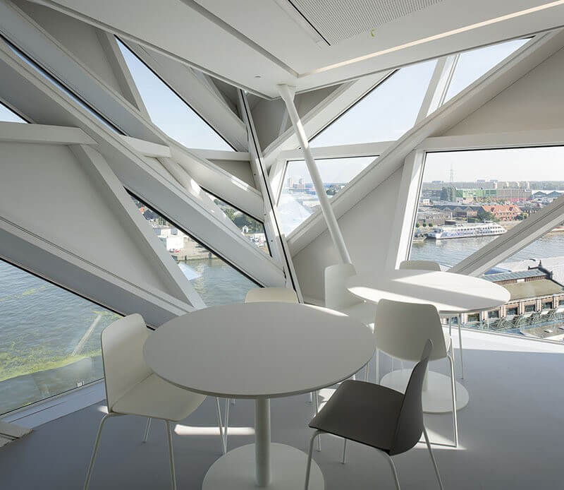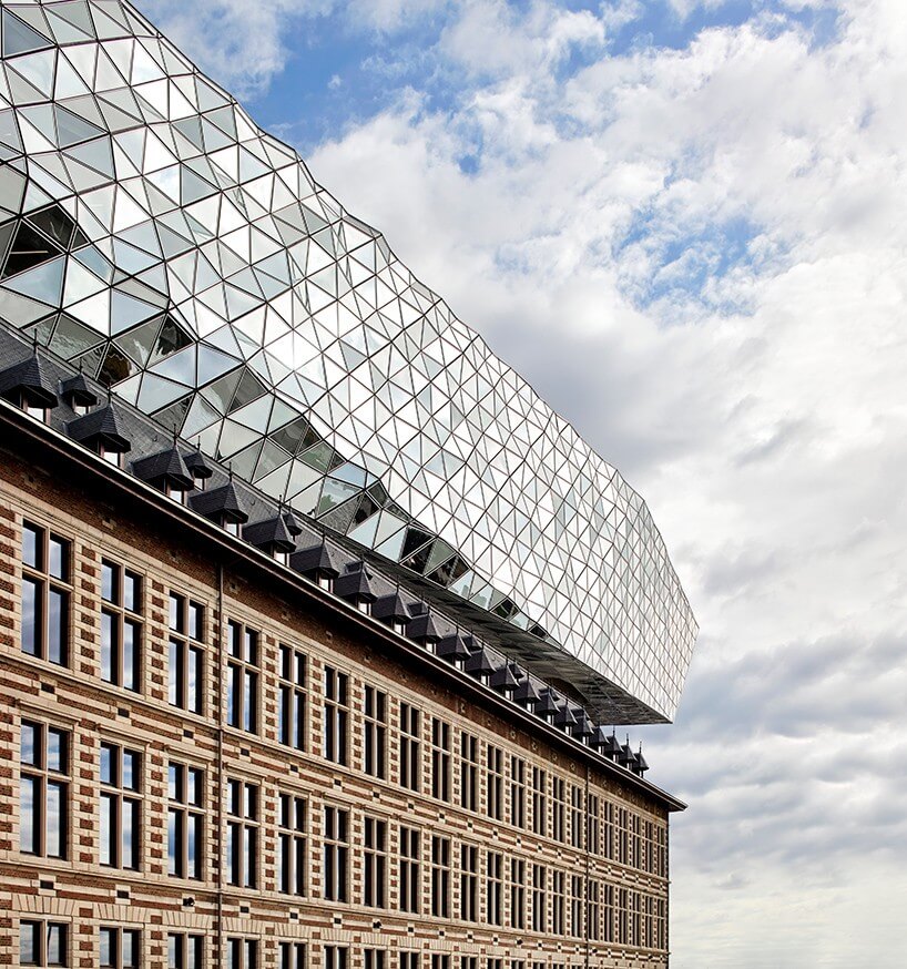 Az acél és üveg homlokzat – melyet lapos, háromszög alakú panelekből illesztettek össze, helyenként mégis hullámzó hatású – az észak-belgiumi kereskedőváros szimbólumává vált gyémántkereskedelmet idézi. A háromszögek nagy része átlátszó, az átlátszatlanokkal pedig a bejutó fény mennyiségét tudták szabályozni. Ezáltal az épület kívülről az adott napszak fényeitől függően más-más látványt nyújt.