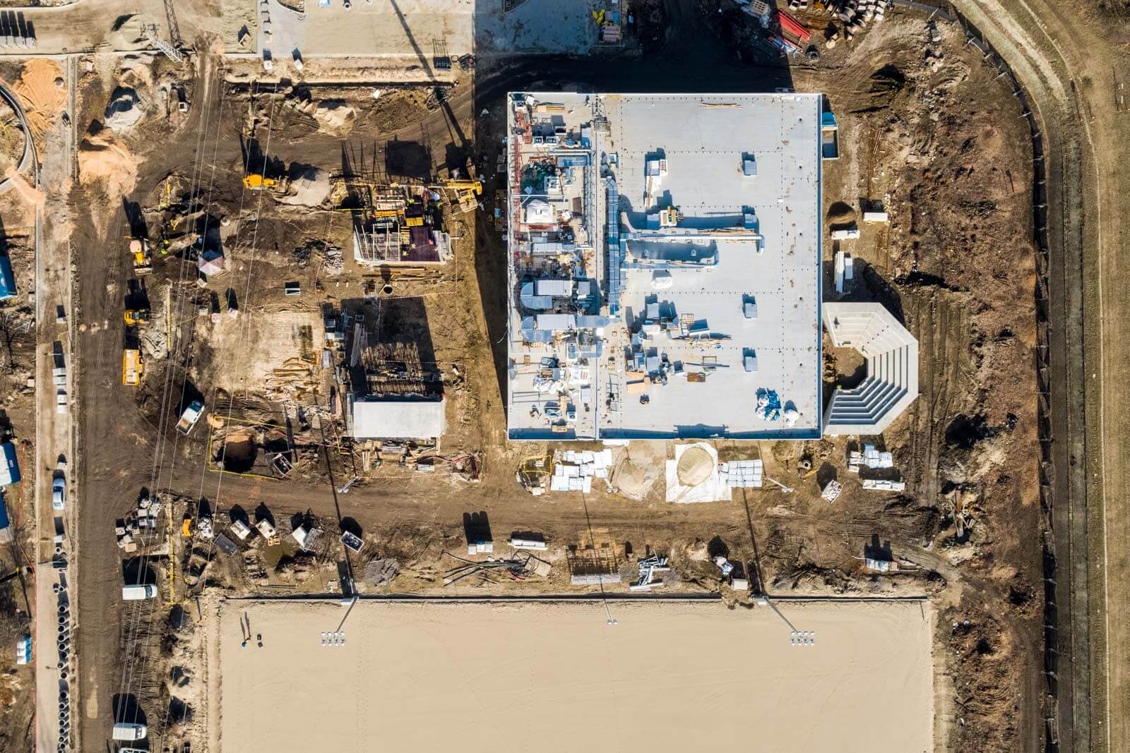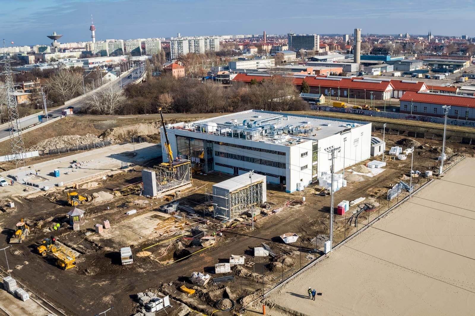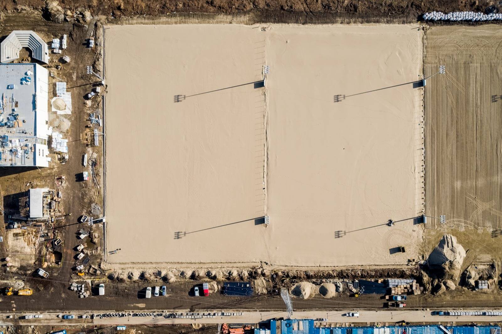 A rendezvénycsarnok építése már a stadionnál is előrébb tartott februárban: idén megkezdődtek a befejező munkák. A kiegészítő létesítmények is jól állnak: folyik a pályák építése, készül az utak és járdák burkolata.