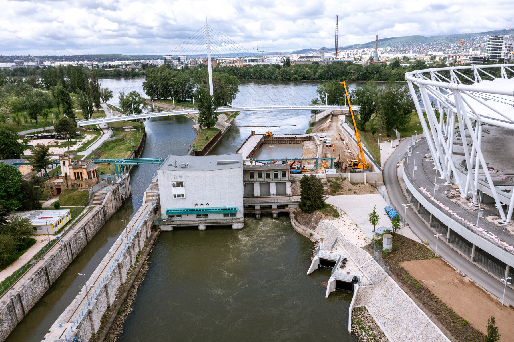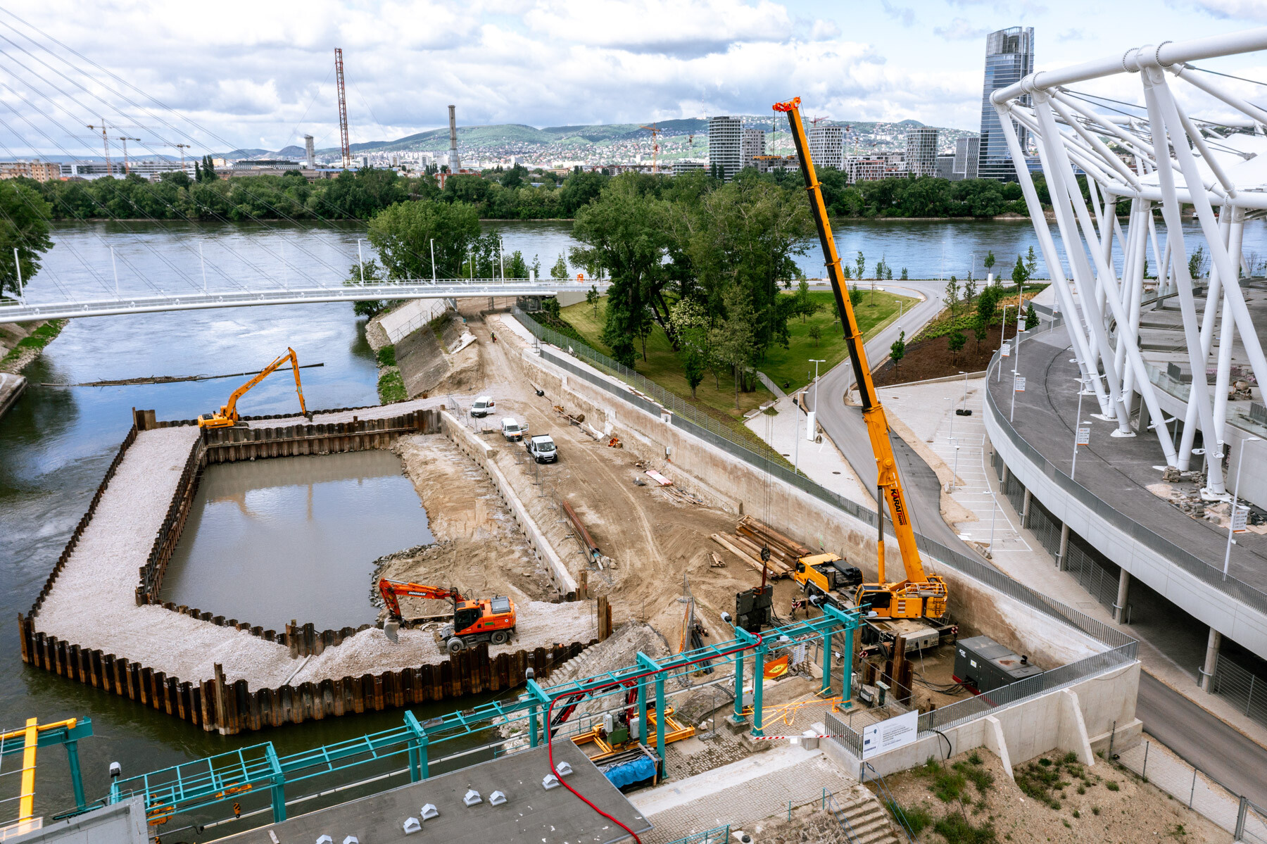 További kihívás volt, hogy a munkaterület a sportlétesítmény szomszédságában volt, amit az építési forgalom csak a stadionon keresztül tudott megközelíteni. Az utolsó, vízparthoz vezető szakaszt helyhiány miatt, ráadásul kizárólag tolatva közelíthették meg a járművek. Az egyik legnagyobb ezek közül egy 250 tonnás autódaru volt, ami hátramenetben a két falszakasz között 10-10 centiméteres eltartással jutott le a munkálatok helyszínére. Az atlétikai stadion térköves útjait az építési forgalom terhelésétől 10 cm teherelosztó és 6 centiméteres aszfaltréteggel védték meg.