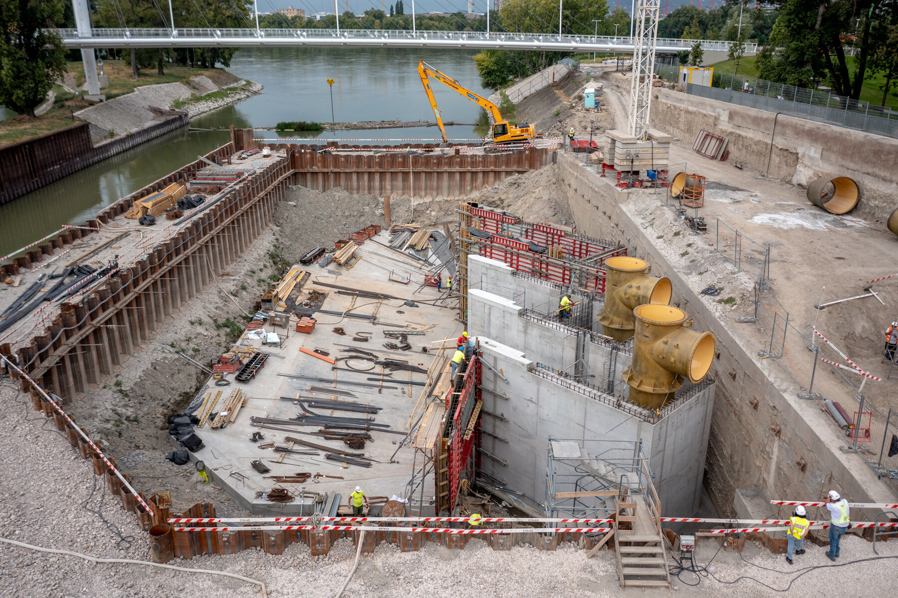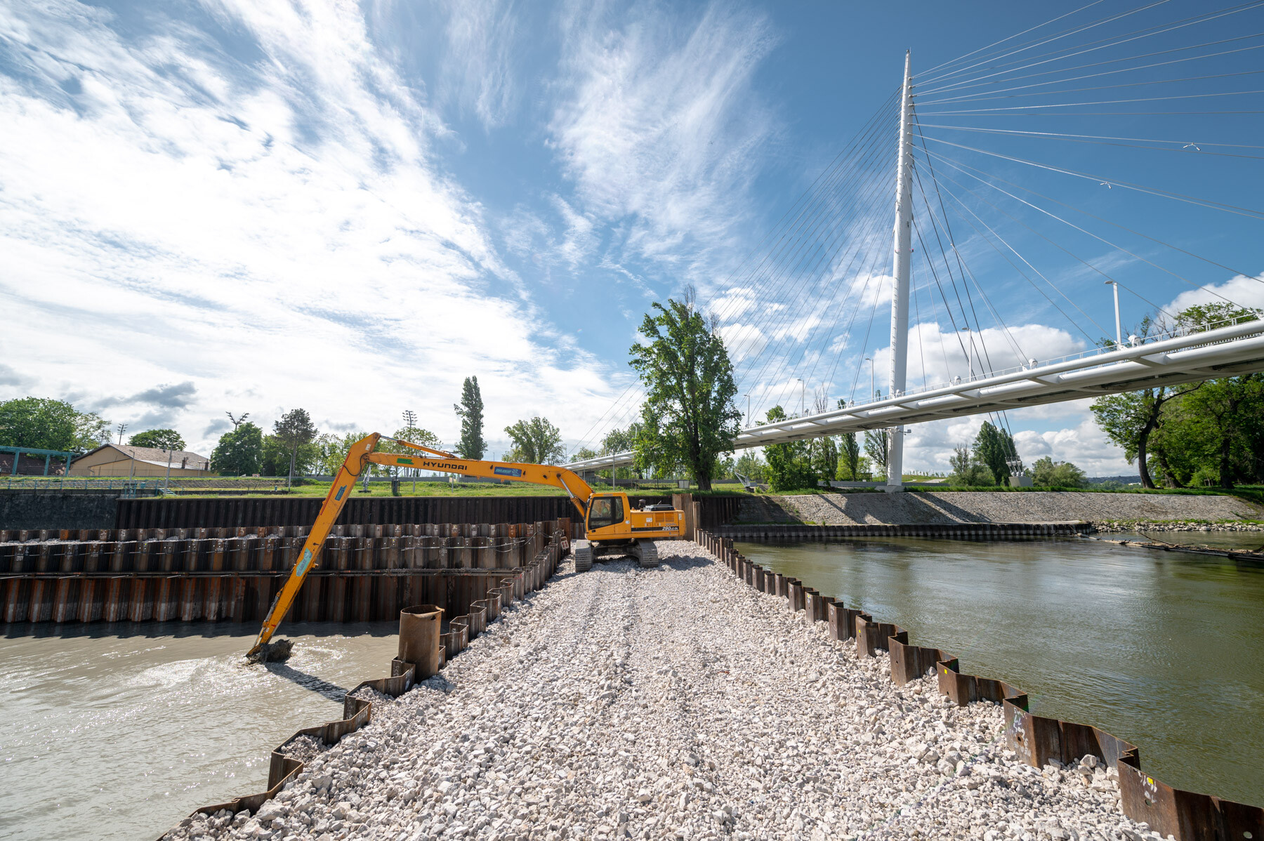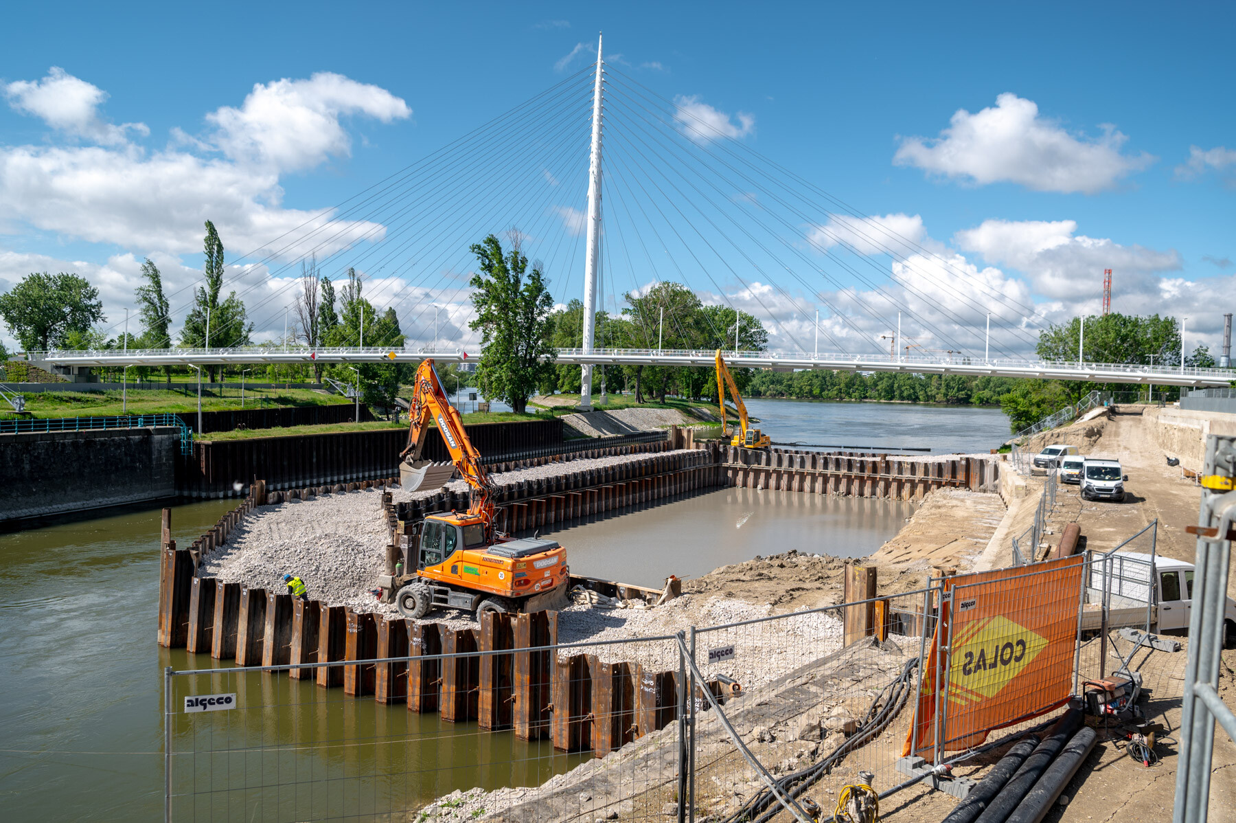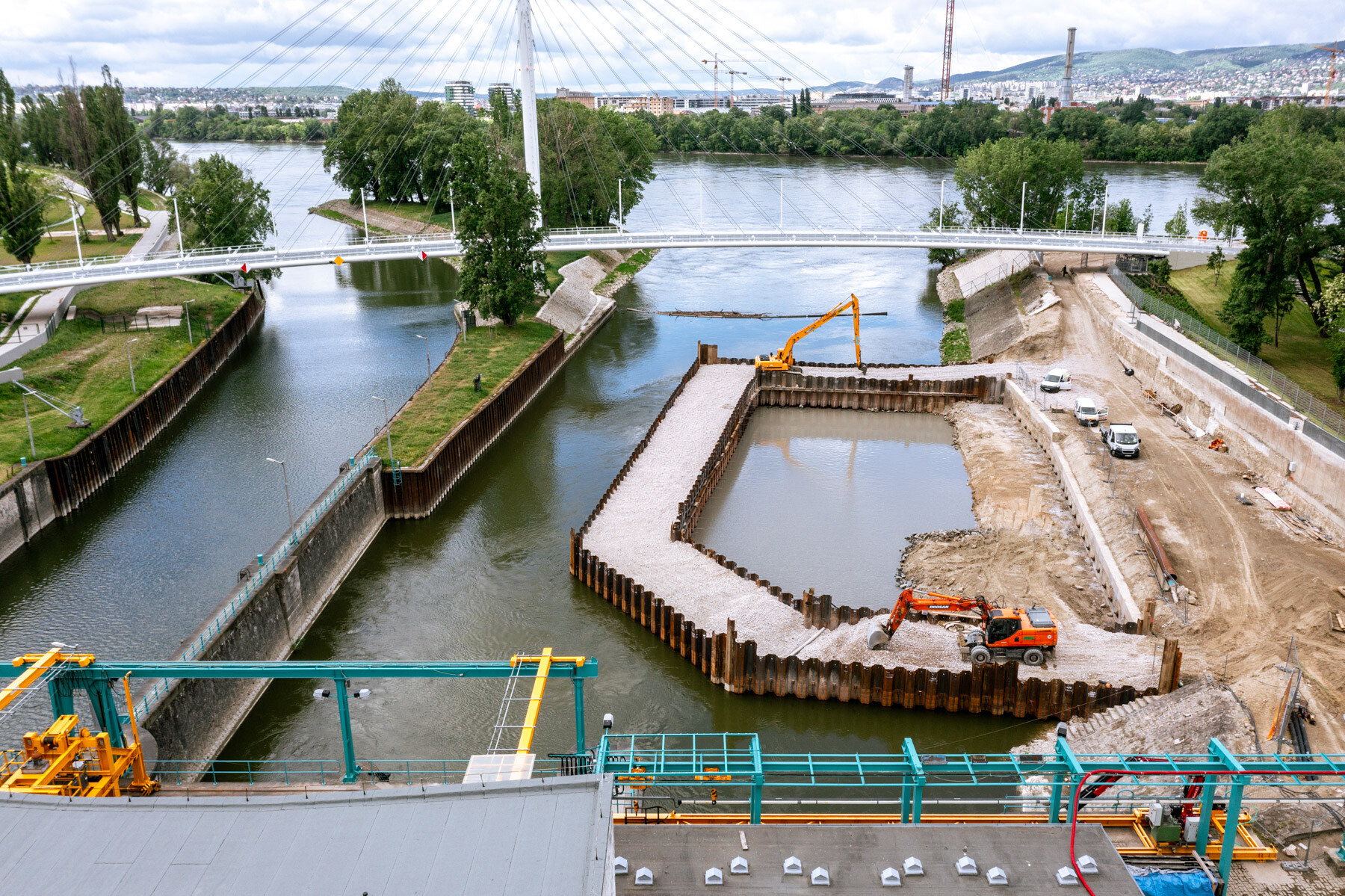 A munkaterület kialakításához a folyómeder egy részét szádlemezekkel lehatárolták, ehhez a fázishoz egy 80 méter széles és 100 méter hosszú úszóbárka érkezett a mellékágba a fedélzetén két, összesen 130 tonna súlyú munkagéppel.