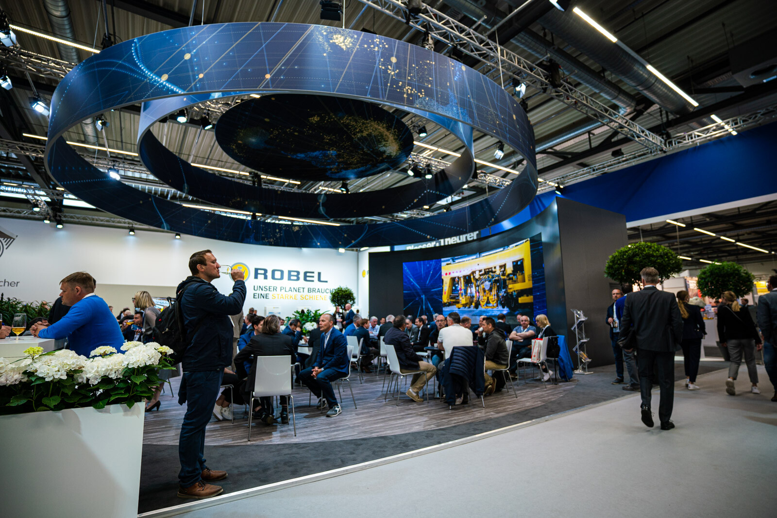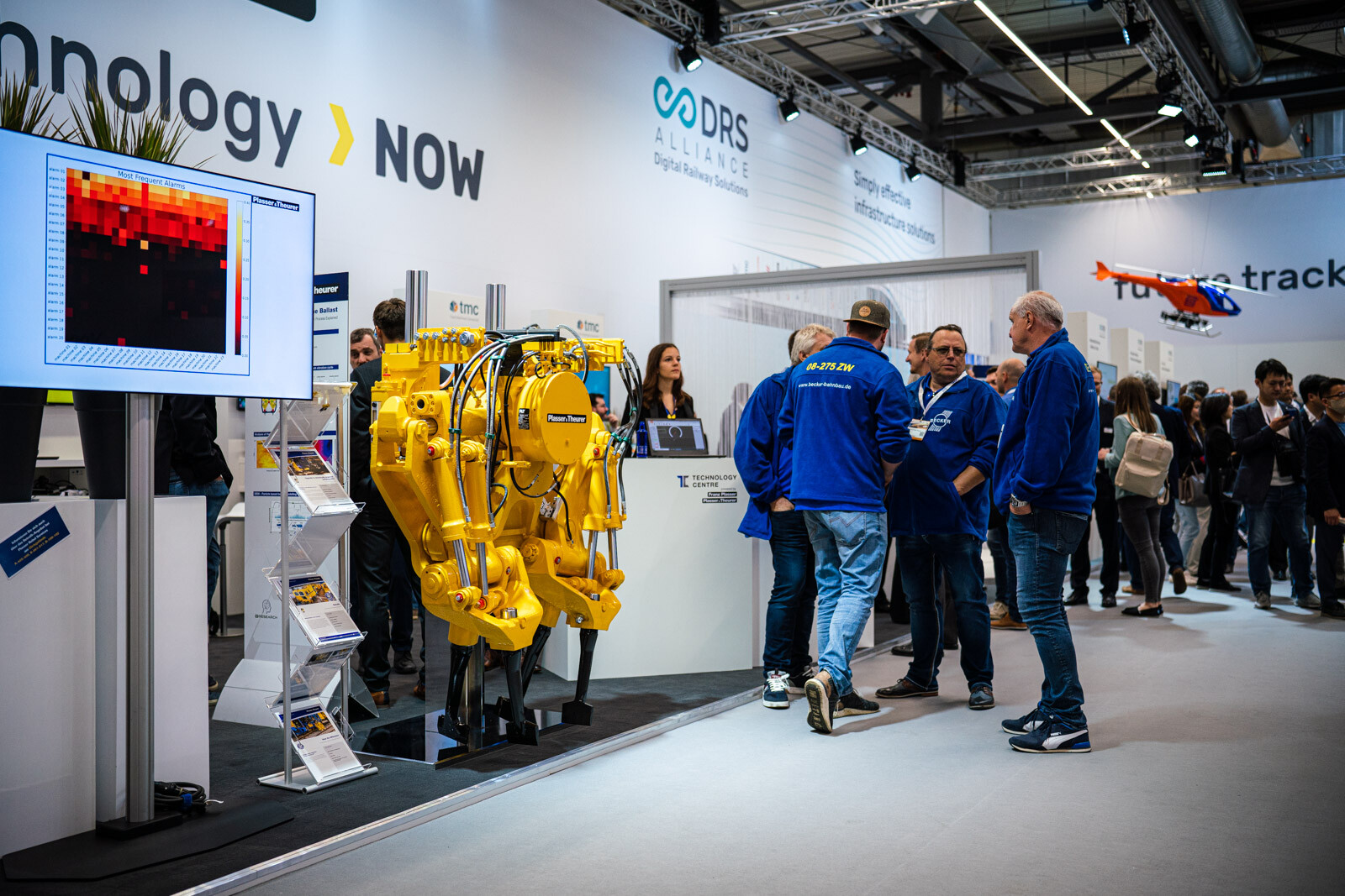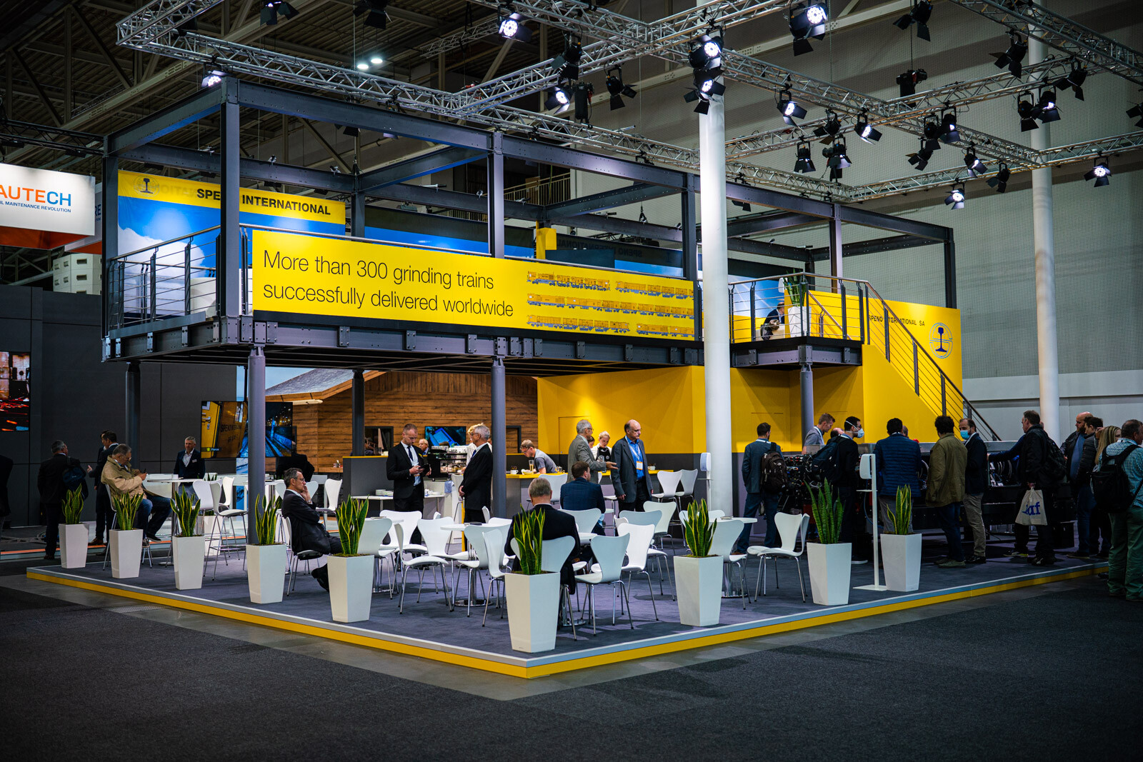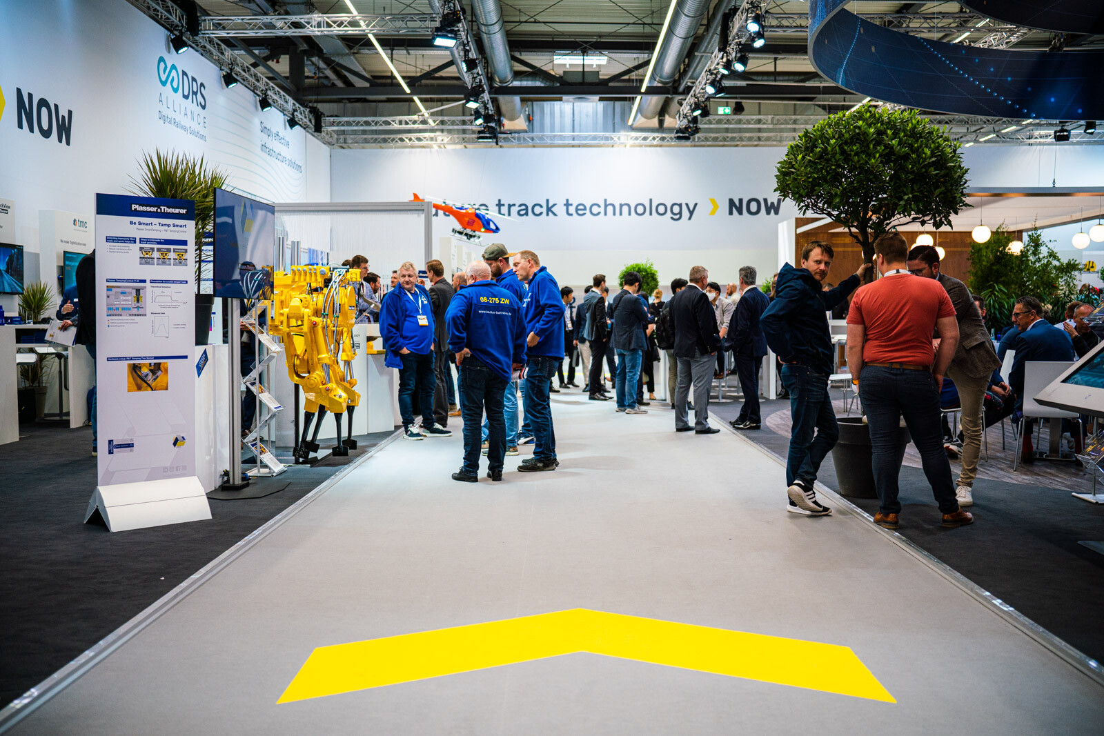 A Plasser & Theurer pályaépítőgép-ágazatban vezető szerepét az is aláhúzta, hogy a két fedett csarnokból az egyiknek a felét a cég különböző termékeit bemutató standjai, dedikált tárgyalótermei és saját kávézója foglalta el. 3D-s szemüvegen lehetett követni a technológiai bemutatókat, a tér középpontját elfoglaló hatalmas képernyőn pedig átlagosan 2-3 percenként ismétlődve lehetett látni a V-Híd SMD 80 / UVP 2002-as gépláncának karbantartási munkáit is, melyeket a Plasser & Theurer végzett el.