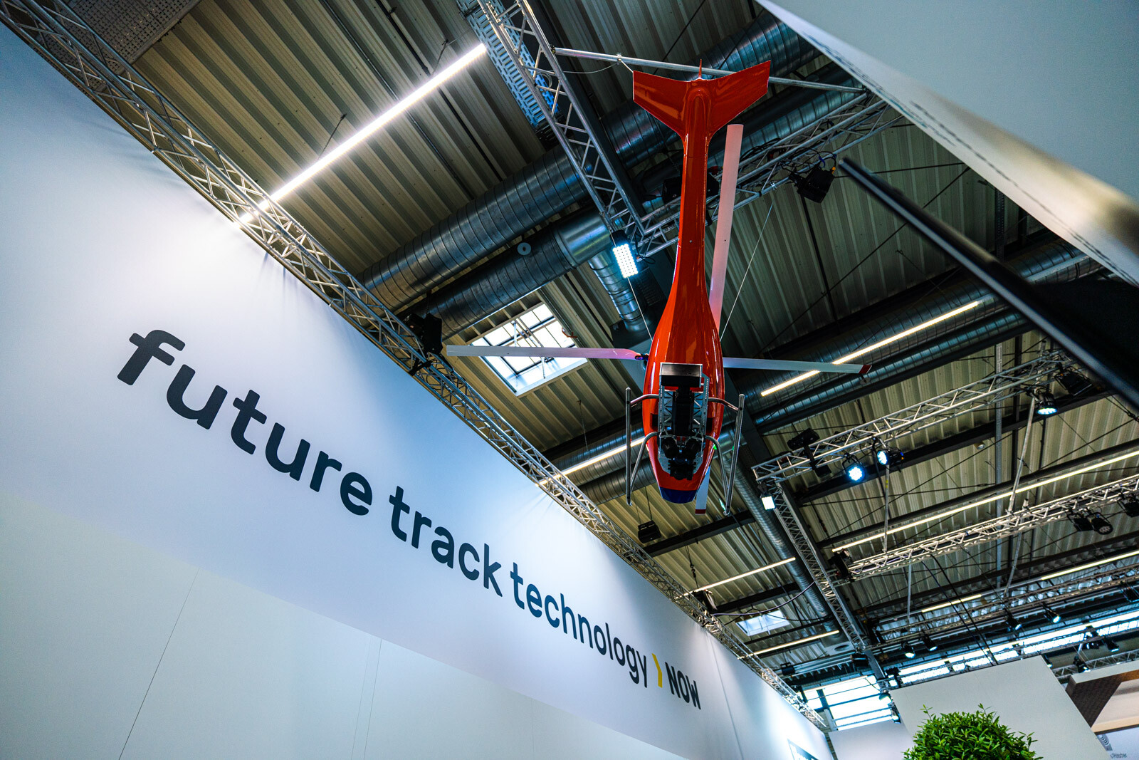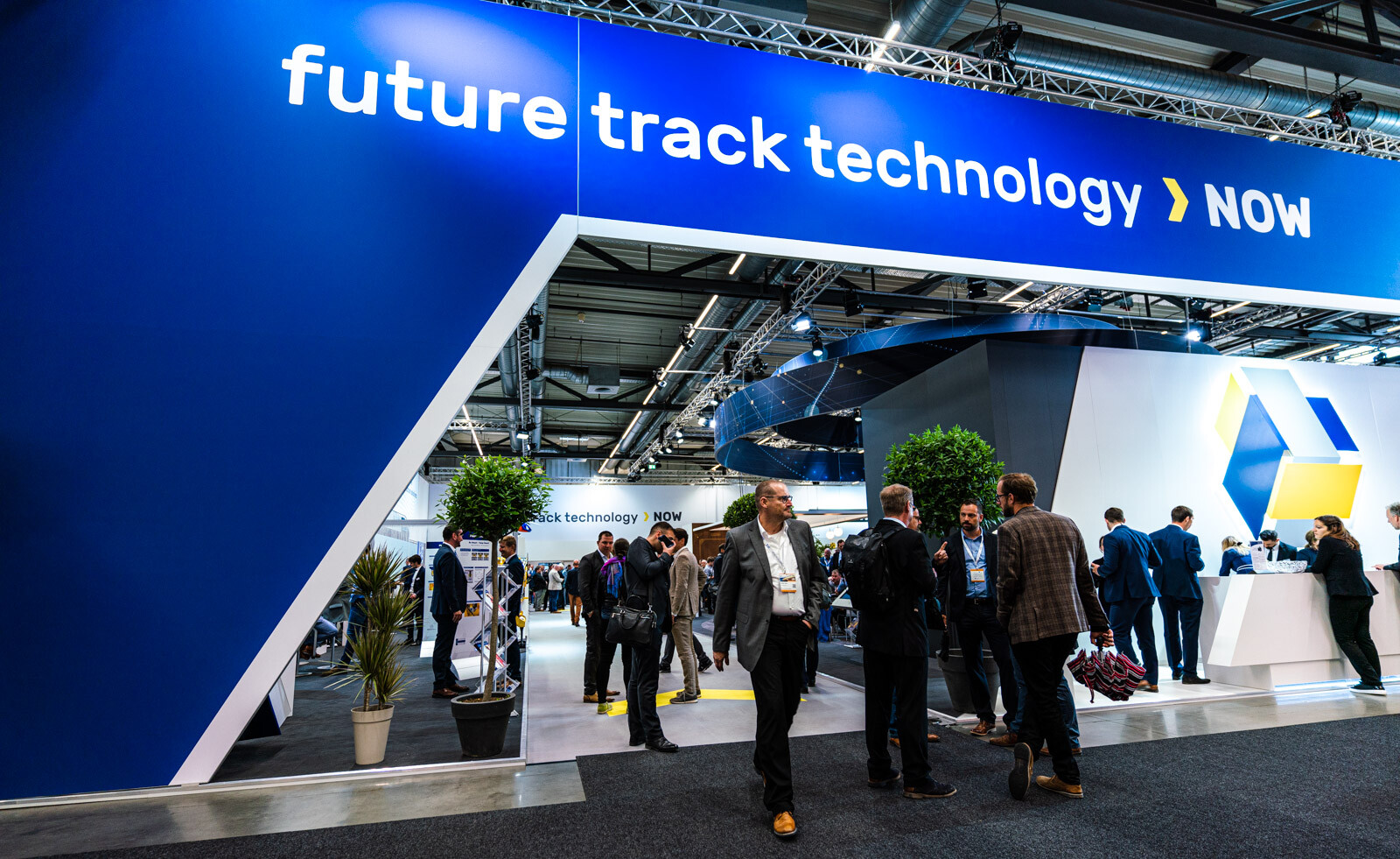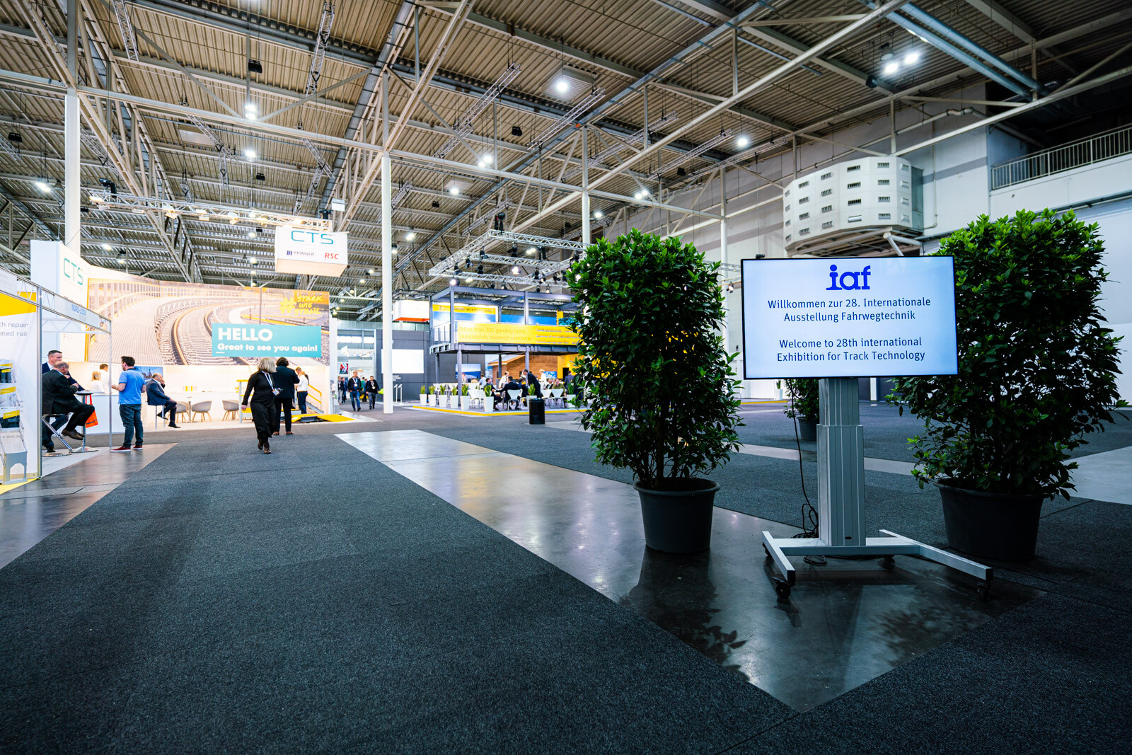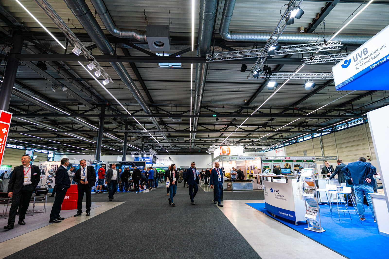 A Plasser & Theurer pályaépítőgép-ágazatban vezető szerepét az is aláhúzta, hogy a két fedett csarnokból az egyiknek a felét a cég különböző termékeit bemutató standjai, dedikált tárgyalótermei és saját kávézója foglalta el. 3D-s szemüvegen lehetett követni a technológiai bemutatókat, a tér középpontját elfoglaló hatalmas képernyőn pedig átlagosan 2-3 percenként ismétlődve lehetett látni a V-Híd SMD 80 / UVP 2002-as gépláncának karbantartási munkáit is, melyeket a Plasser & Theurer végzett el.