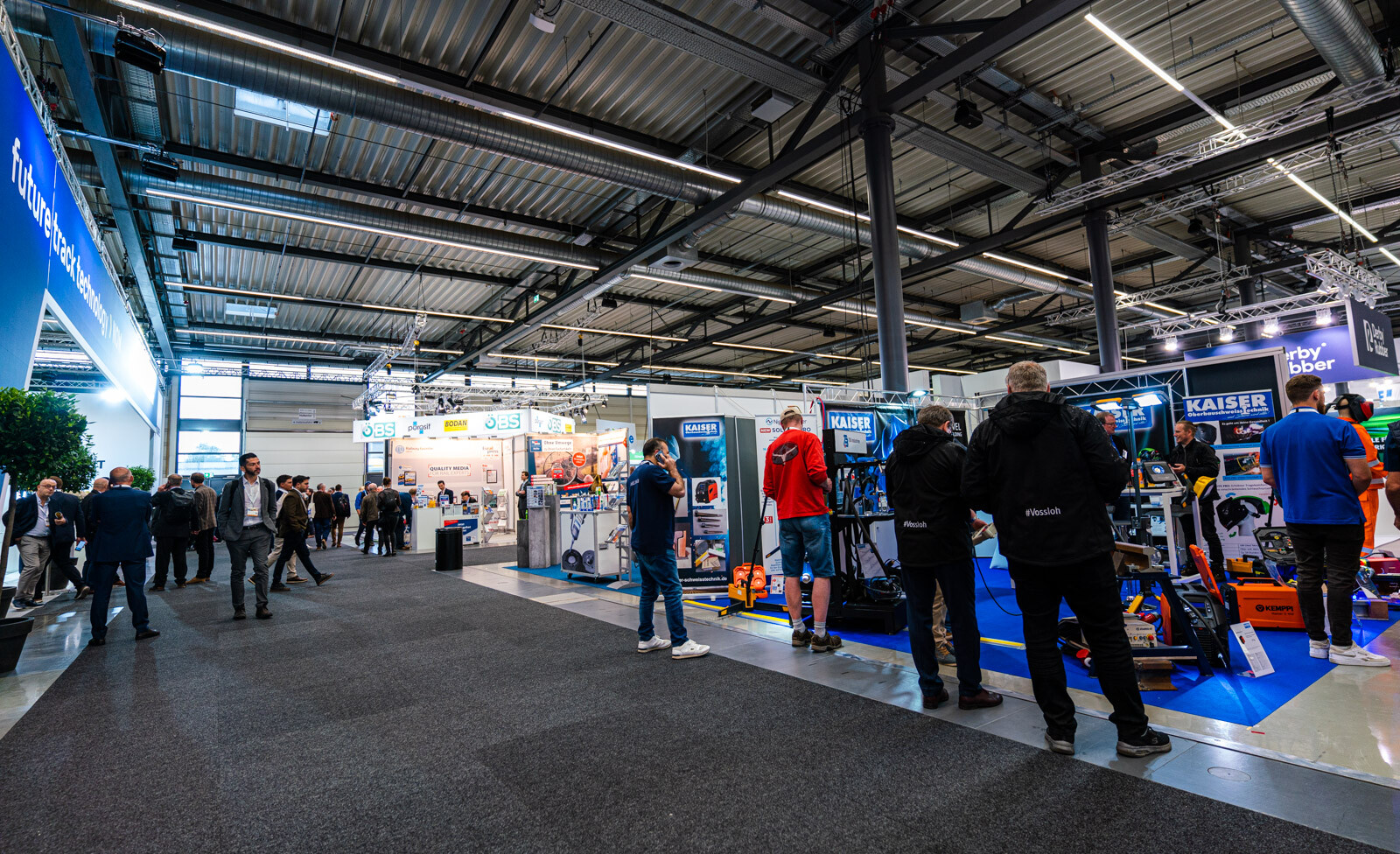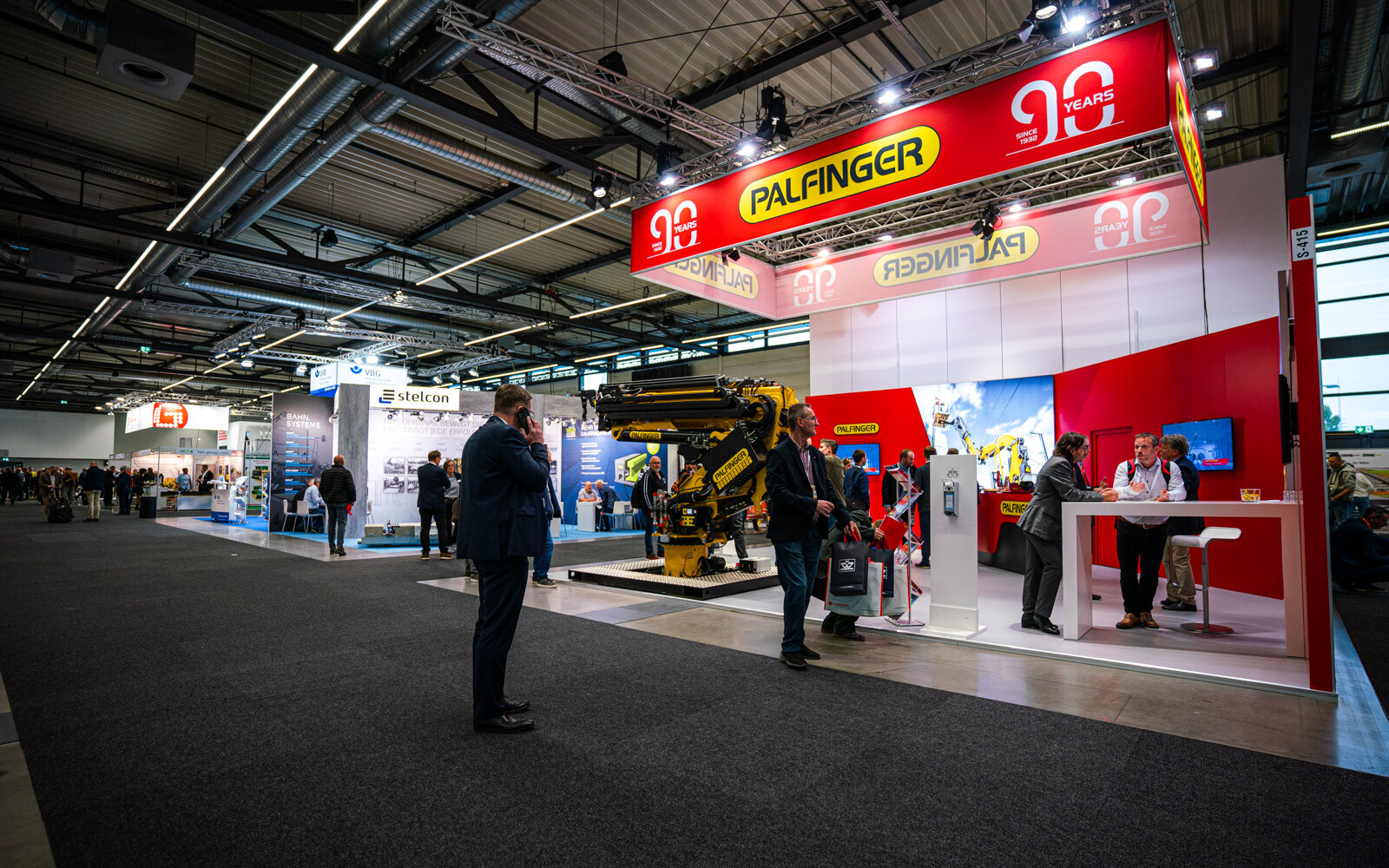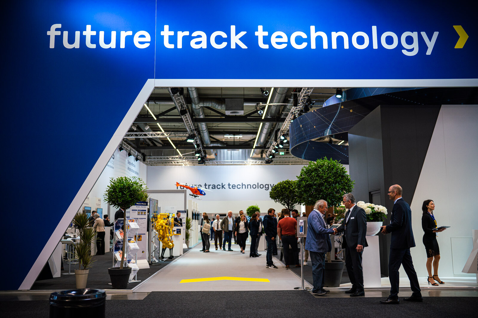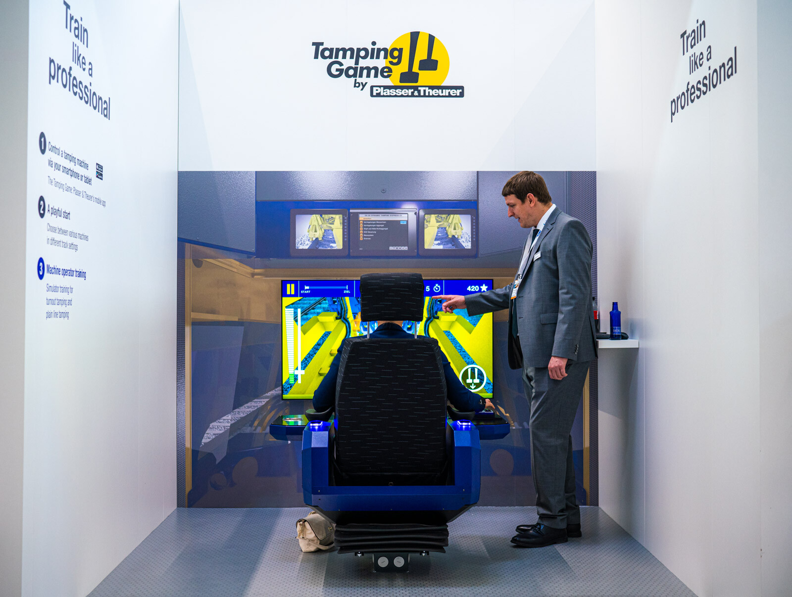 A Plasser & Theurer pályaépítőgép-ágazatban vezető szerepét az is aláhúzta, hogy a két fedett csarnokból az egyiknek a felét a cég különböző termékeit bemutató standjai, dedikált tárgyalótermei és saját kávézója foglalta el. 3D-s szemüvegen lehetett követni a technológiai bemutatókat, a tér középpontját elfoglaló hatalmas képernyőn pedig átlagosan 2-3 percenként ismétlődve lehetett látni a V-Híd SMD 80 / UVP 2002-as gépláncának karbantartási munkáit is, melyeket a Plasser & Theurer végzett el.