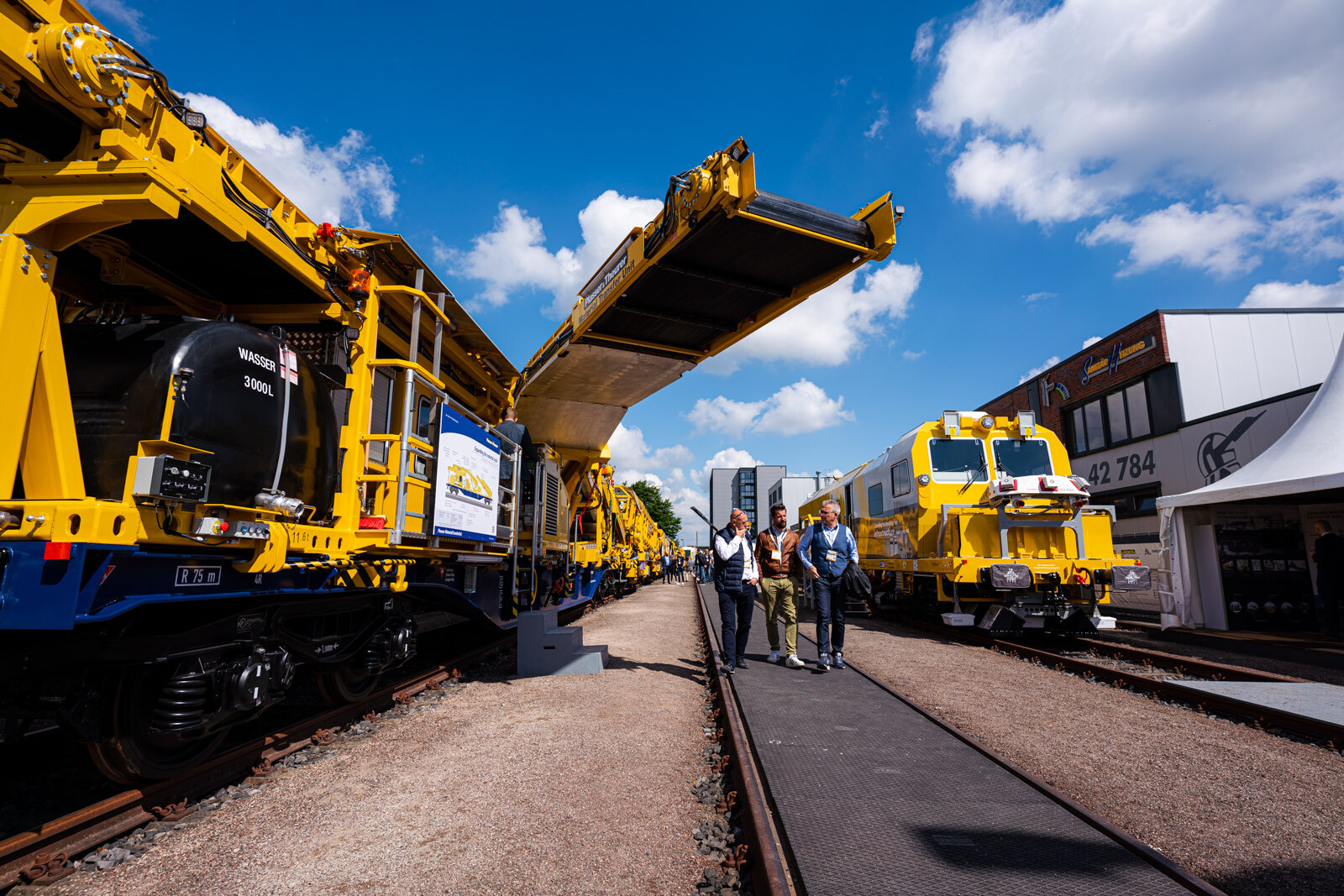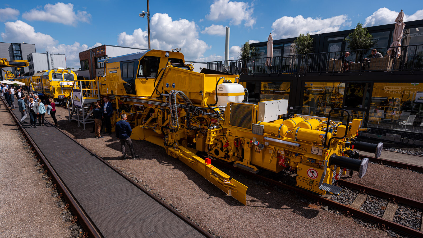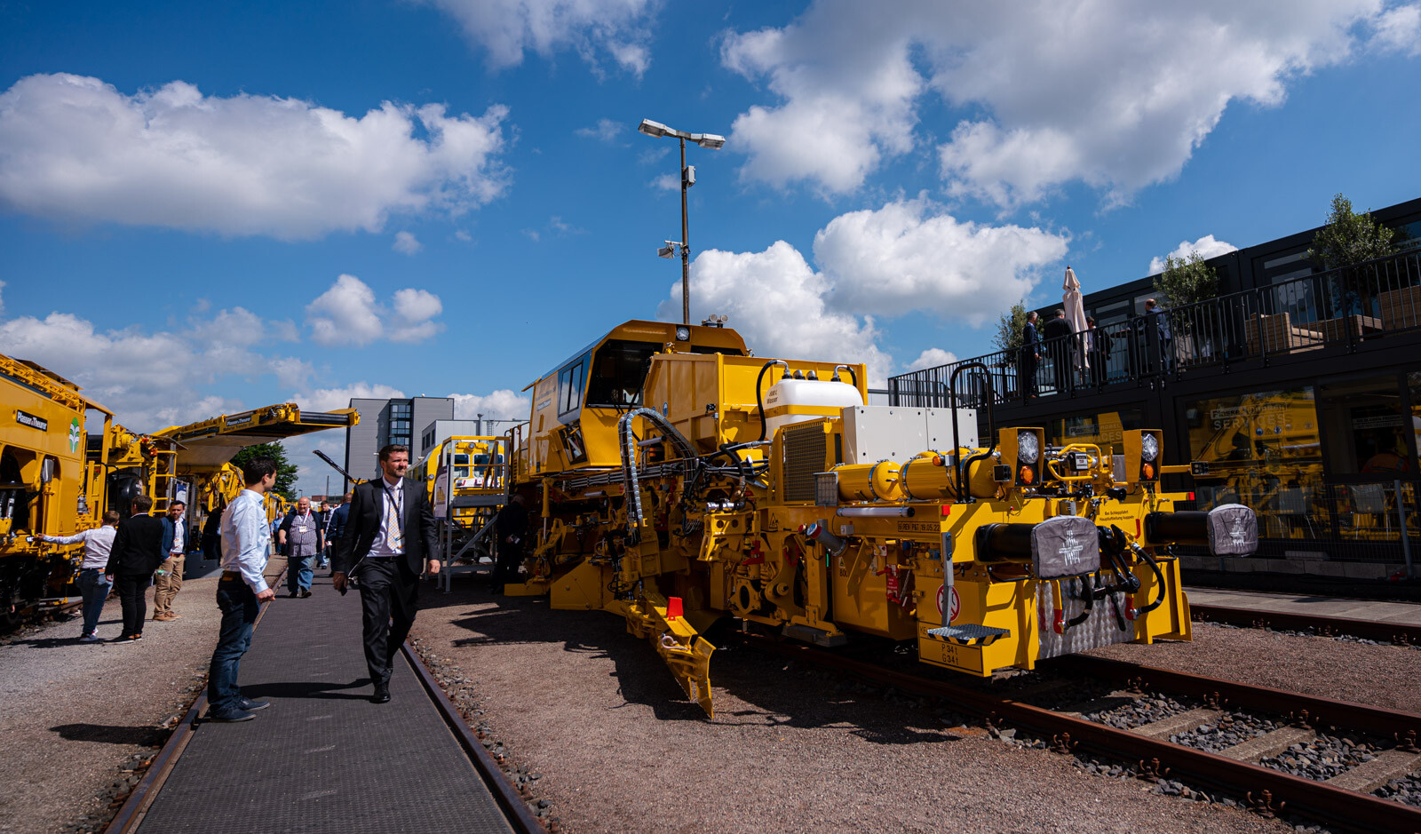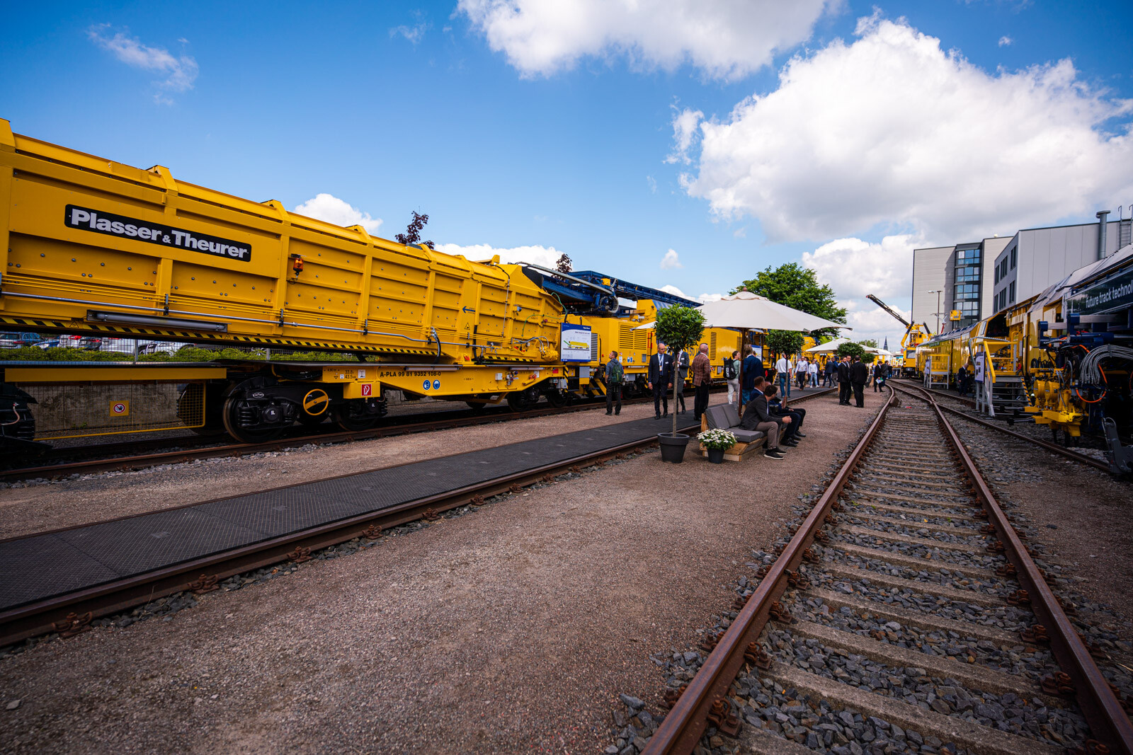 A külső vágányokon pedig a kiállítók közül a legnagyobb flottával: 19 óriás vasúti karbantartógéppel vonult fel a cég. Közöttük egy több mint 100 méter hosszú, a vasútkarbantartás (és akár vasútépítés) minden funkciójára alkalmas moduláris szerelvénnyel demonstrálta kapacitásait a vasúti seregszemlén az osztrák konszern.