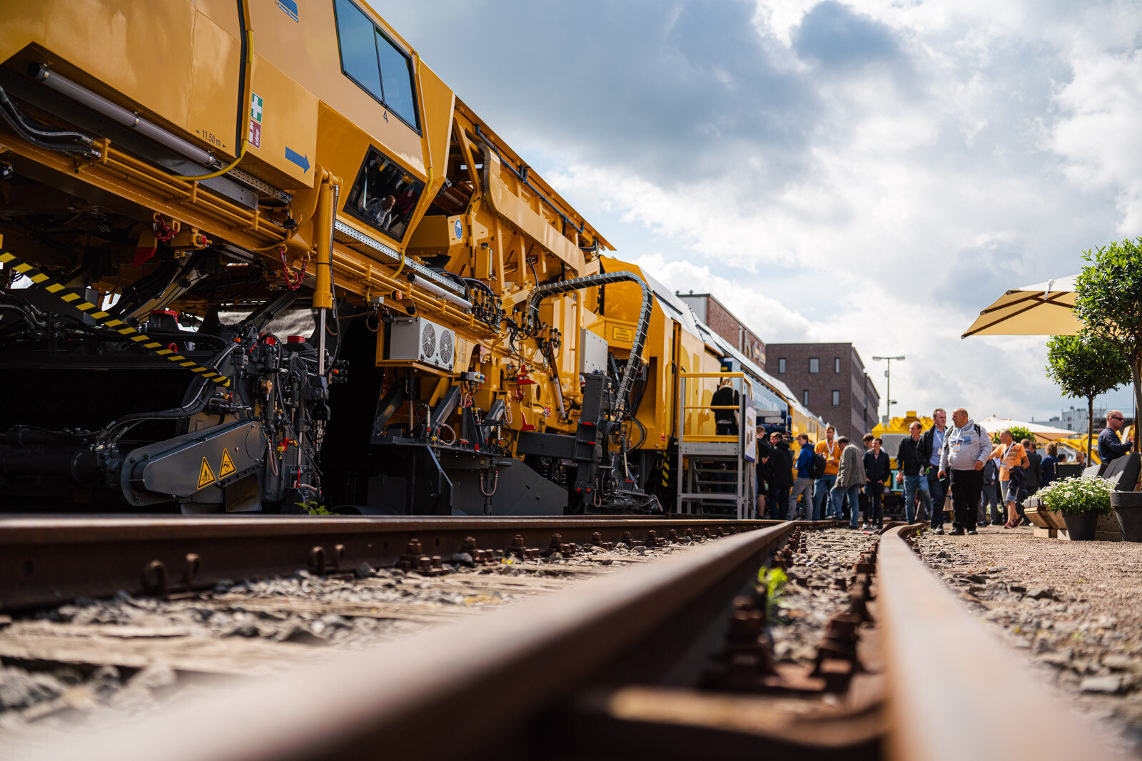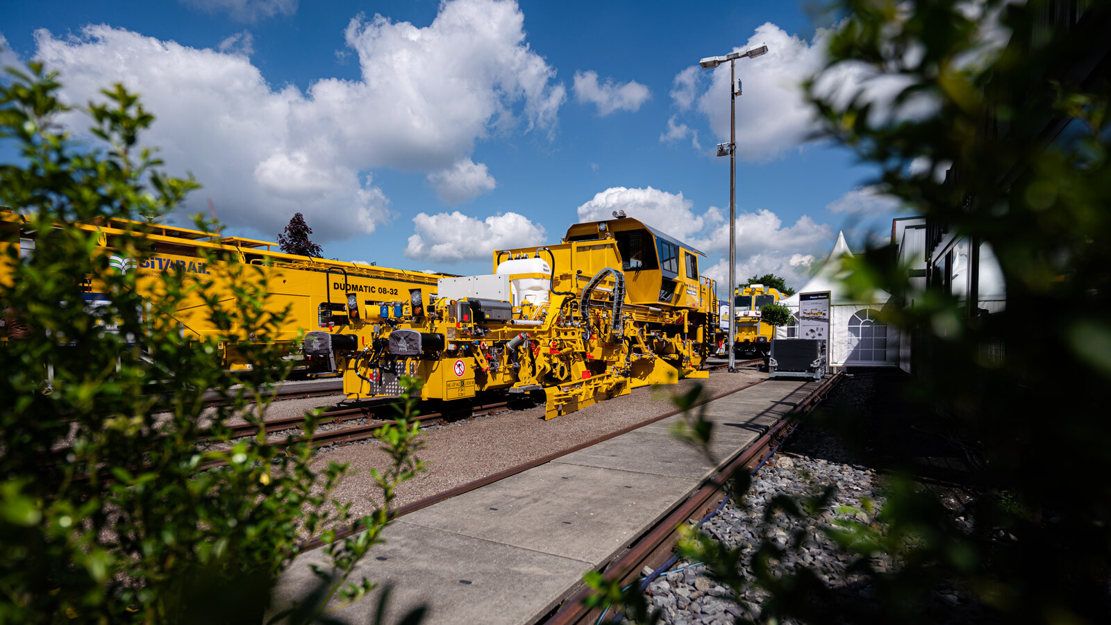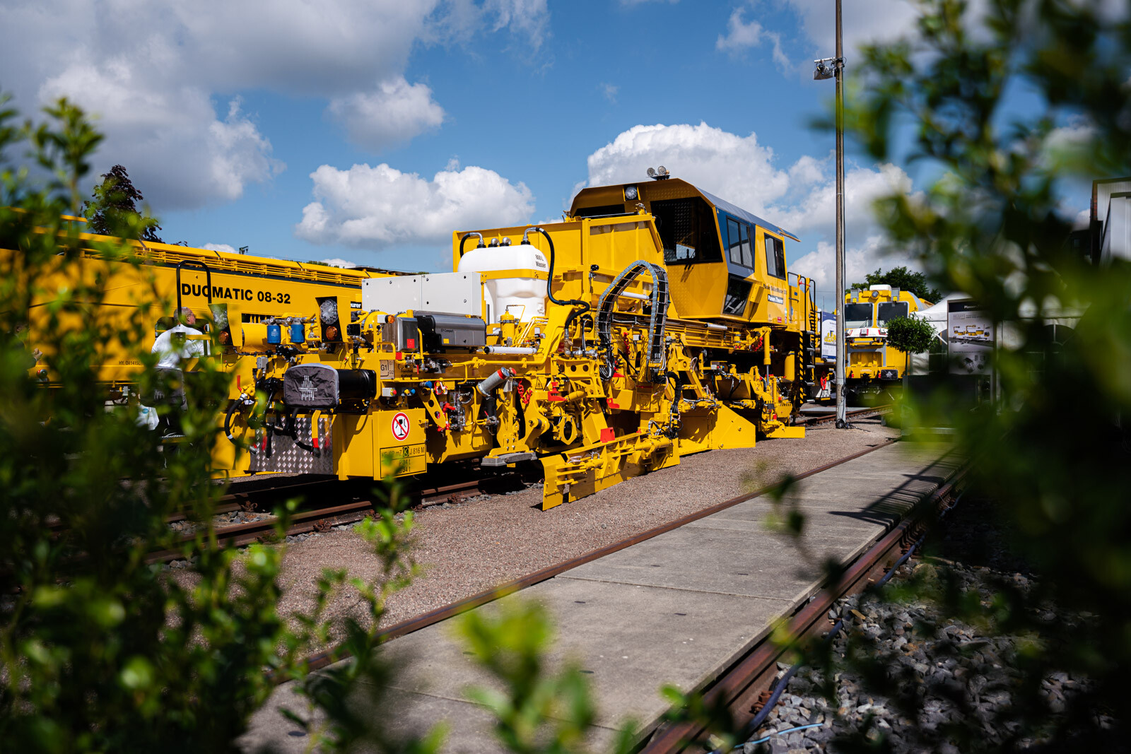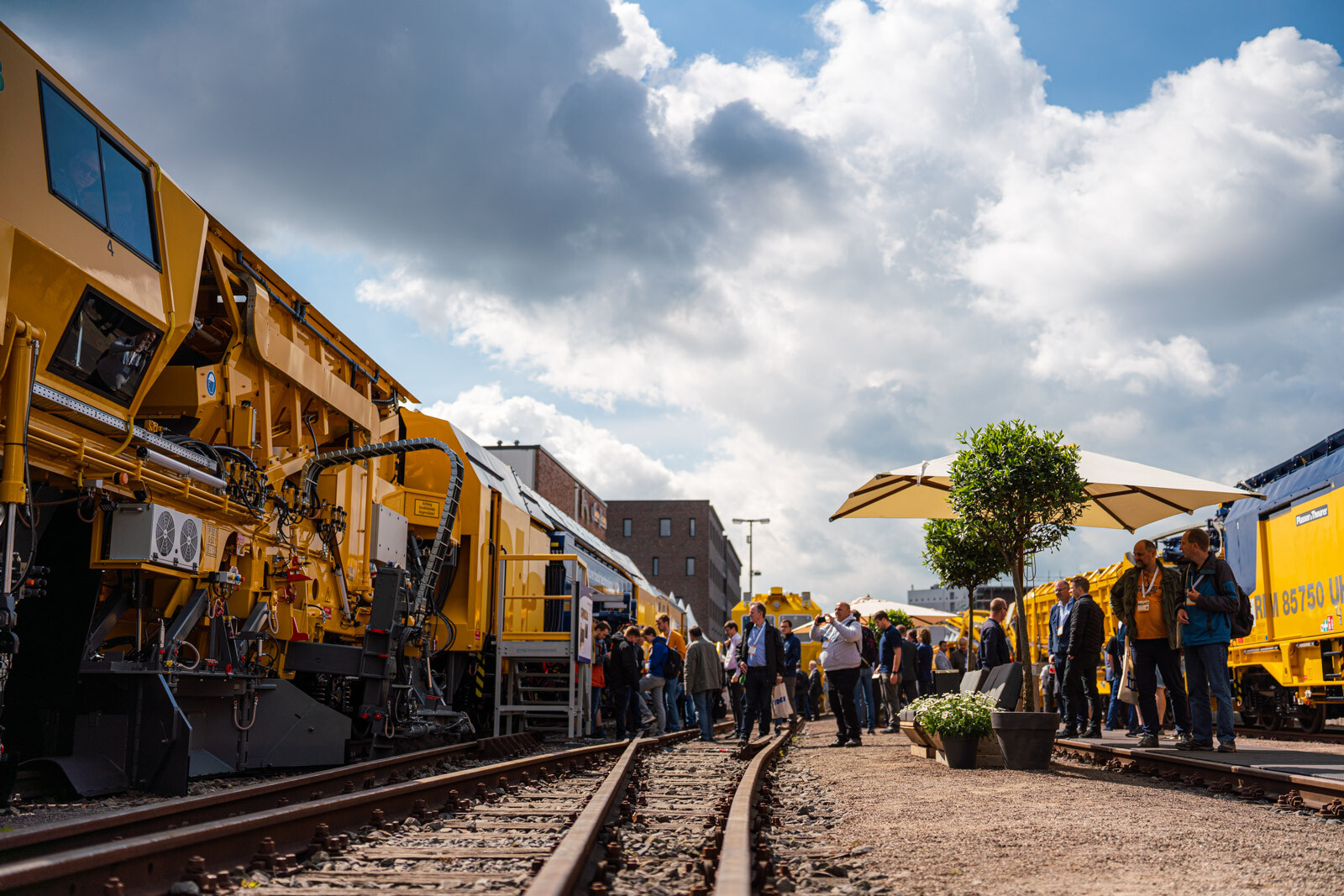 A külső vágányokon pedig a kiállítók közül a legnagyobb flottával: 19 óriás vasúti karbantartógéppel vonult fel a cég. Közöttük egy több mint 100 méter hosszú, a vasútkarbantartás (és akár vasútépítés) minden funkciójára alkalmas moduláris szerelvénnyel demonstrálta kapacitásait a vasúti seregszemlén az osztrák konszern.