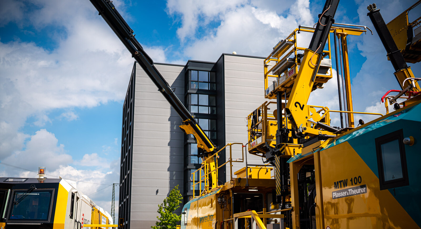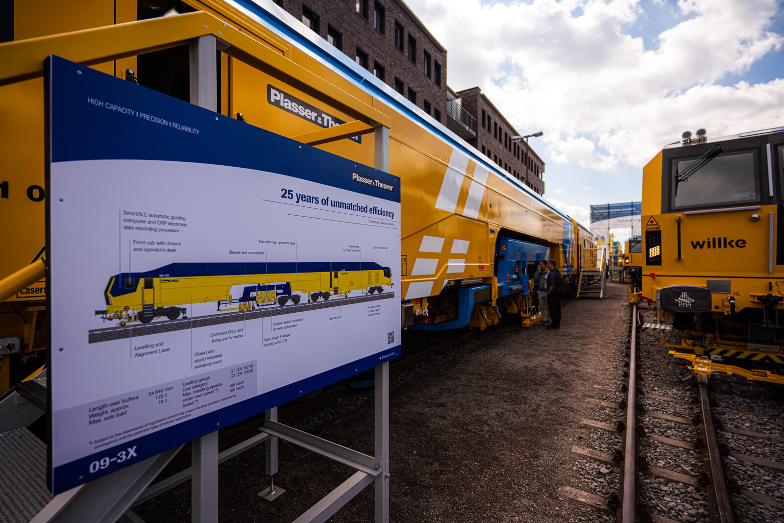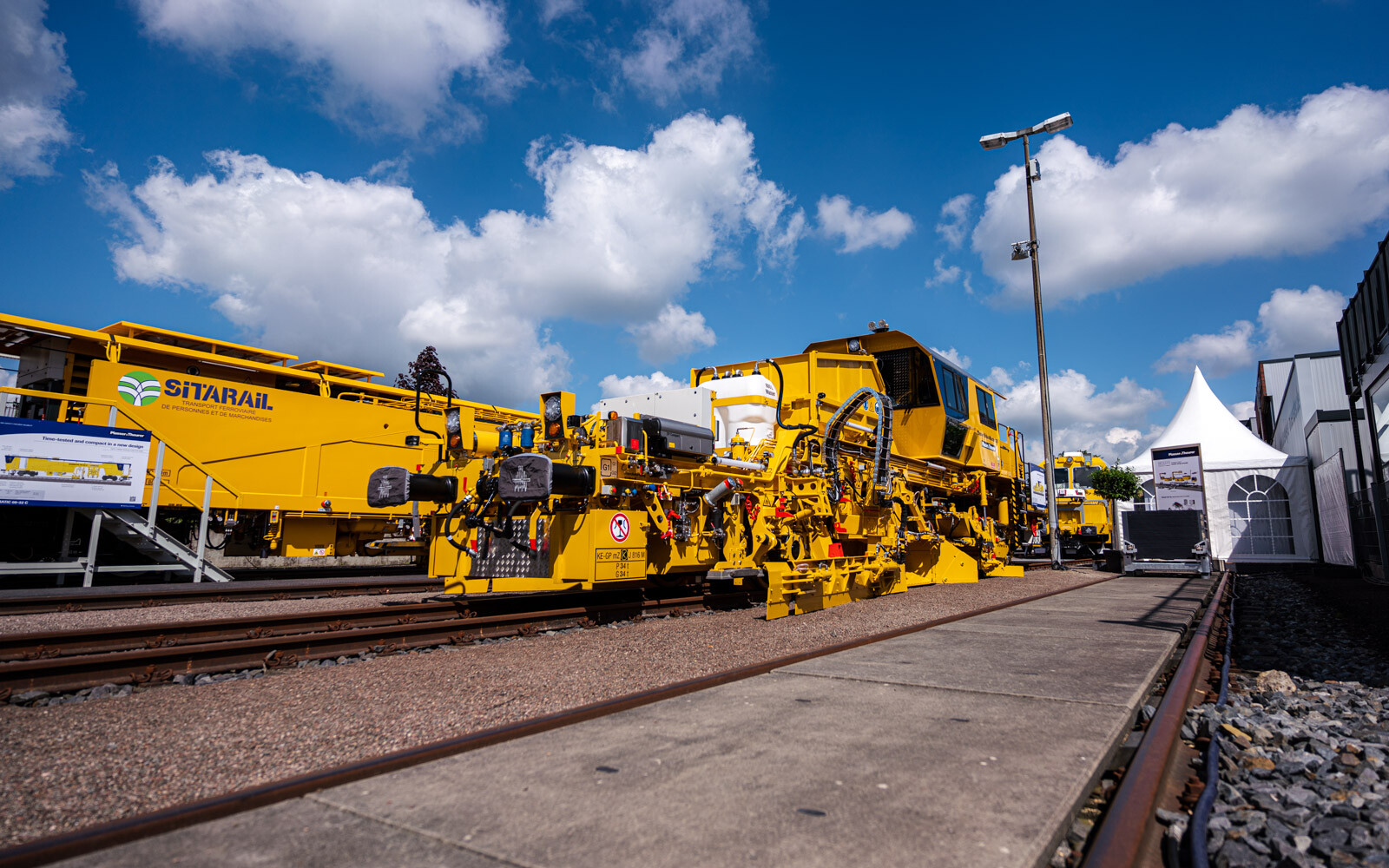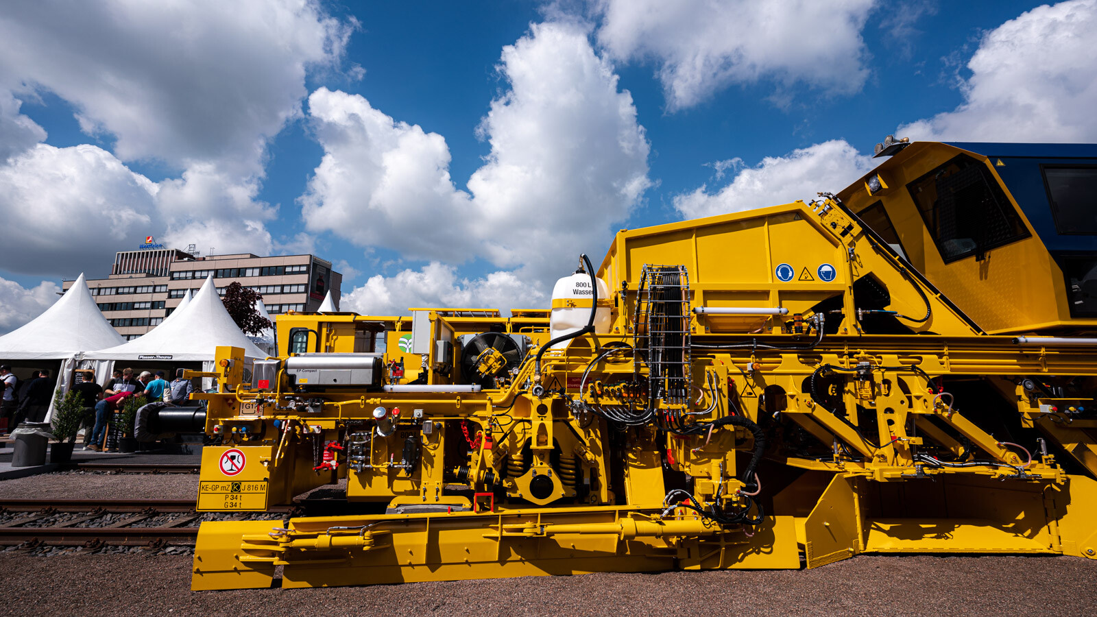 A külső vágányokon pedig a kiállítók közül a legnagyobb flottával: 19 óriás vasúti karbantartógéppel vonult fel a cég. Közöttük egy több mint 100 méter hosszú, a vasútkarbantartás (és akár vasútépítés) minden funkciójára alkalmas moduláris szerelvénnyel demonstrálta kapacitásait a vasúti seregszemlén az osztrák konszern.