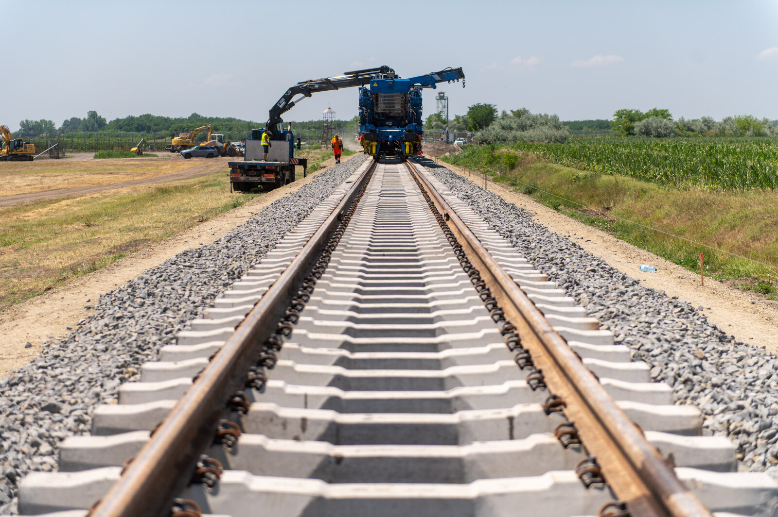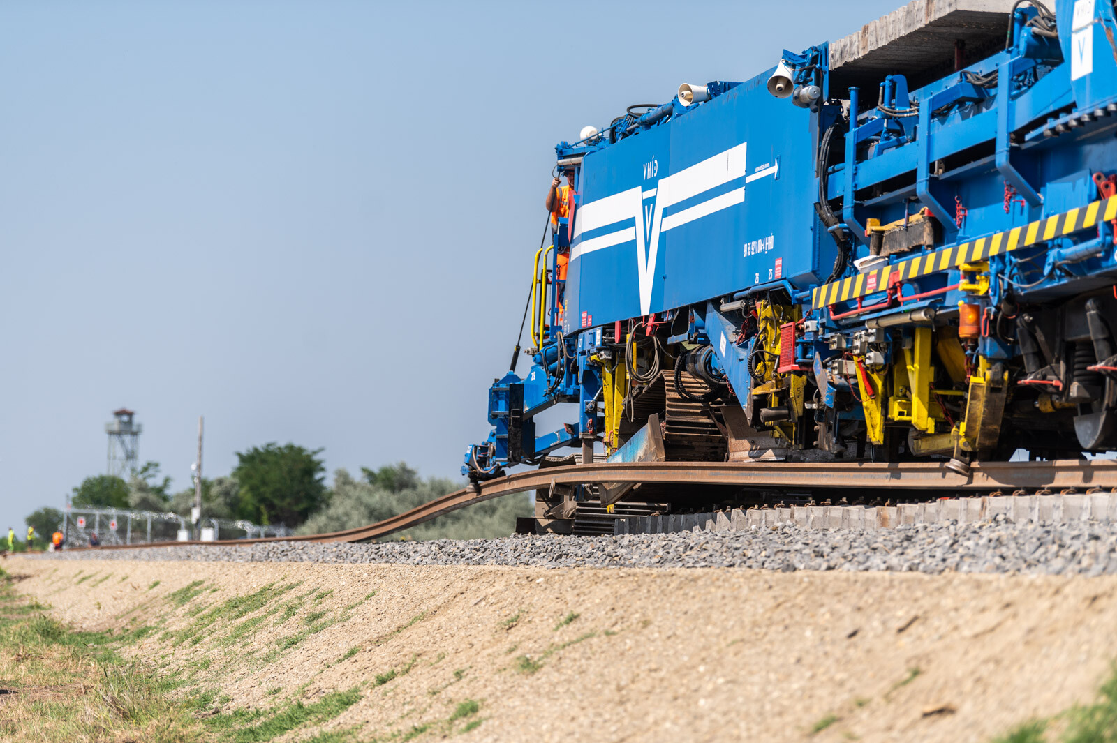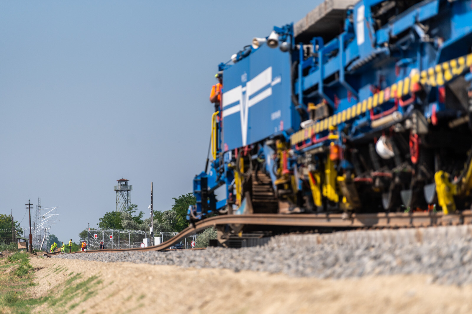 Stábunk fotókon örökítette meg, ahogy a 350 méter hosszú SMD 80/UVP 2002 vágányépítő és -átépítő géplánc lefekteti az utolsó betonaljakat egészen a röszkei országhatárt jelölő kerítésig. A rendkívül hatékony és gyors szerkezet egy műszak alatt 1,5-2 kilométernyi vágányt képes megépíteni. (A gép munkájáról korábban videót is közöltünk.) A ritkaságnak számító vasútépítő gépből Európában mindössze hármat alkalmaznak aktívan, ebből egy a V-híd tulajdonában van.