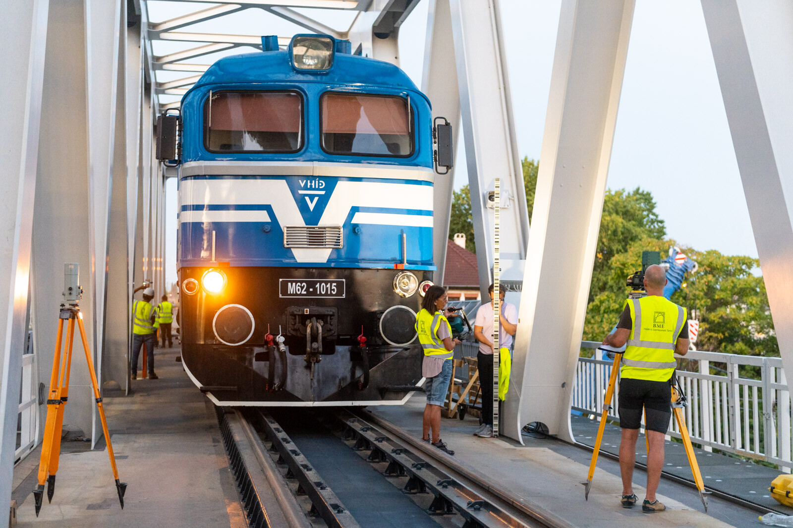 A Budapest új Duna-hídján most lezajlott statikus próbaterheléshez a Duna Aszfalt alvállalkozójaként a V-Híd Zrt. biztosította a vasúti járműveket, melyeknek összsúlya mintegy 882 tonna volt. Lapunk értesülése szerint a próbaterhelést egy M62-es mozdonnyal és 14 darab, zúzottkővel megrakott Faccpp vasúti kocsival végezték. A mérés során különböző terhelési pontokban megállított tehernél vizsgálták a híd lehajlását. Az adatok kiértékelése néhány hetet vesz igénybe.