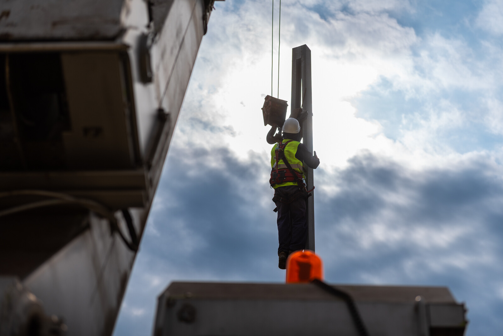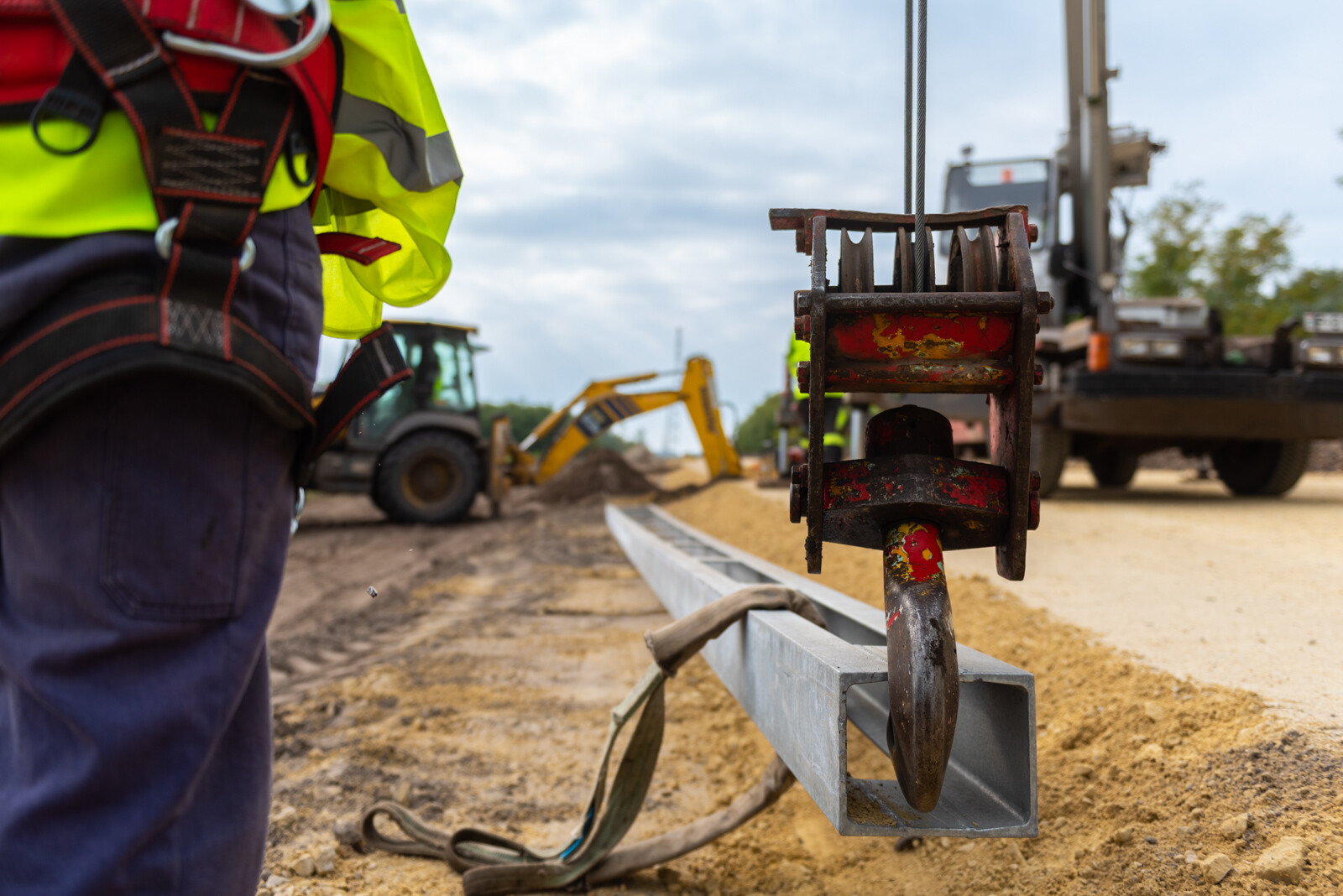 A horganyzott acéloszlopok telepítését közúti és vasúti technológiával végzik a V-Híd Zrt. szakemberei.