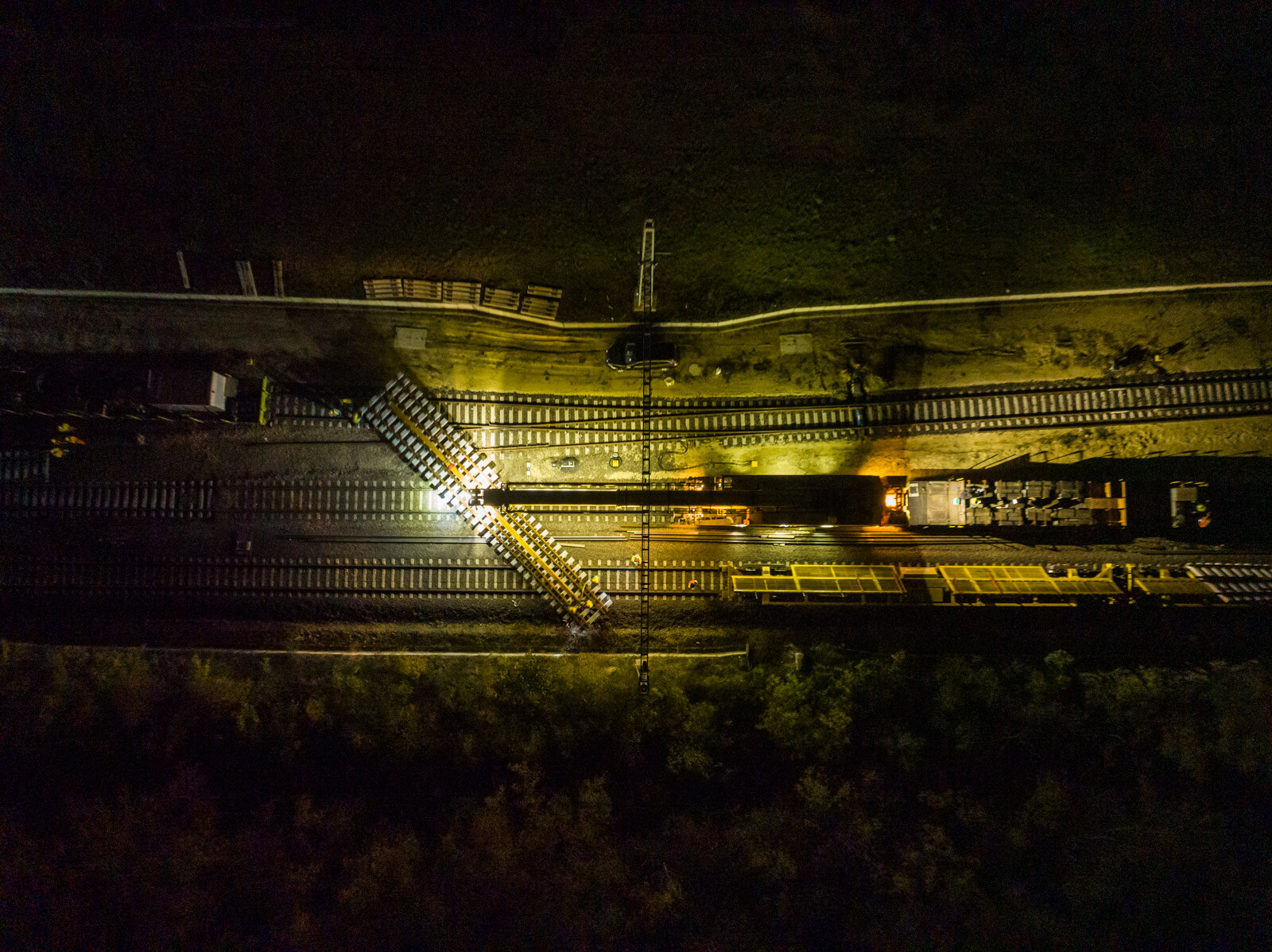 A kitérők beemelését a MÁV START Zrt. által biztosított Kirow vasúti daru segítségével végezték el. A VAMAV Kft. által szállított kitérők három részletben előszerelt kivitelben érkeztek RGS, illetve dönthető rakfelületű WTW szállítókocsin ferdén elhelyezve (így biztosítva, hogy elférjenek az űrszelvényben). A 150 tonnás daru ezekről emelte pontos helyükre a kitérőket.
