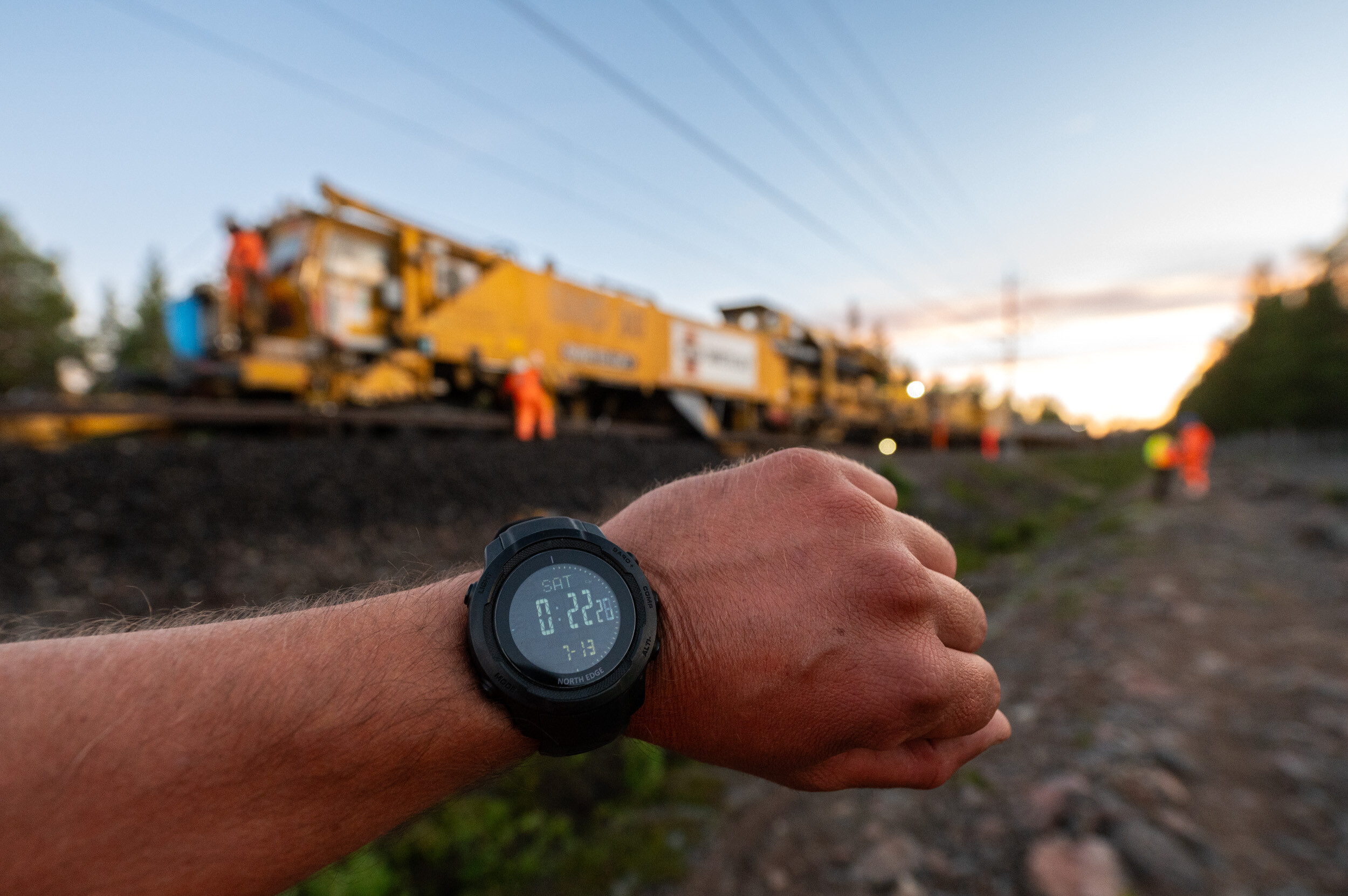 Ez adta a projekt különlegességét, hiszen a sarkkörön túl ebben az időszakban úgynevezett „fehér éjszaka” van, vagyis éjjel alkonyati fényekben újíthatták meg a vasúti vágányokat.