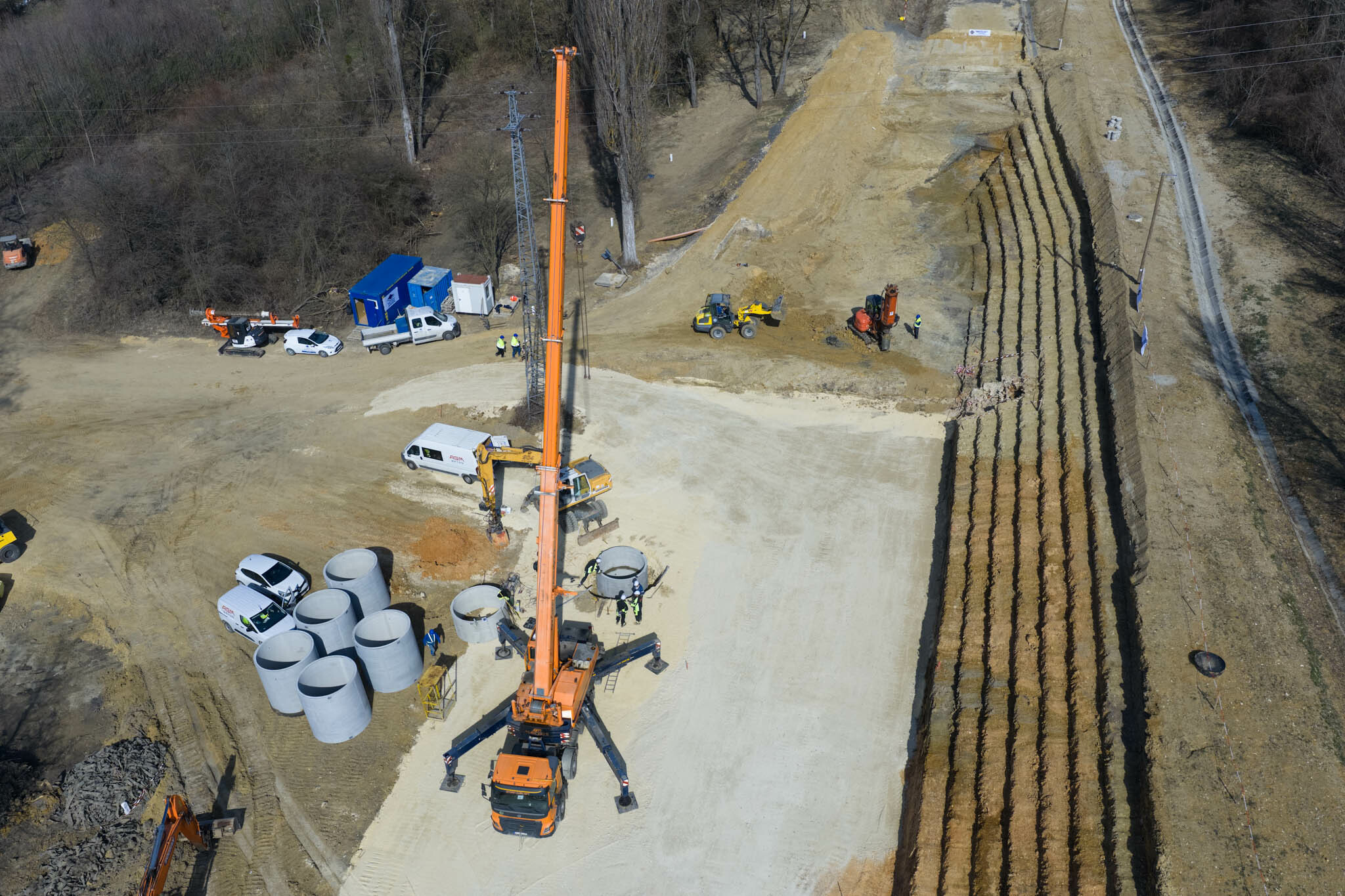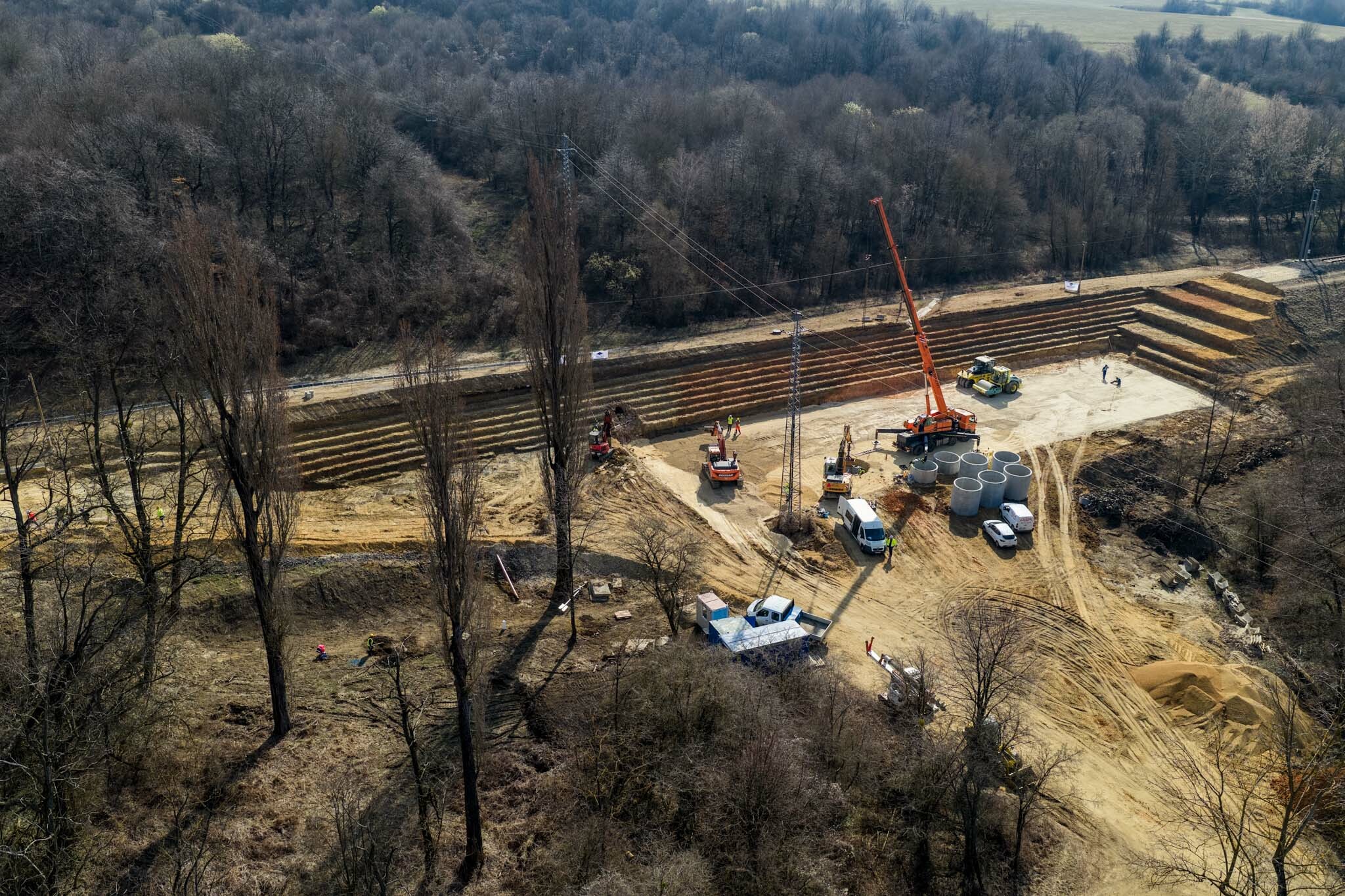 Ezt követően indulhatott el a kivitelezés következő jelentős szakasza, a víztelenítő rendszer kiépítése, amely jelenleg is folyamatban van. Ennek célja, hogy a korábban elbontott töltés alatt, mintegy 8 méter mélységben csökkentsék a talaj víztartalmát.