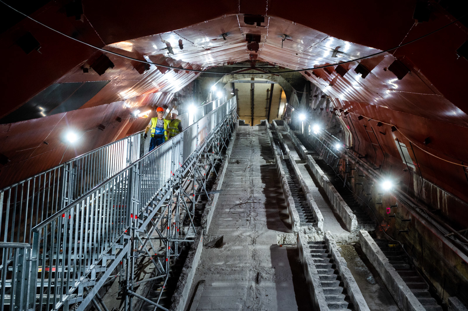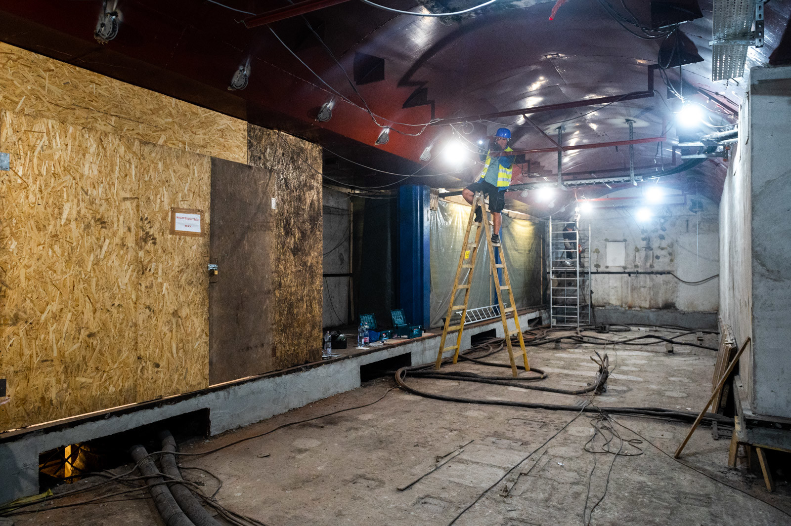 Ehhez át kellett építeni az ideiglenes állványlépcsőt, ami a már elbontott mozgólépcsők helyett teszi lehetővé a közlekedést az aknában. Részletesebb információkat is kaptunk: konkrétan kábeleken is dolgoznak, illetve az aknában vezető új vízvezetékek már elkészültek.