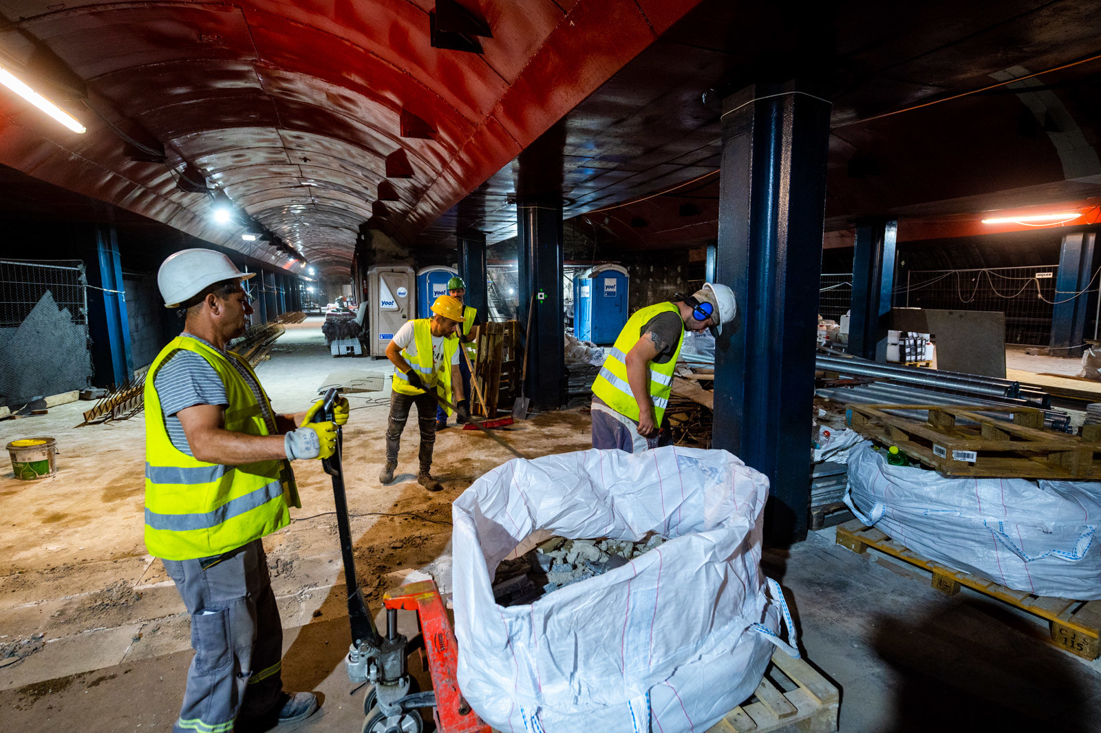 A peronszinten minden bontási munka elkészült és a bontott anyagokat elszállították (erről az összetett és pontos szervezést igénylő feladatról és a mögötte álló infrastruktúráról nemrég írtunk cikket). A felújítás során a metró biztonságosabbá is válik, ehhez vízköddel oltó rendszert építenek ki, jelenleg ennek a gépházán zajlik a munka. Szintén a peron szintjén az aljzatbetonozási feladatokkal is haladnak, a kőművesmunkák 90 százaléka pedig már elkészült.