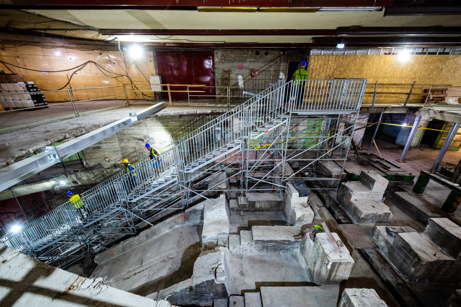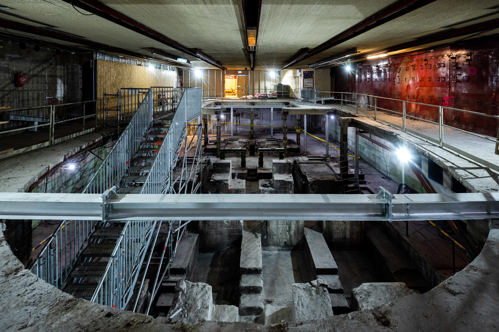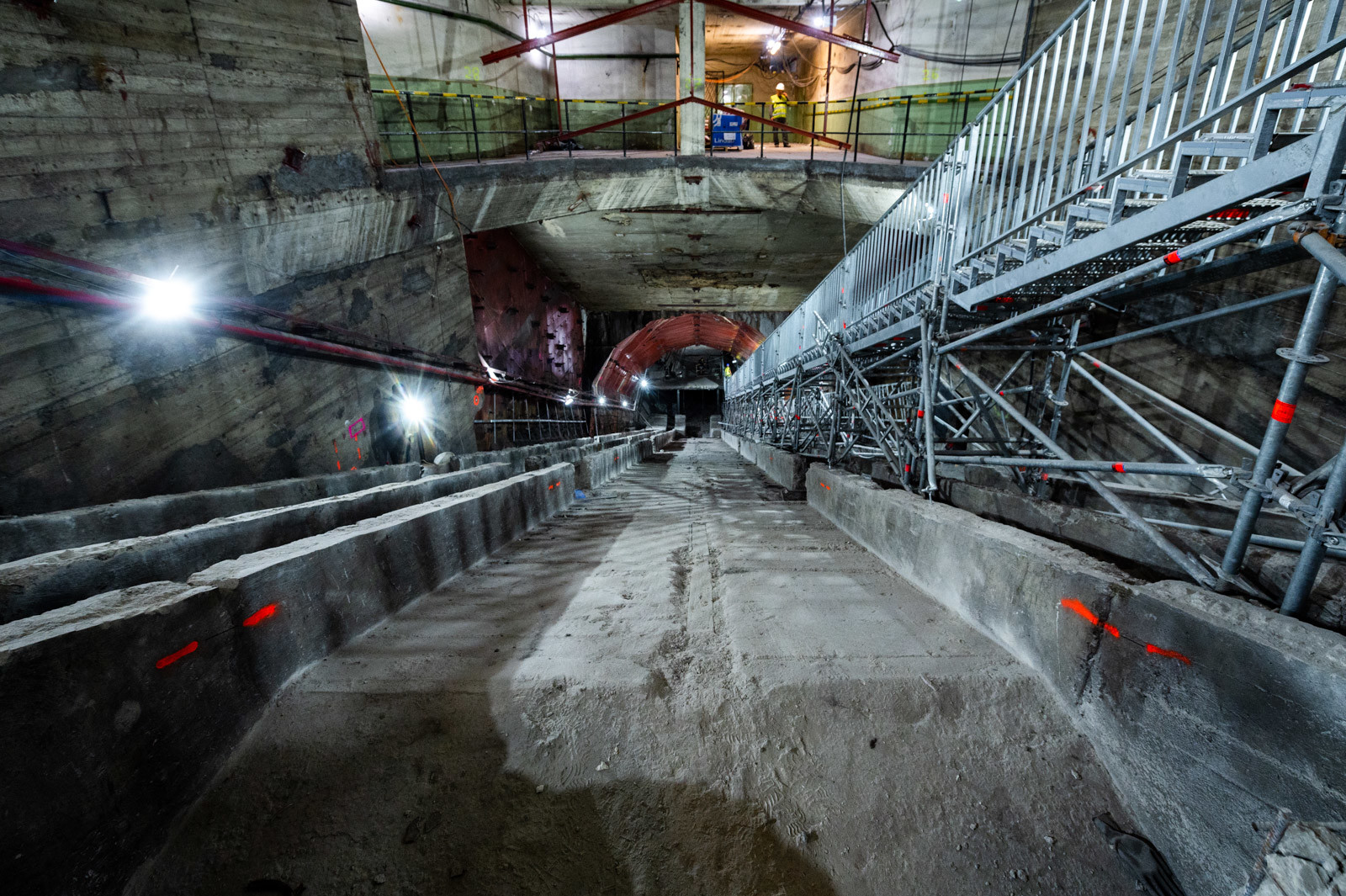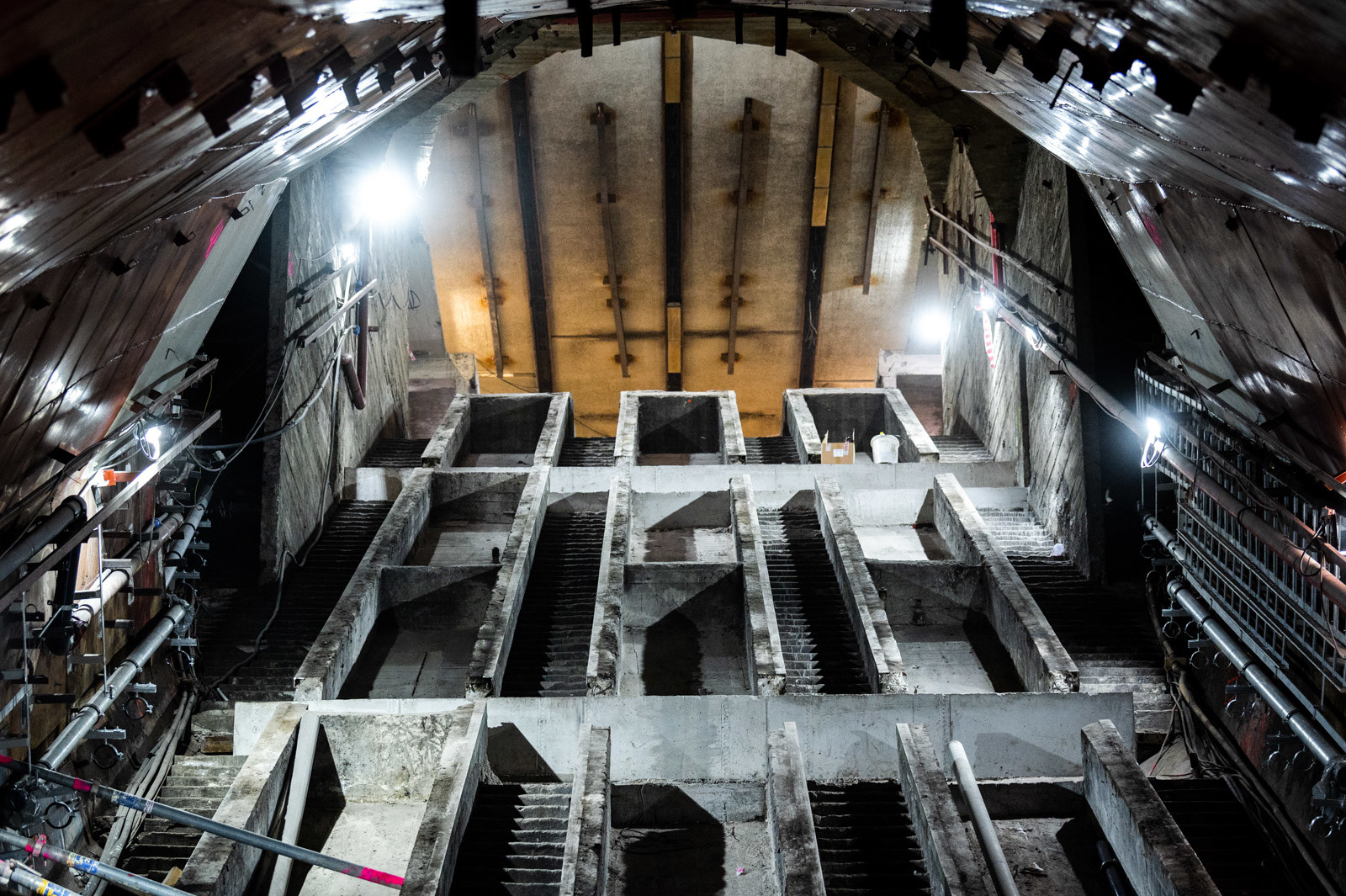 A Deák Ferenc téren az M2 és M3 vonalakat összekötő folyosó megtisztult, és lassan elnyeri végső formáját az új liftakna is.