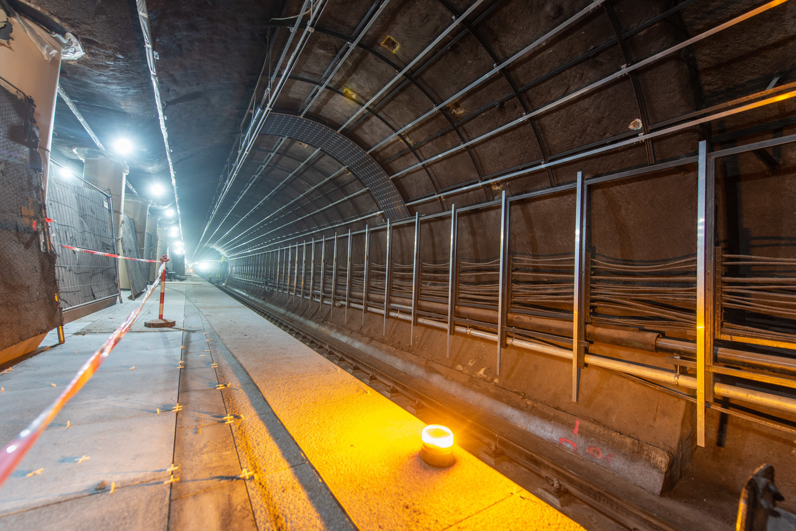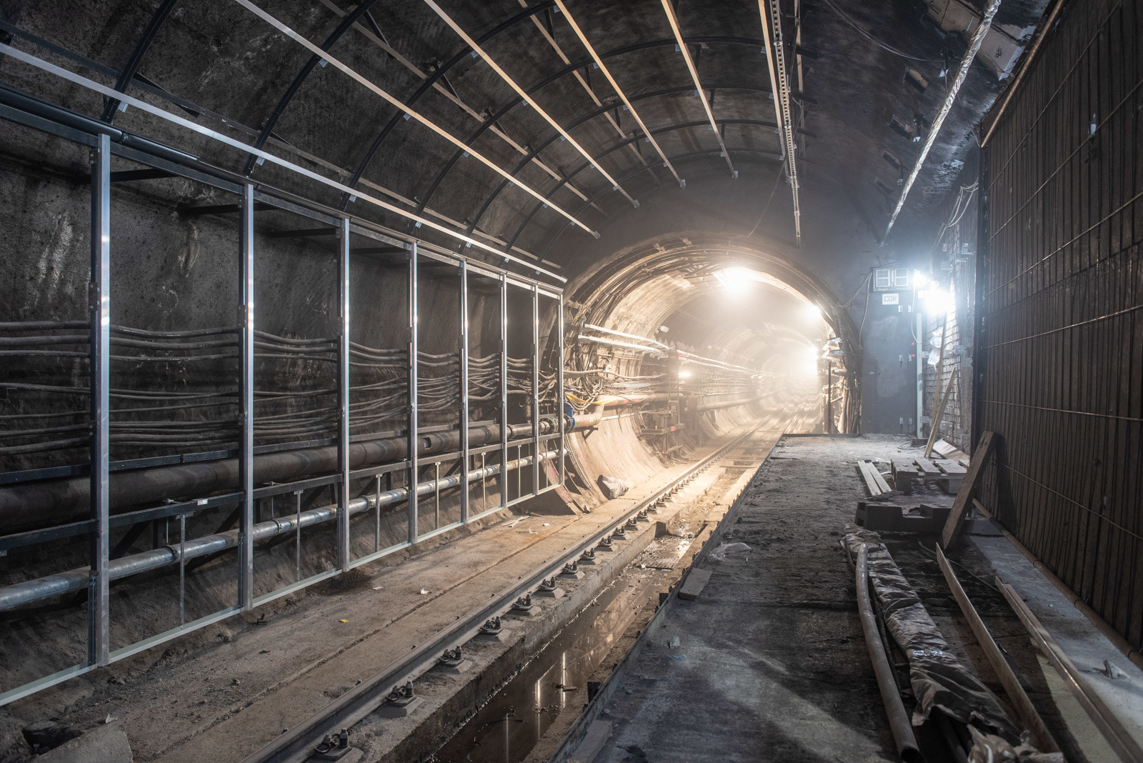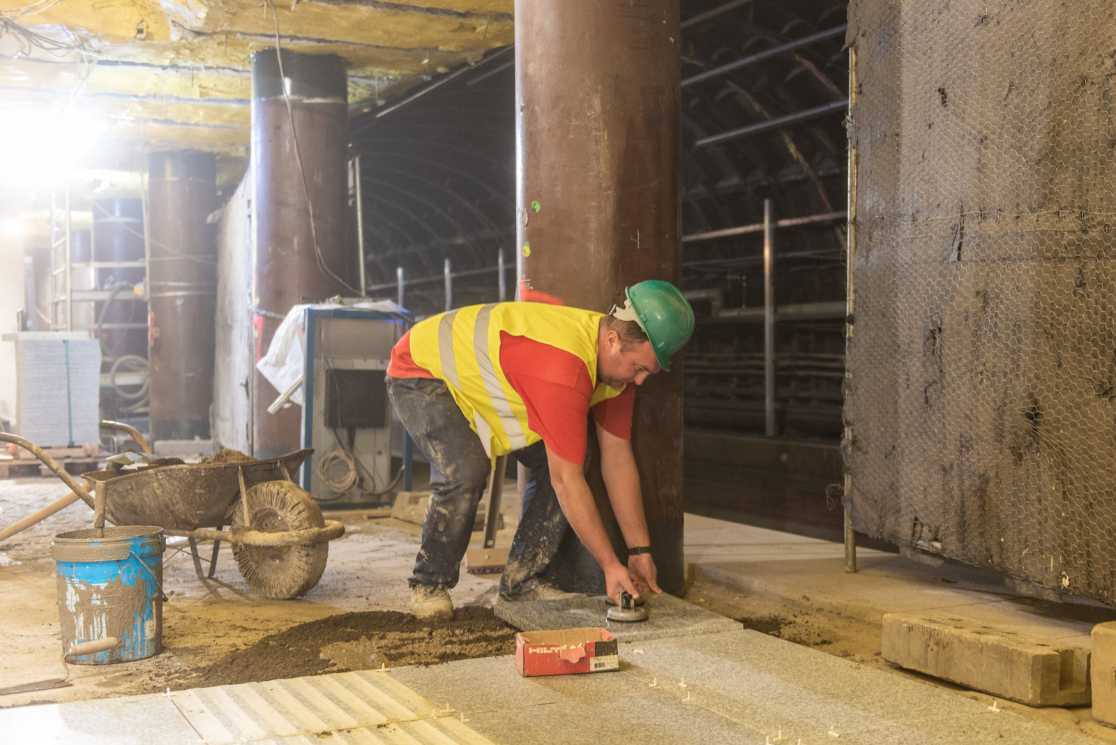 Közben megkezdődtek a munkák a peronszinten is: készítik a gránit padlóburkolatot, festik a torkrét mennyezetet. Még folyamatban van a falburkolatok tartószerkezeteinek felhelyezése és a jobb vágánytér injektálása.