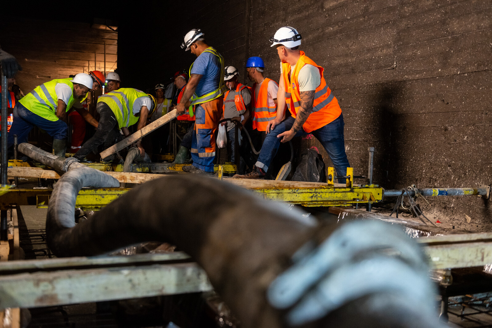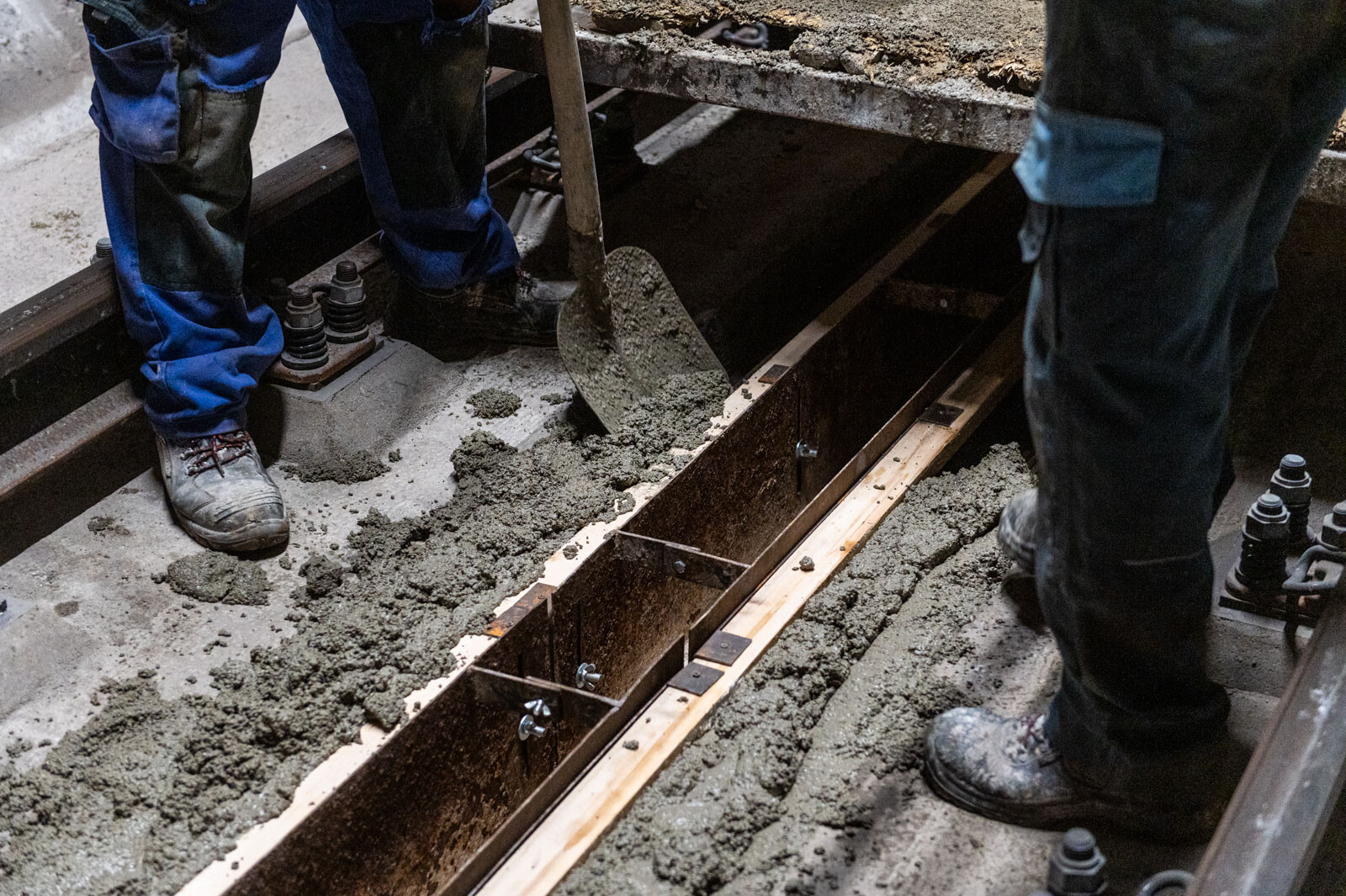 A legfontosabb szempont talán a beton összetétele, minősége, hiszen úgy kell kikeverni, hogy 4-5 óránál hamarabb ne kezdjen el kötni, viszont tíz nap elteltével elérje az előírt C25 végszilárdságot (normál esetben a beton szilárdulási időtartama 28 nap). Ugyanakkor ahhoz, hogy pumpálható legyen, egy kvázi folyékony betonra van szükség, amivel nehezebben tudnak dolgozni a szakemberek. Mire a beton leér, a speciális függesztőművekkel végleges helyeztében rögzített (ezt hívjuk „top-down” technológiának), geodéziailag beállított kitérő minden alkatrésze -a megóvásuk végett- becsomagolásra kerül. A betonozás során nagyfokú odafigyelést igényel a szakmunkások részéről a betonfelület kialakítása, amelyet plusz/mínusz 4 milliméter pontossággal kell elkészíteni.