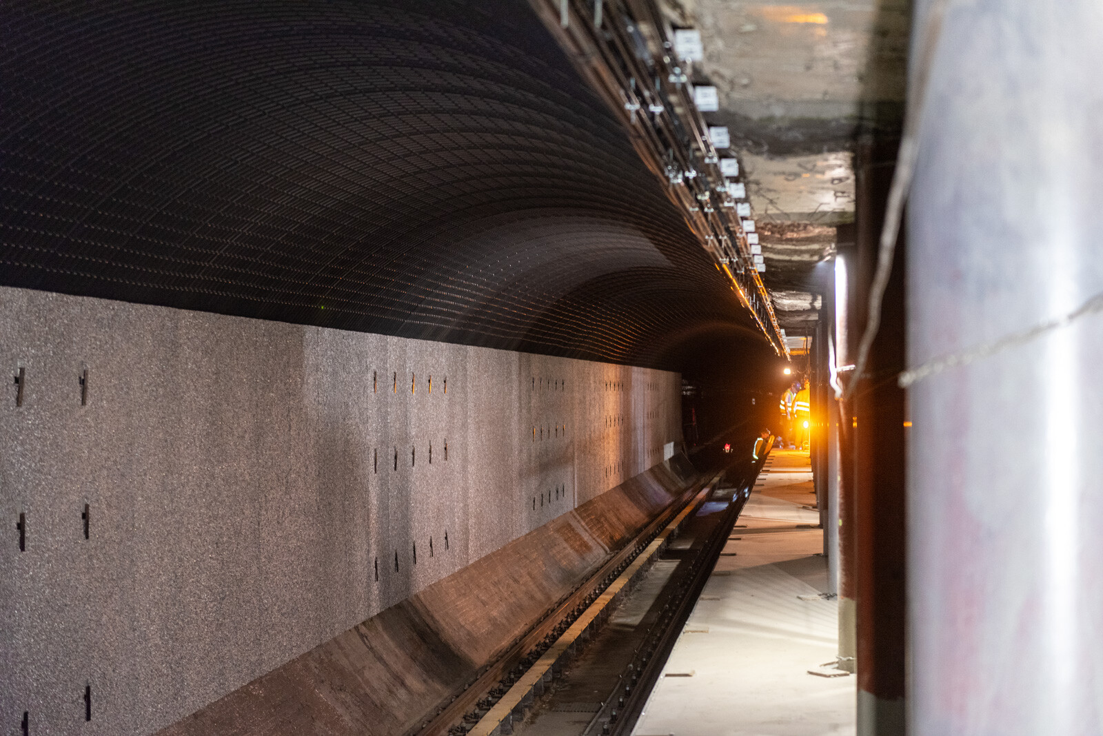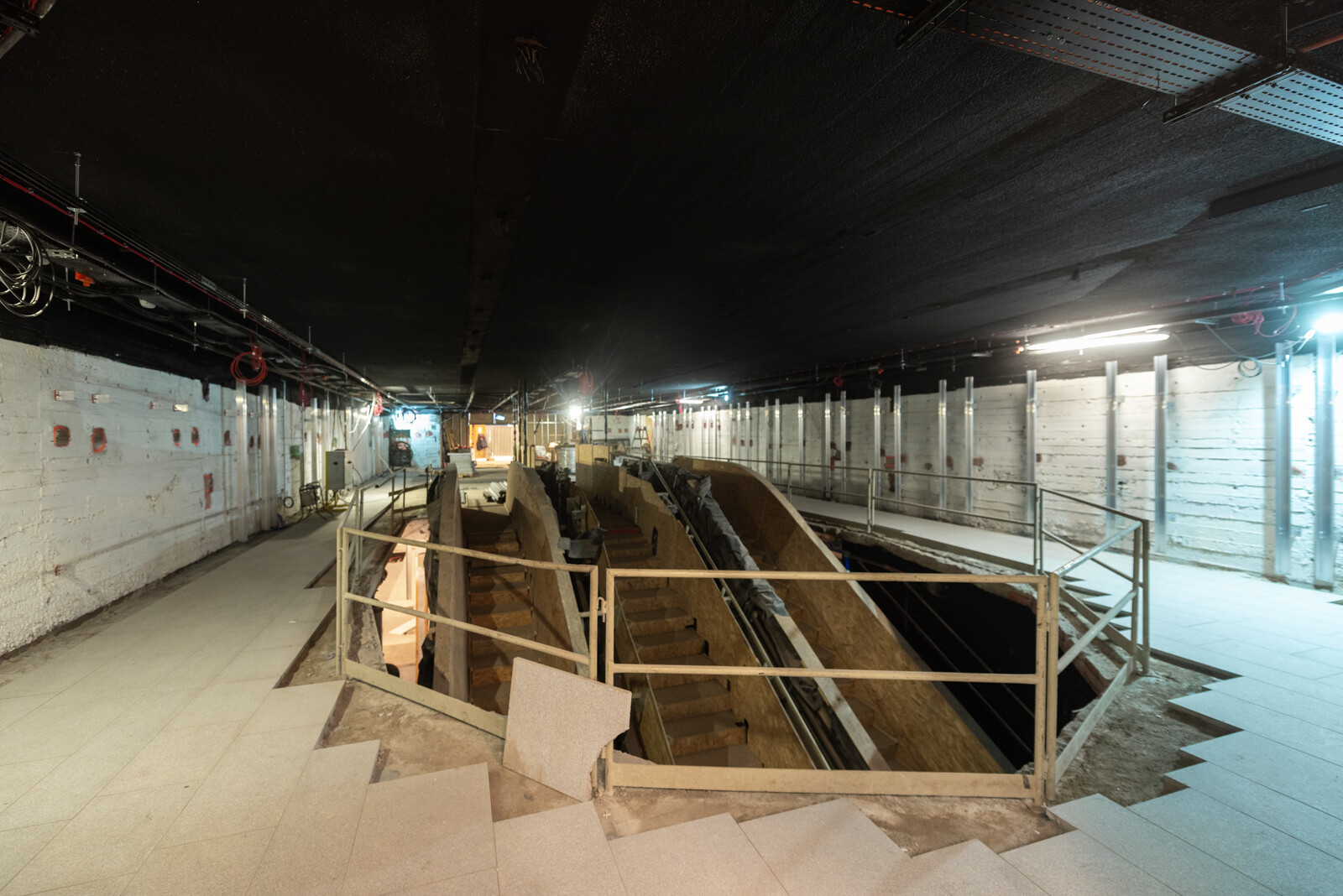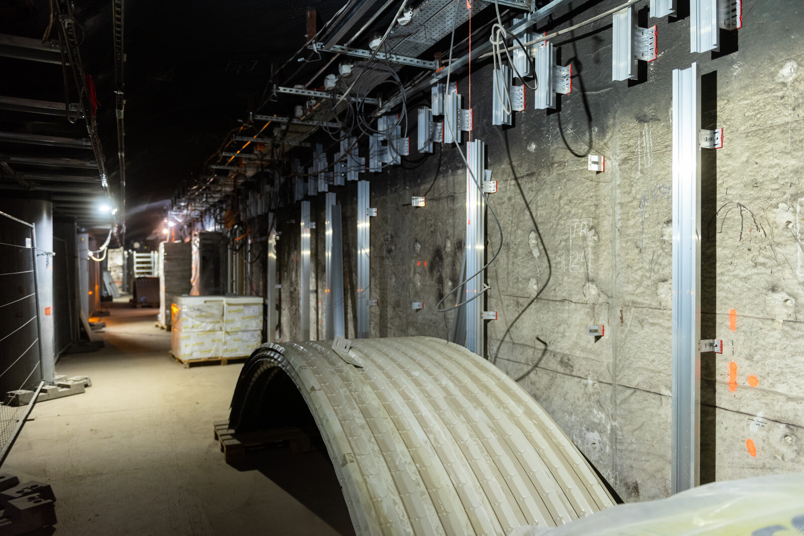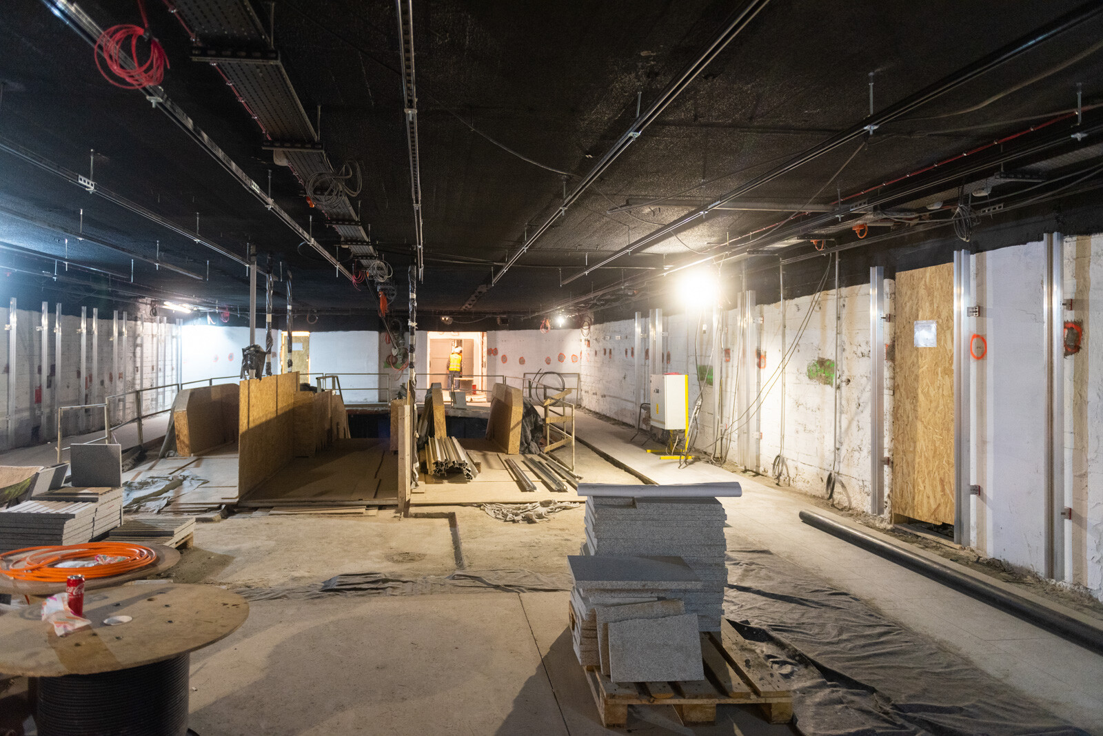 A peronszinten a végleges kőburkolat elkészült, és folyamatosan szerelik a végső oldalfalat és az álmennyezet tartószerkezetét. A következő hónapokban felszerelik az álmennyezeti tálcákat és az oldalfal burkolati paneleket.