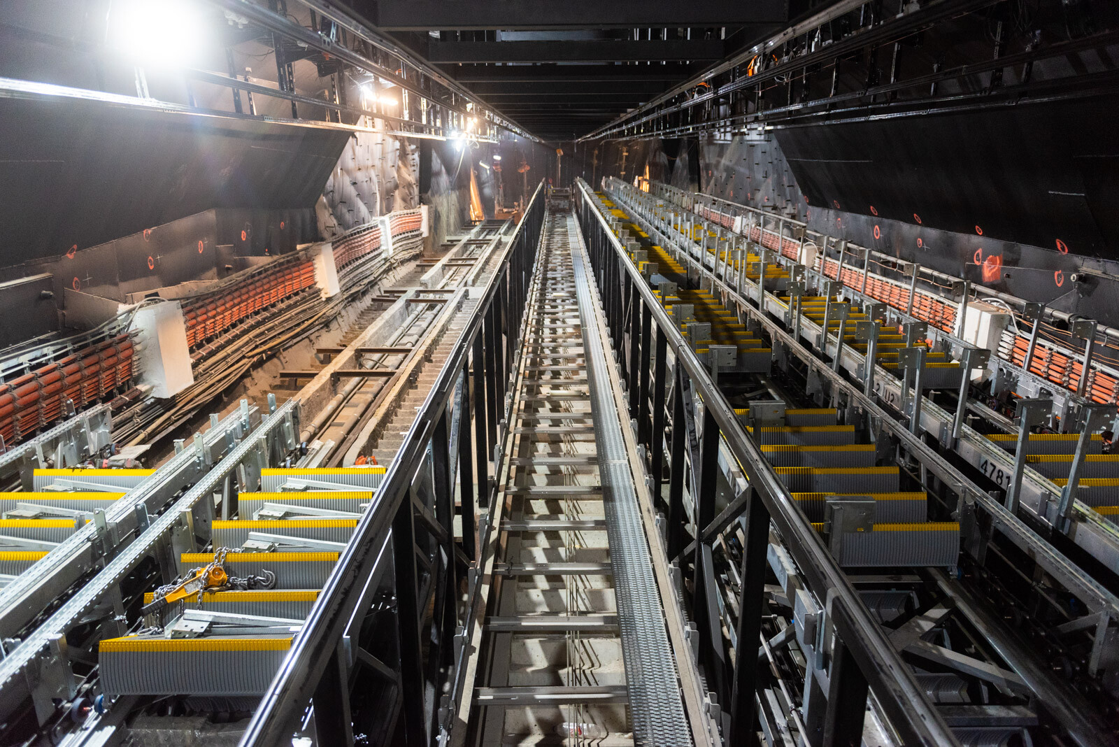 A felszíni épület utasforgalmi területén az álmennyezetet elkezdték szerelni, és hamarosan bekerül a kőburkolat. A peronszinten az utastéri tárgyak vázszerkezetének telepítése megtörtént, következhet azok burkolása. A lejtaknában közel minden szerkezetet beépítettek: a következő hónapokban a mozgólépcsők készreszerelését, és a ferdepályás felvonó telepítését végzik.