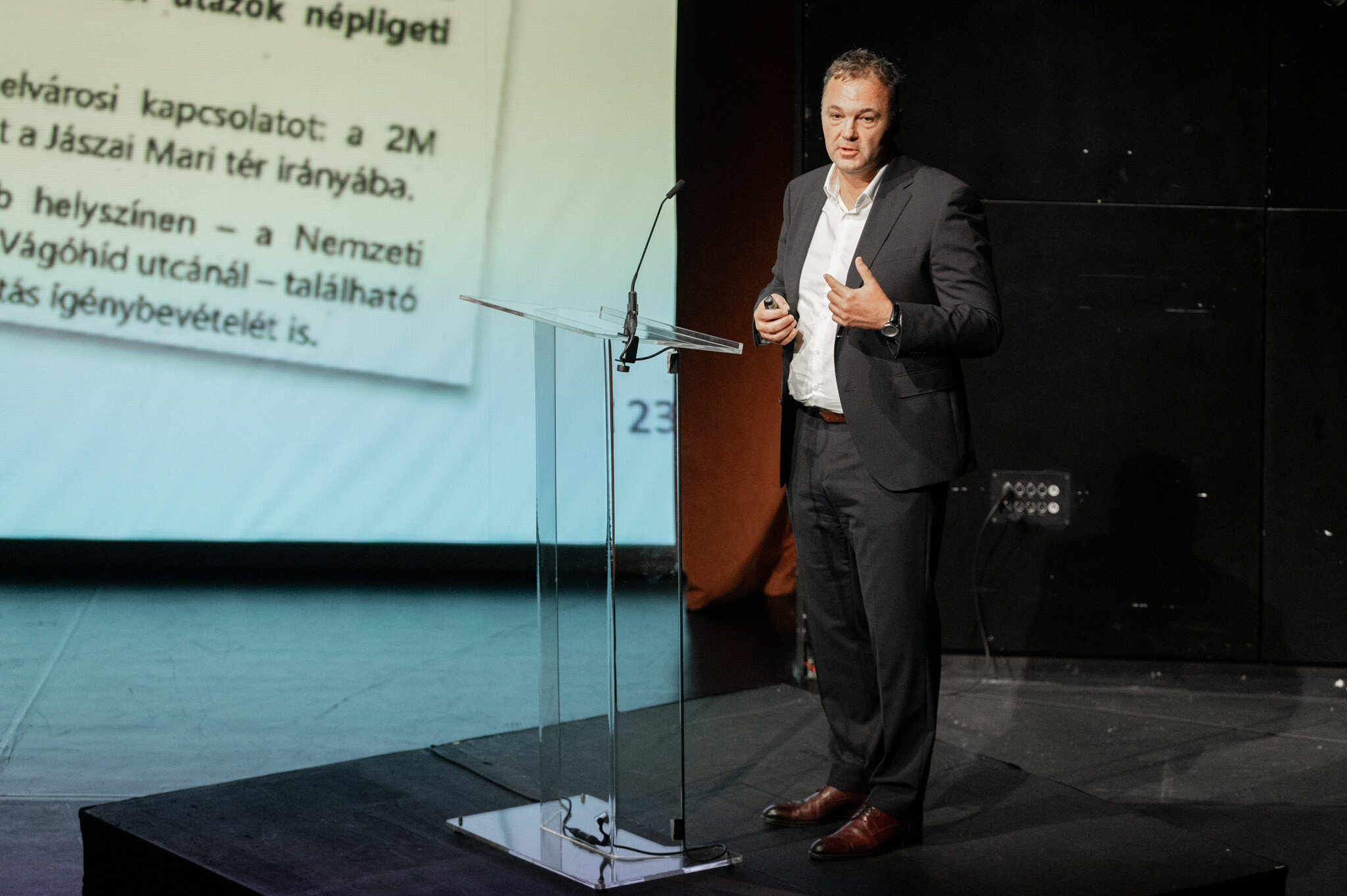 Nagy Balázs közlekedési, környezeti és energiahatékonysági fejlesztési programok végrehajtásáért felelős helyettes államtitkár az irányító szerv metrófelújítással kapcsolatos feladatait mutatta be előadásában.