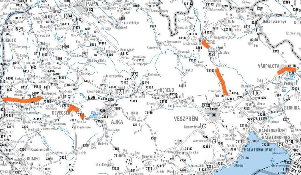 A Magyar Közút Veszprém megyében összesen 29 kilométeren újít fel több útszakaszt közel 3,7 milliárd forintos hazai forrásból. A fejlesztések a 82-es út mellett érintik a 8-as főút Tüskevár és a megyehatár közti szakaszát, továbbá a várpalotai részét, illetve az Ajka-Devecser, valamint az Ajka-Sümeg összekötő utak egyes részeit.
