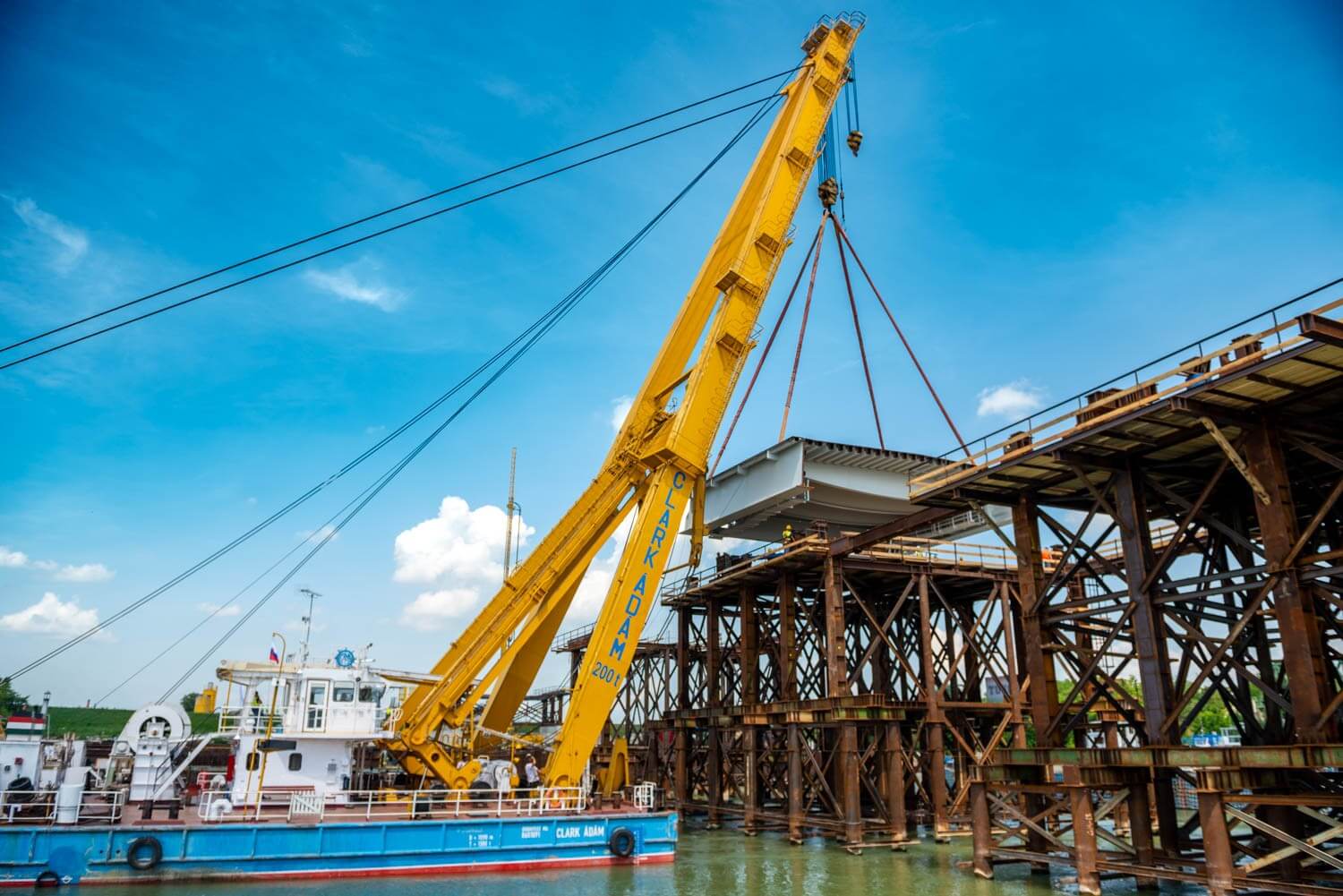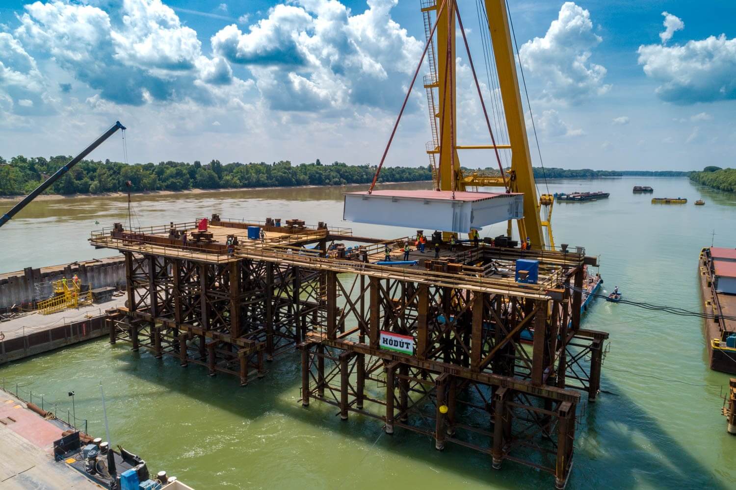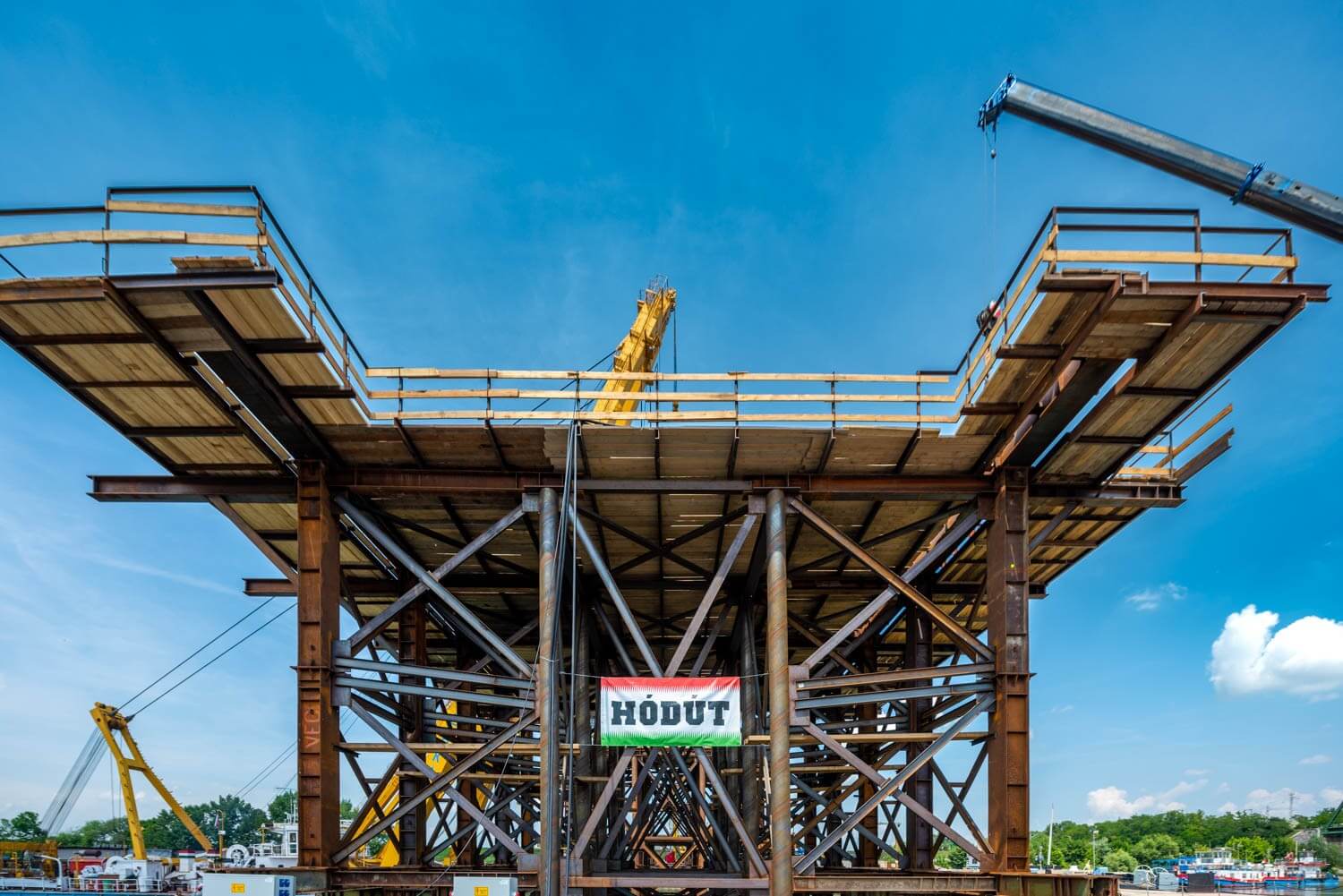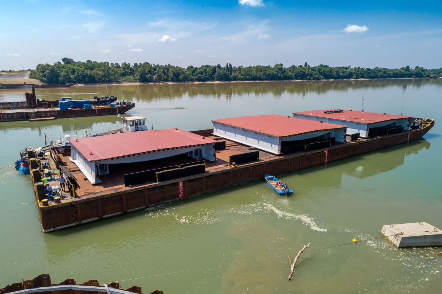 Az egyenként 165 tonnás alkotórészek Csepelről a Dunán érkeztek a helyszínre.