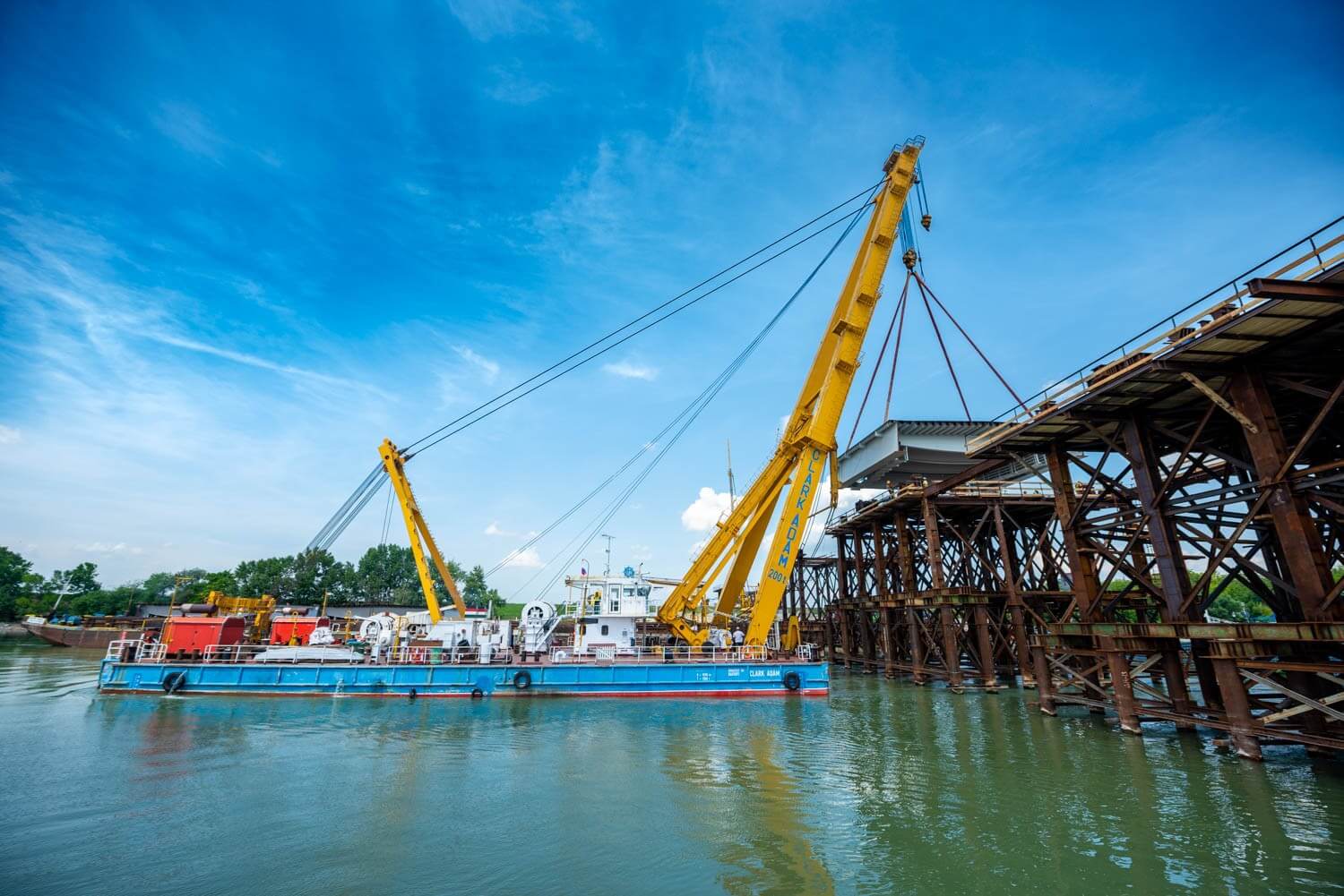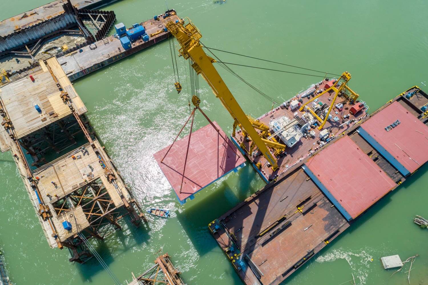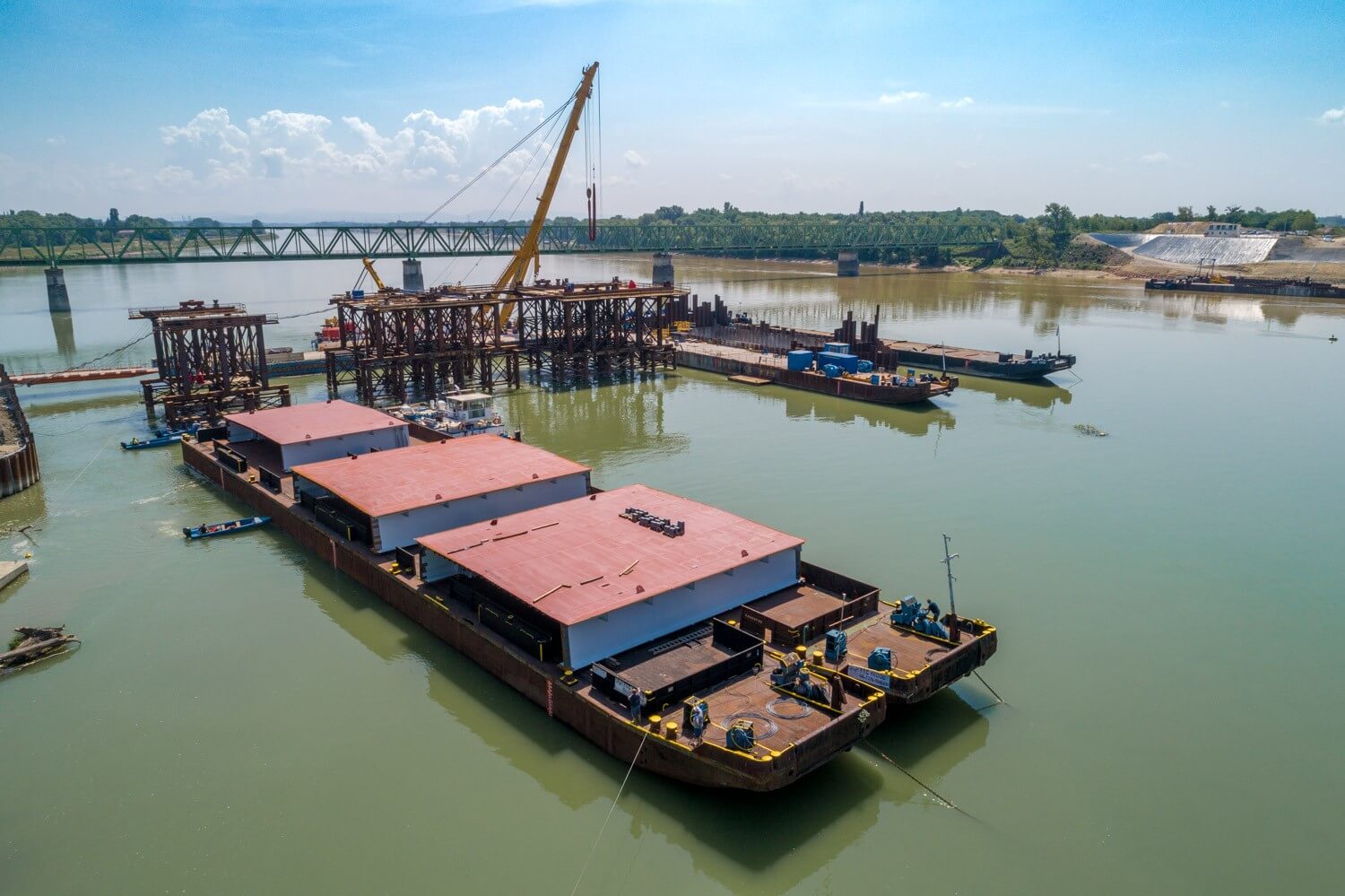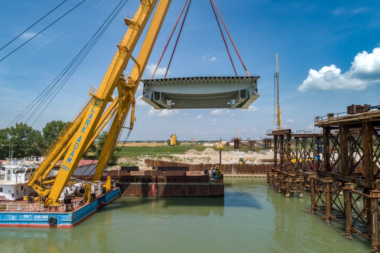 Az egyenként 165 tonnás alkotórészek Csepelről a Dunán érkeztek a helyszínre.