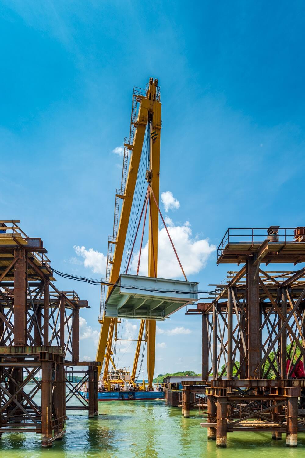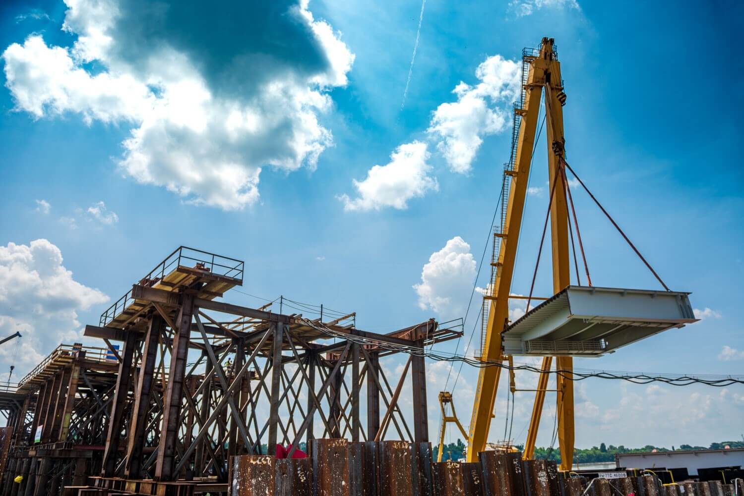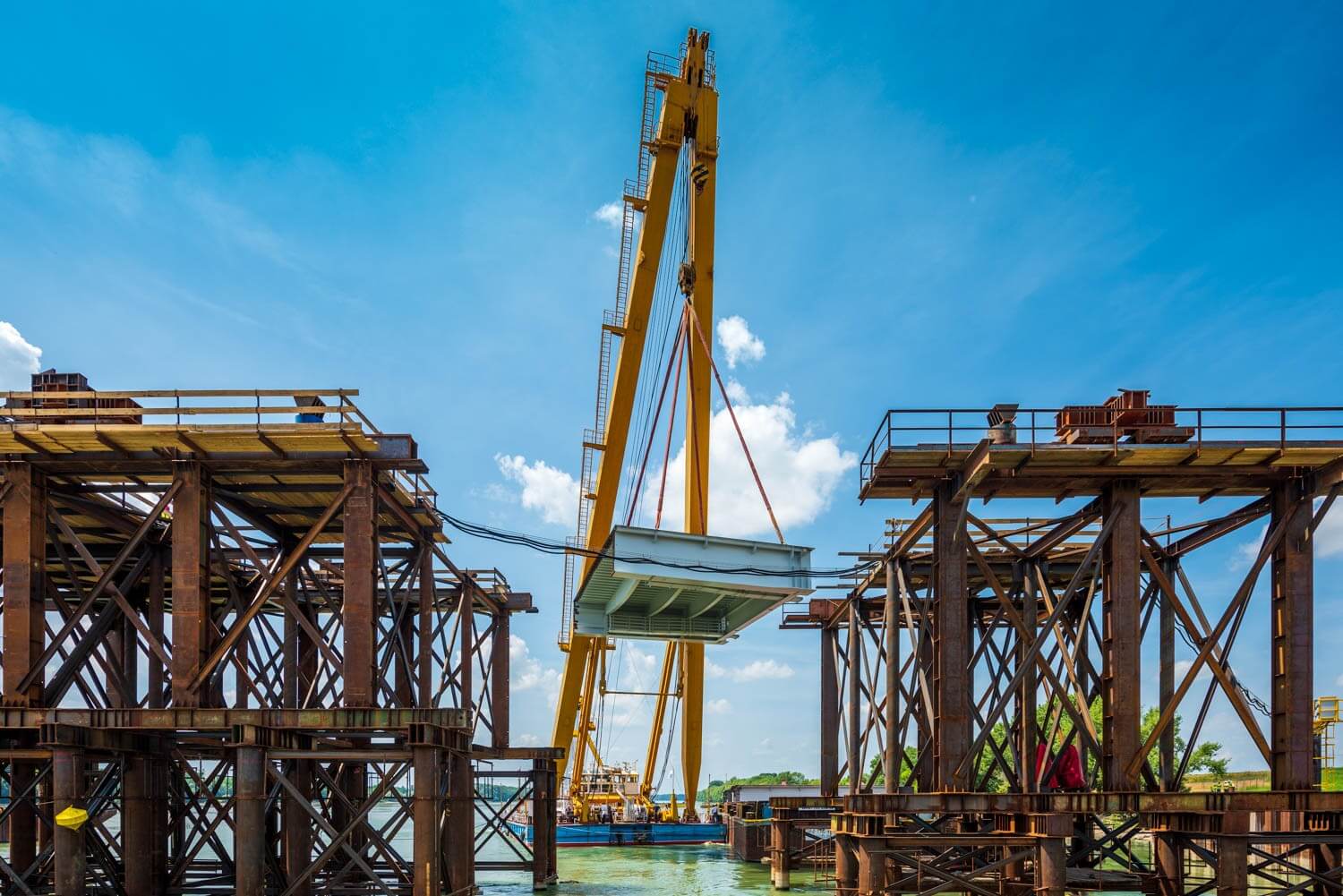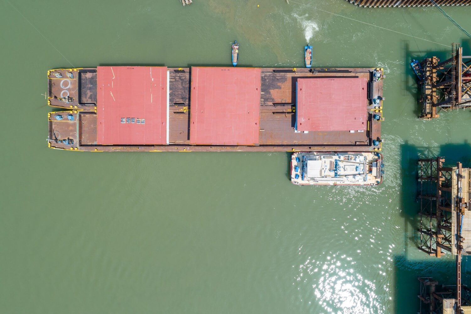 Az egyenként 165 tonnás alkotórészek Csepelről a Dunán érkeztek a helyszínre.