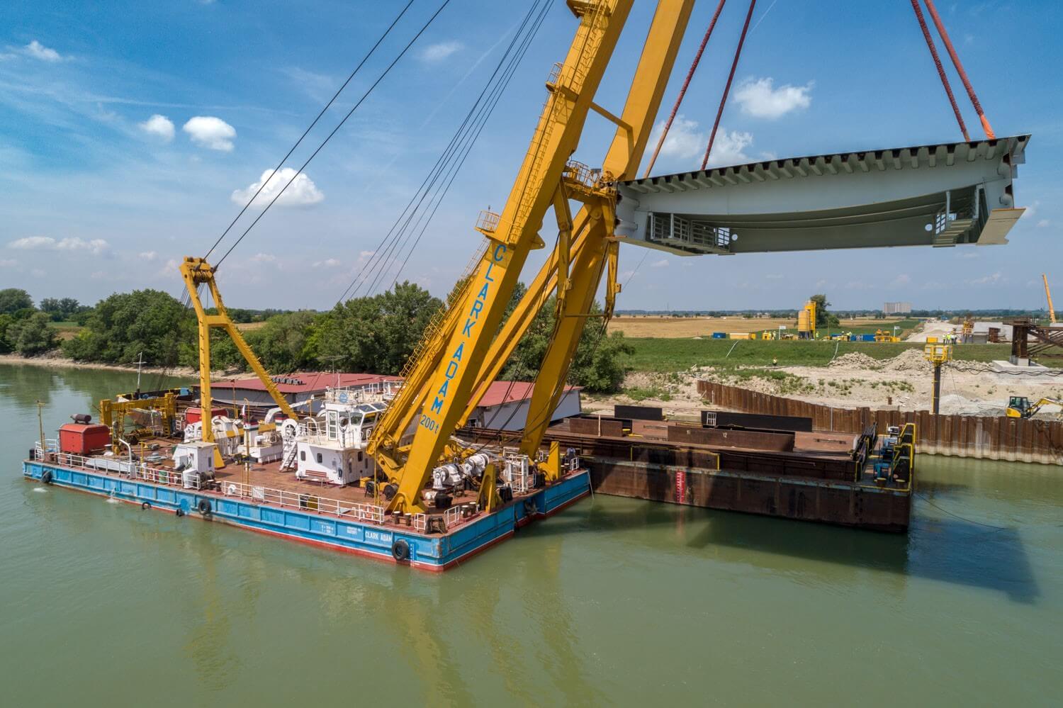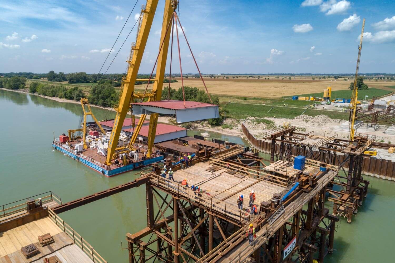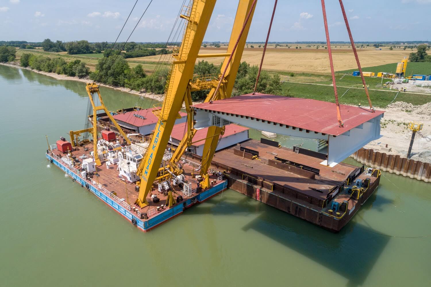 A teljes híd 37 hasonló elemből áll, ezek összsúlya 5400 tonna. Az útpálya részeit az összeállítás után egy időre Szlovákia irányába tolják el, így párhuzamosan építhetik a hidat tartó pilont, amely 2400 tonnás és közel 95 méter magas lesz.