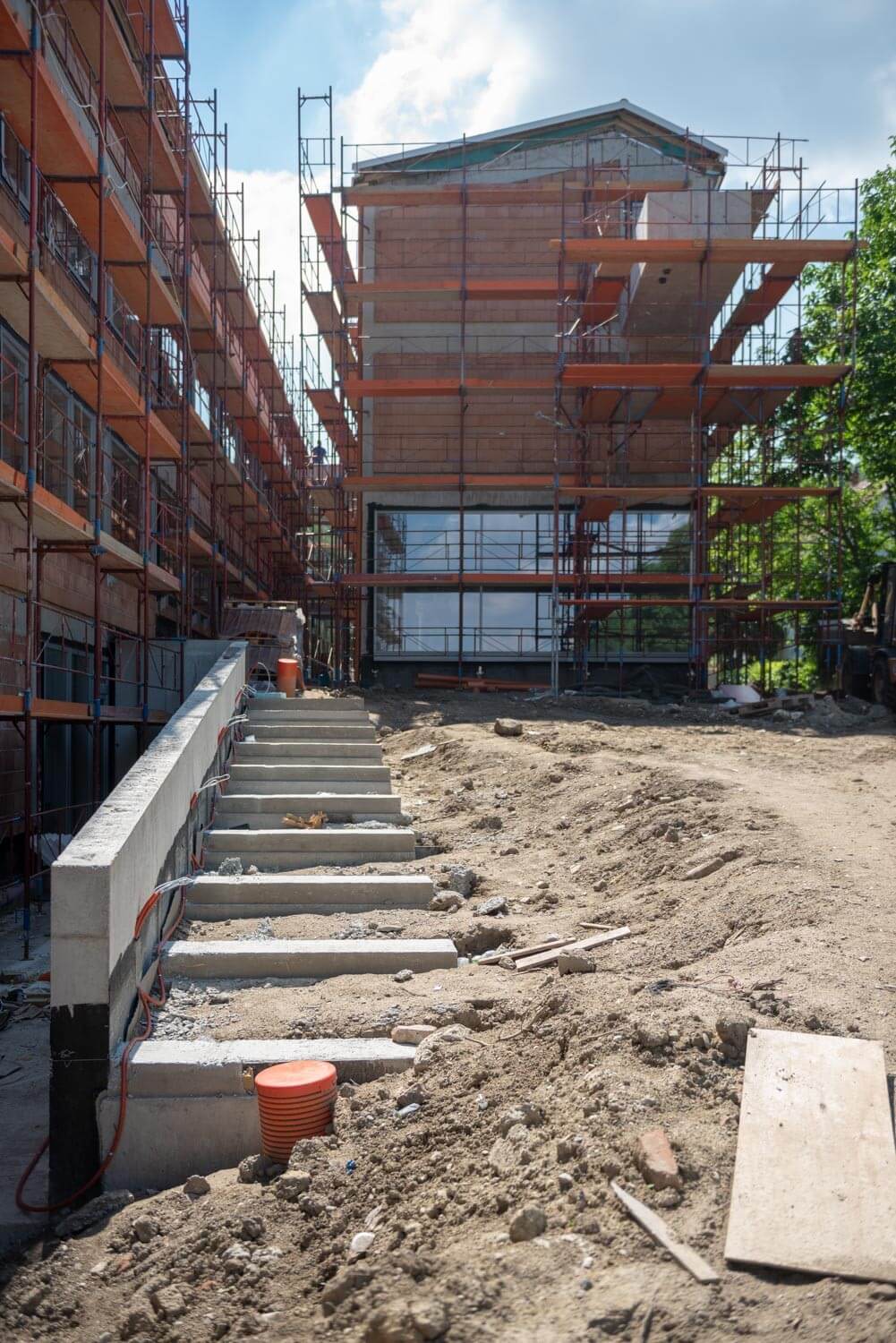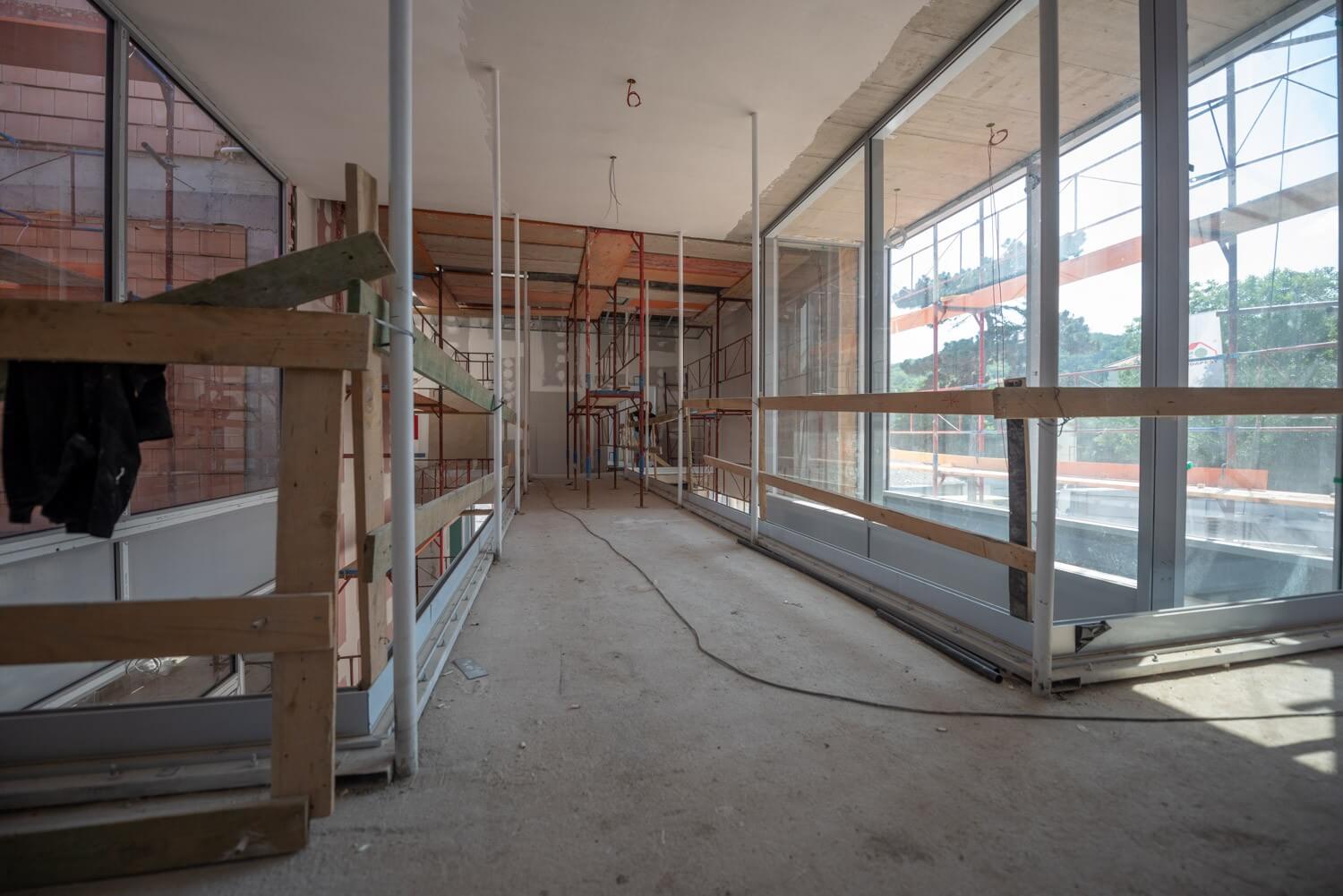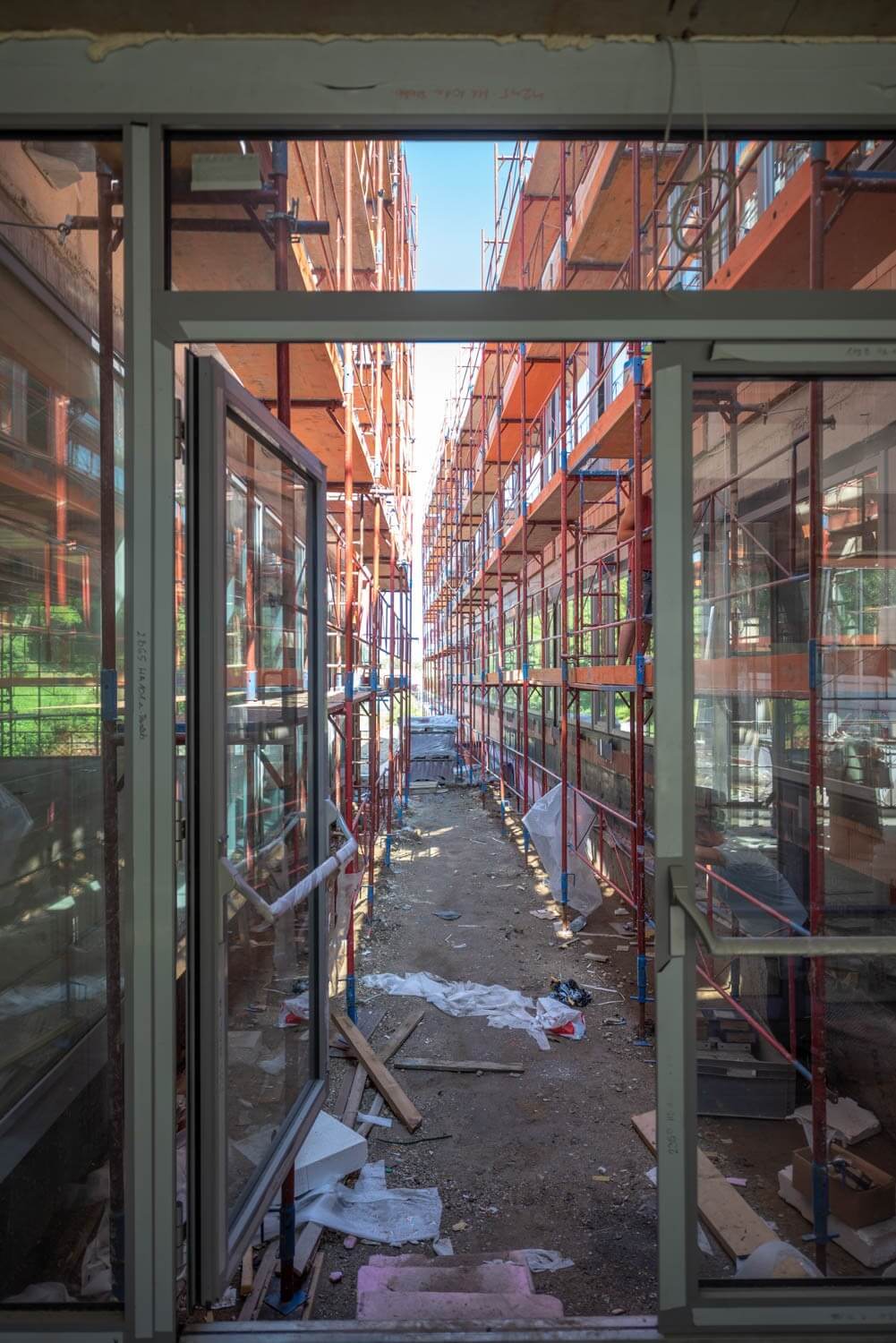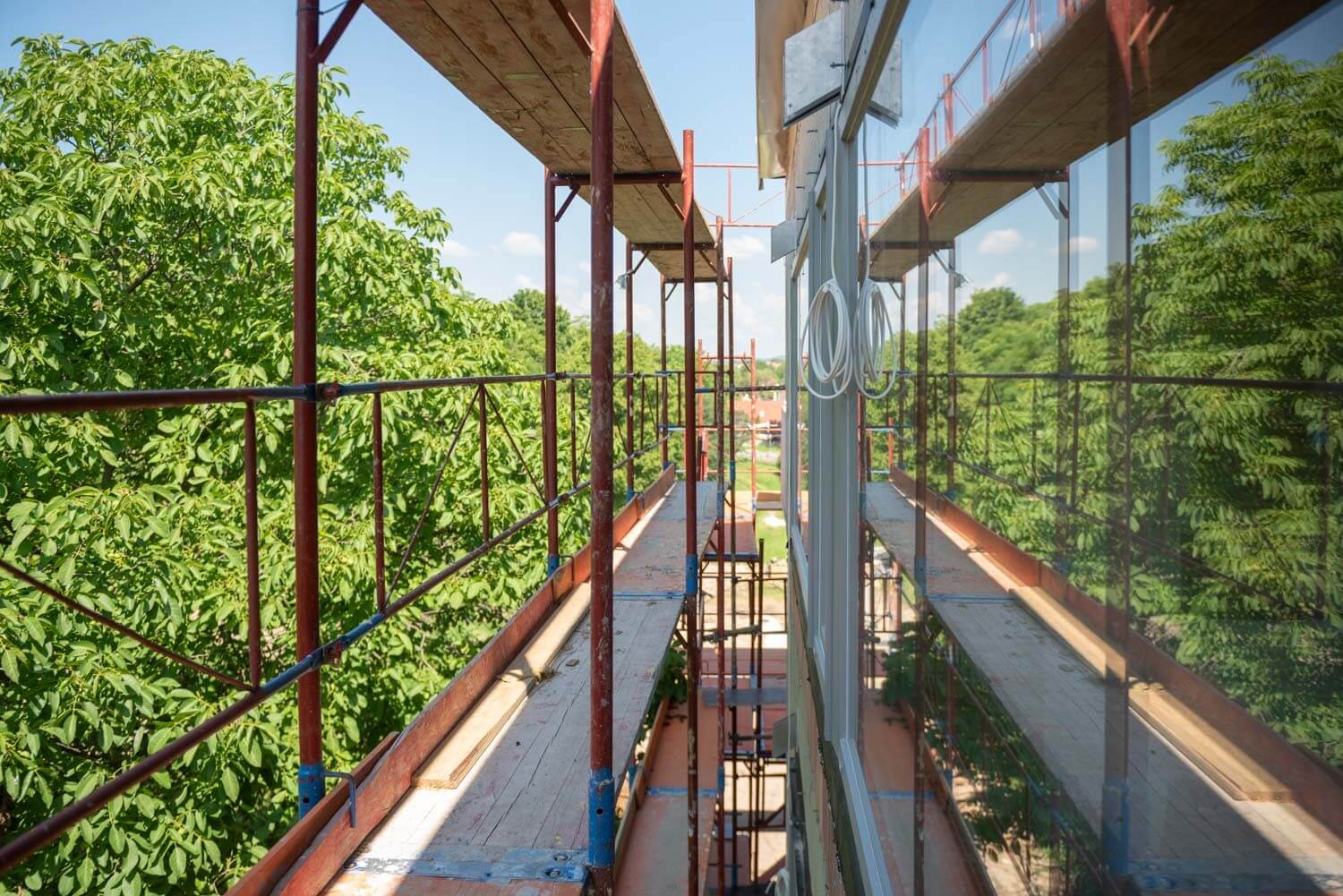 Monori Csaba, az Épkar Zrt. építésvezetője a Magyar Építőknek elmondta, hogy a tervezők egy különleges, első pillantásra nem nyilvánvaló építészeti megoldással éltek: az épület vasbeton gerincéhez képest a házban síktörés figyelhető meg, a gerinccel egyetlen fal sem párhuzamos. A gerendamagasság emiatt végig változik, és az ablakok is trapéz alakúak.