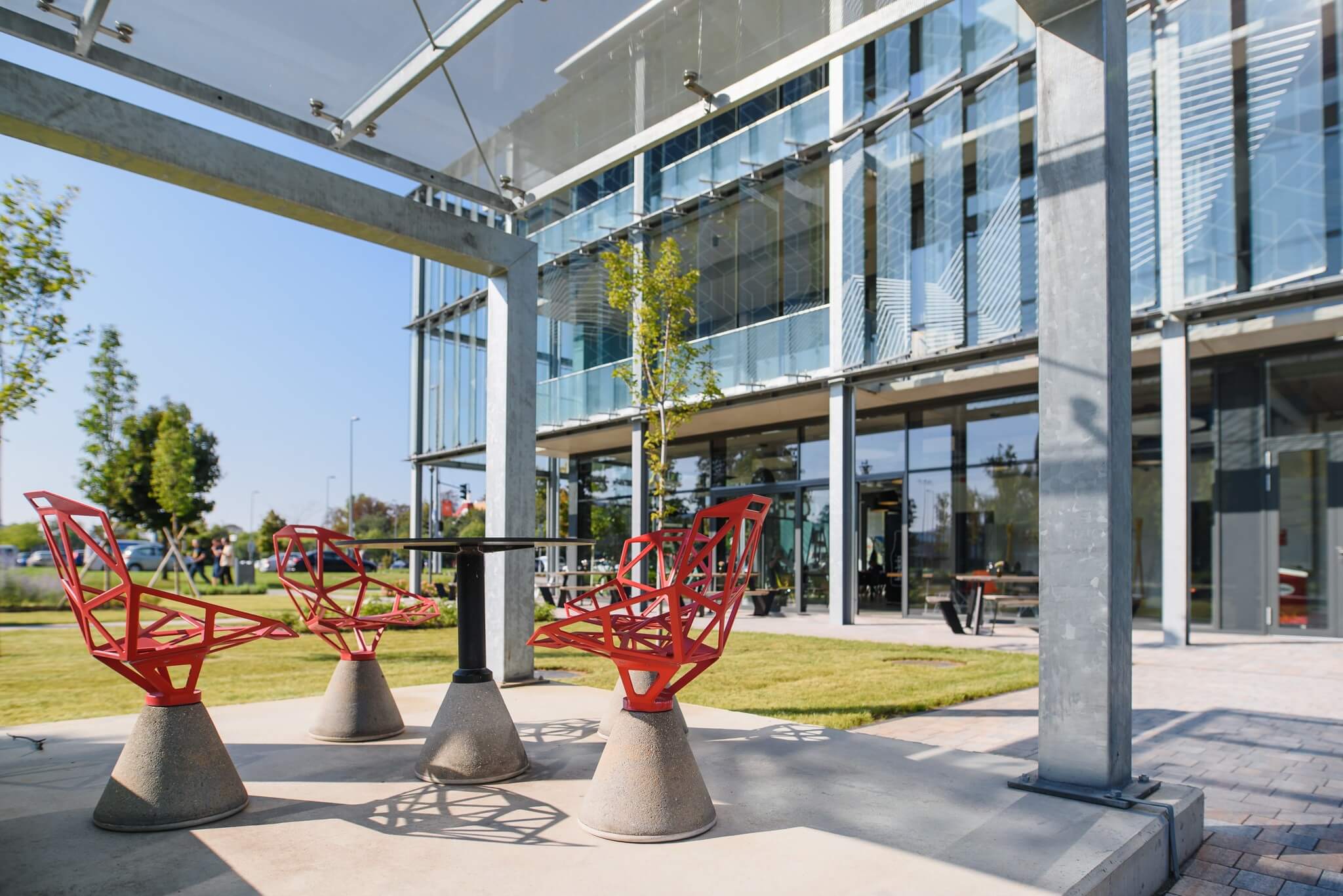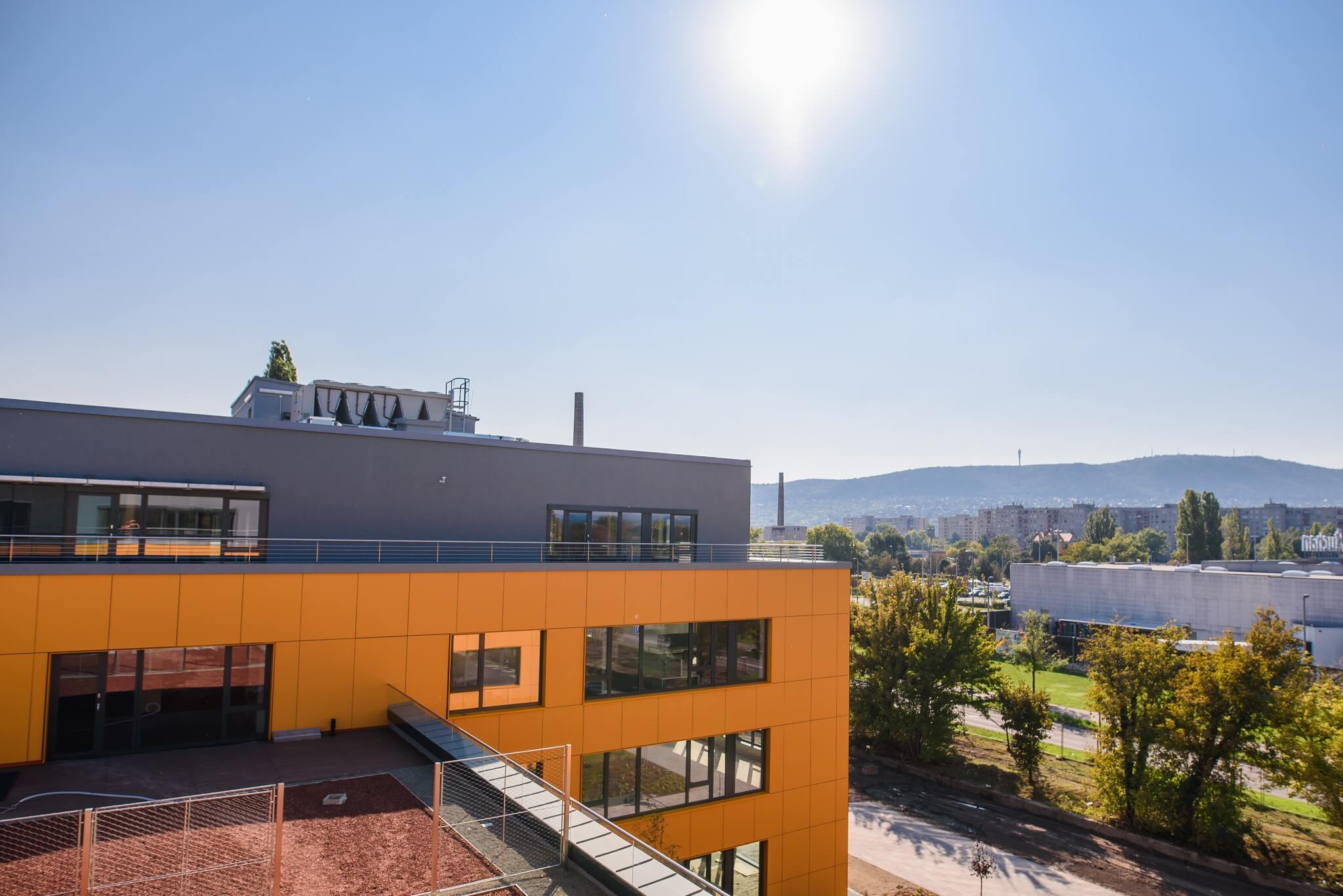 Mostantól a parkba érkezőket az új, Radius B+S által tervezett Startup House fogadja majd. Itt a külső palást és a belső, tényleges homlokzat között bejárati terek, árkádok, teraszok és erkélyek épültek, a felső szinten pedig zöld felületek alakultak ki. A ház hűtés-fűtés gépészeti rendszerét a környezettudatosság jegyében, az energiafelhasználási hatékonyság és a magas zajszint, a légállapot és esztétikai szempontok miatt változó hűtőközeg-áramú (VRV) rendszer látja el.