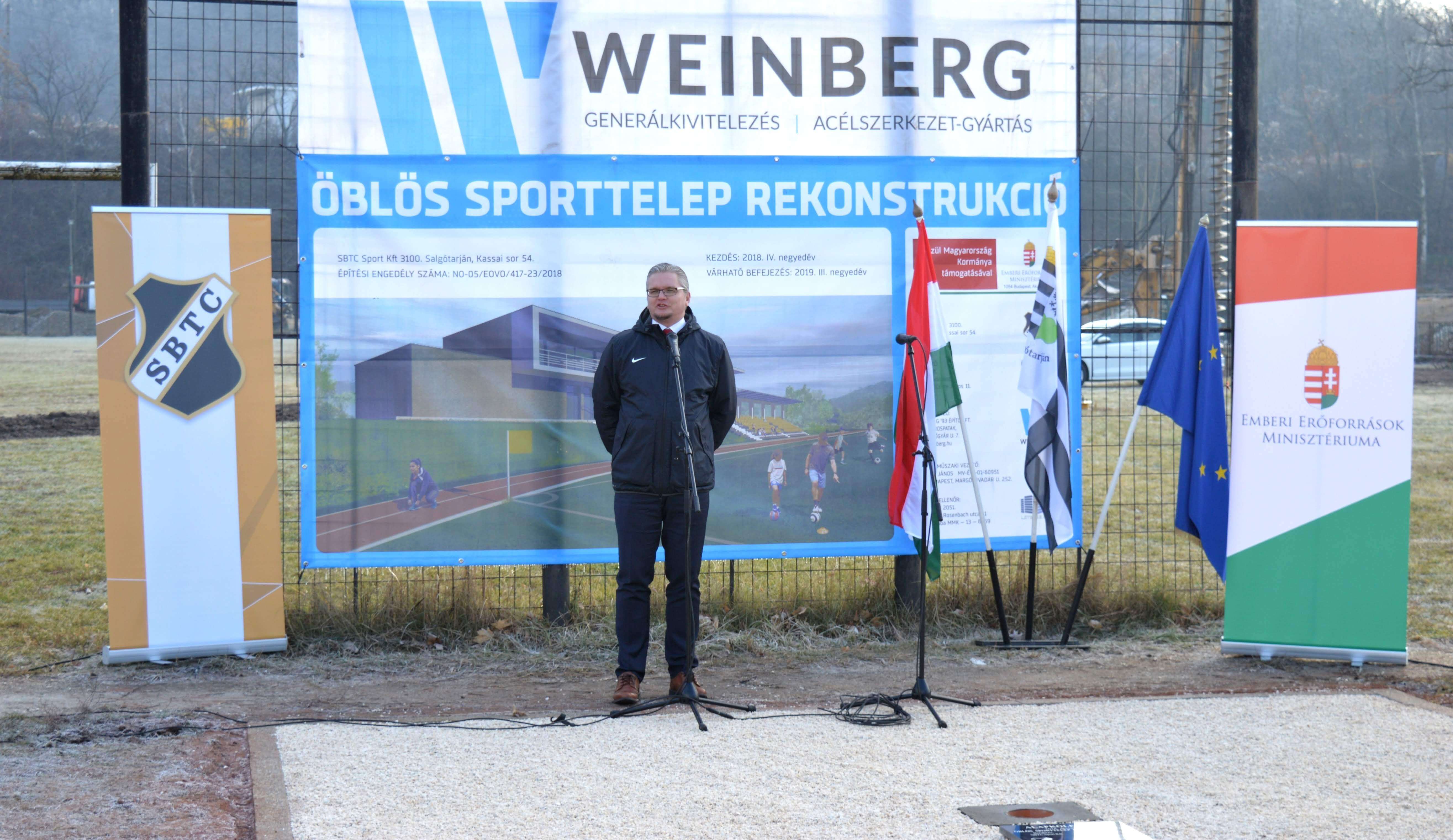 Megkezdődtek a munkálatok a salgótarjáni Öblös Sporttelepen a Weinberg ’93 Építő Kft. kivitelezésében. Az SBTC futballegyesület otthonául szolgáló létesítmény projektjének alapkövét pénteken tették le, miután először 2017 márciusában születtek tervek a központ fejlesztésére – számol be a Nógrád Online.