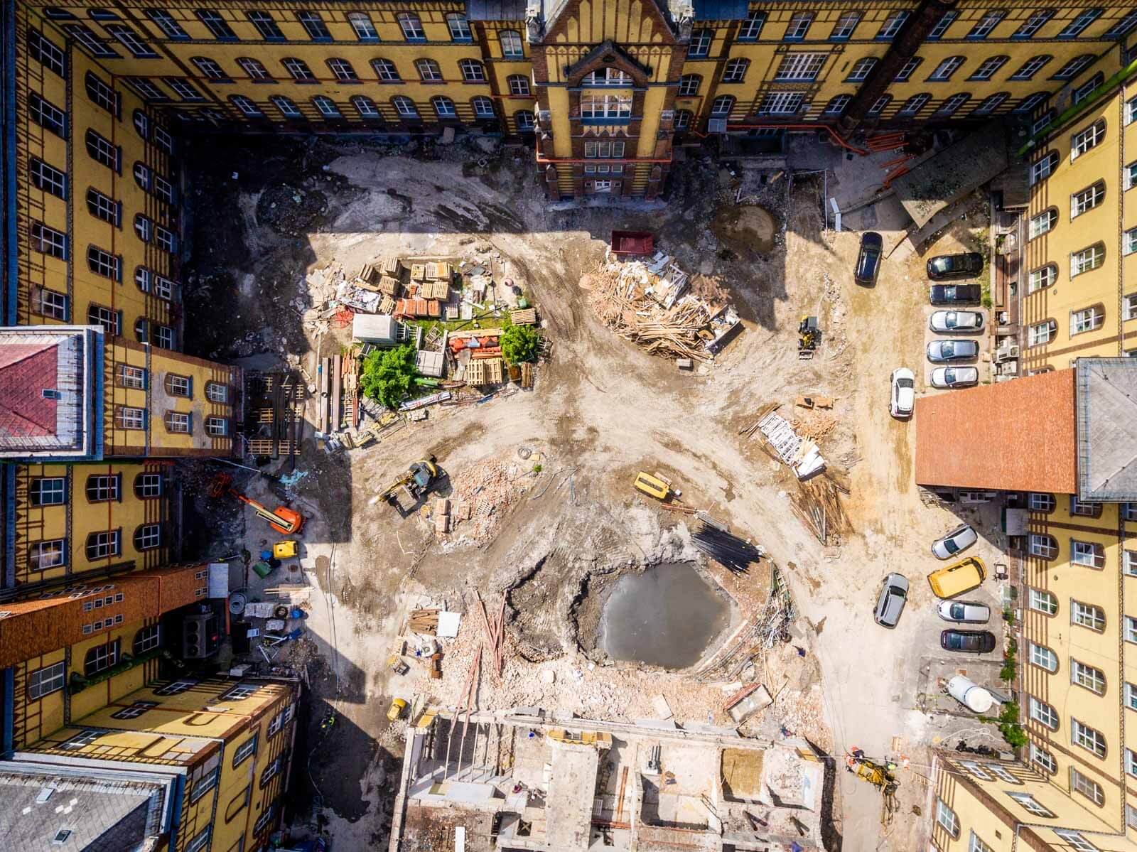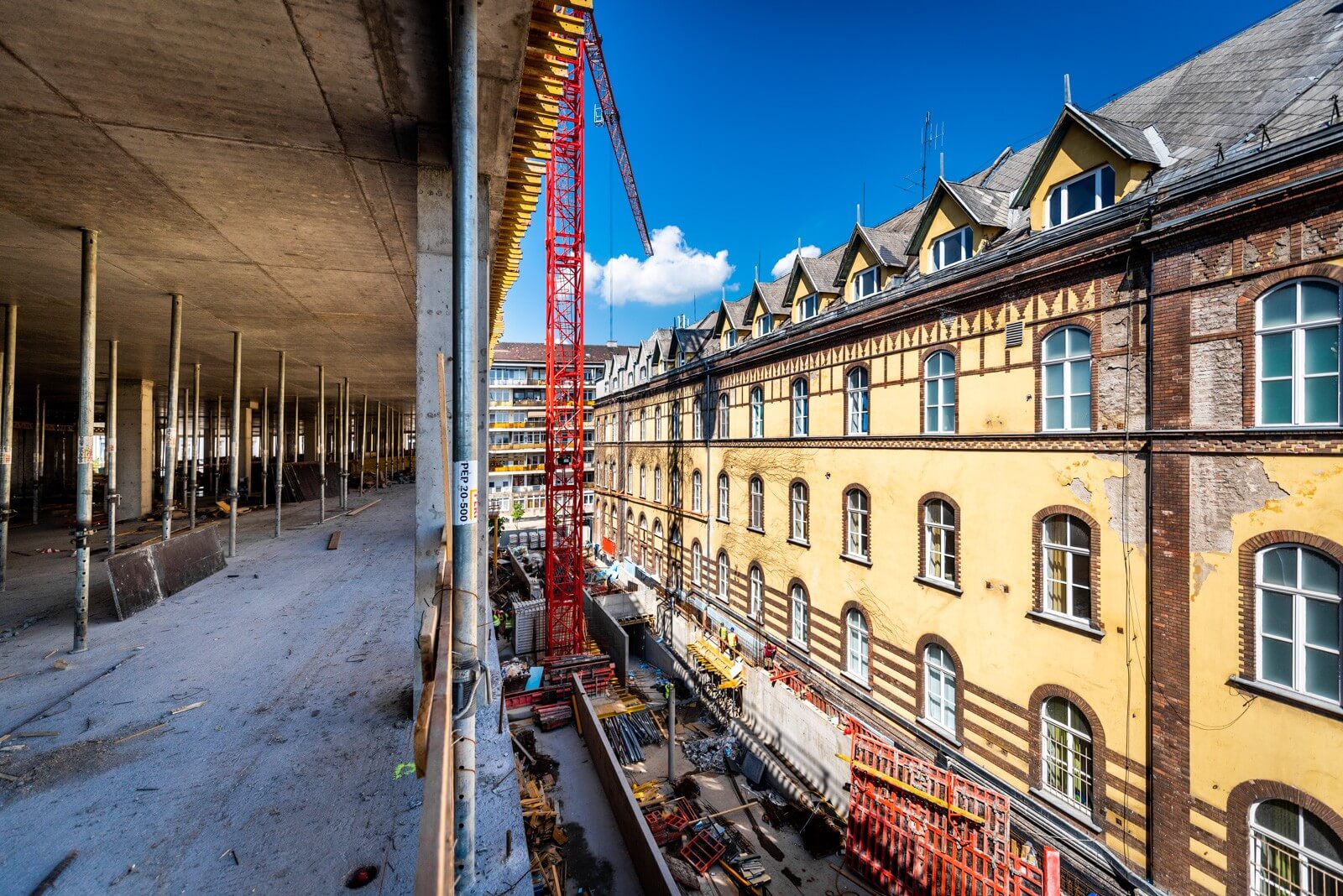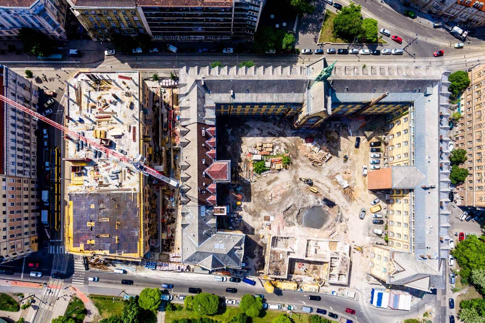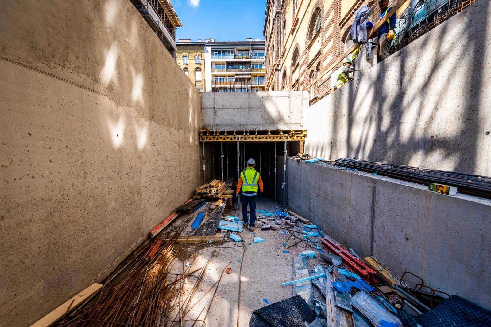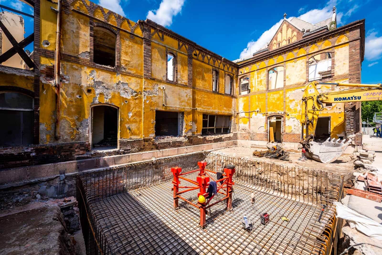 A meglévő műemléképület alapozási síkja magasabban van, mint az építendő központi épület pinceszintje, így egy jet-es eljárással meg kell erősíteni az érintett alaptesteket a műemléképületnél, illetve a megmaradó falak alatt is, amiket meg kell őrizni, jelenleg ennek a munkálatai zajlanak.