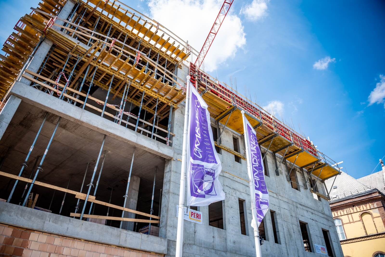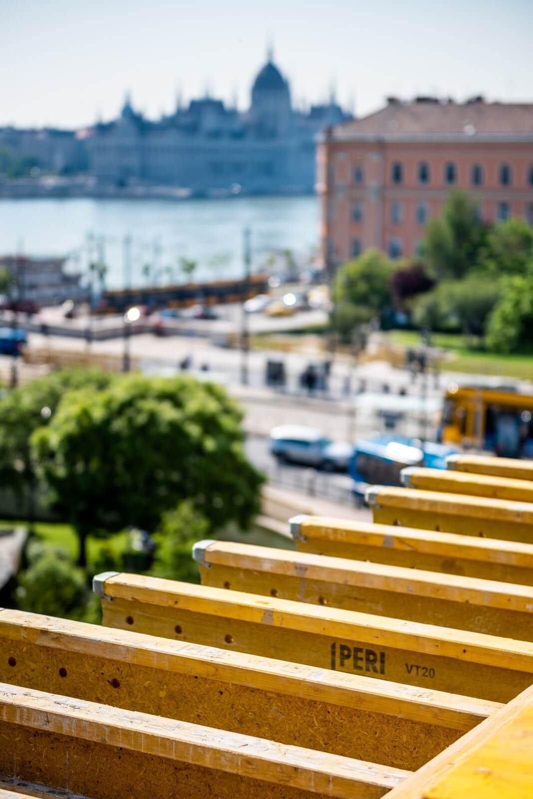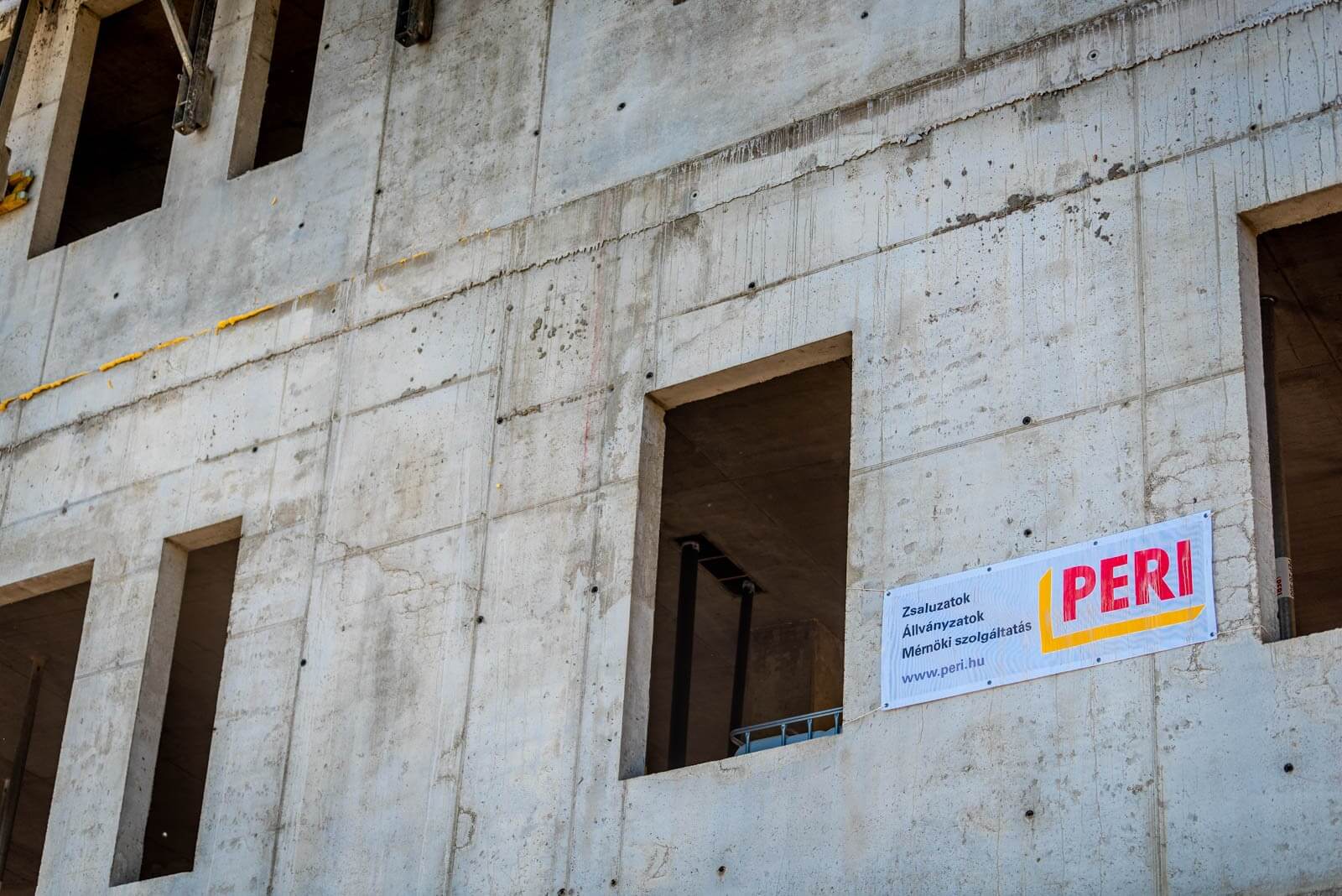 A homlokzati falaknál a szerkezetépítő kivitelező Tega-Bau Kft. biztonsági állványként alkalmazta a PERI FB munkaállványt – erről történt a külső falak vasszerelése, valamint a falzsaluzat összeszerelése. A szerkezetépítő azért választotta a PERI rendszereit, mert a falzsaluzatok összeállításánál az egyetlen kötőelemmel, a BFD kapoccsal könnyen összeszerelhető TRIO rendszer sok variációs lehetőséget biztosított. A MULTIFLEX fatartós födémzsalu rendszerrel pedig a födém alaprajzi sajátosságai optimálisan megvalósíthatók voltak.