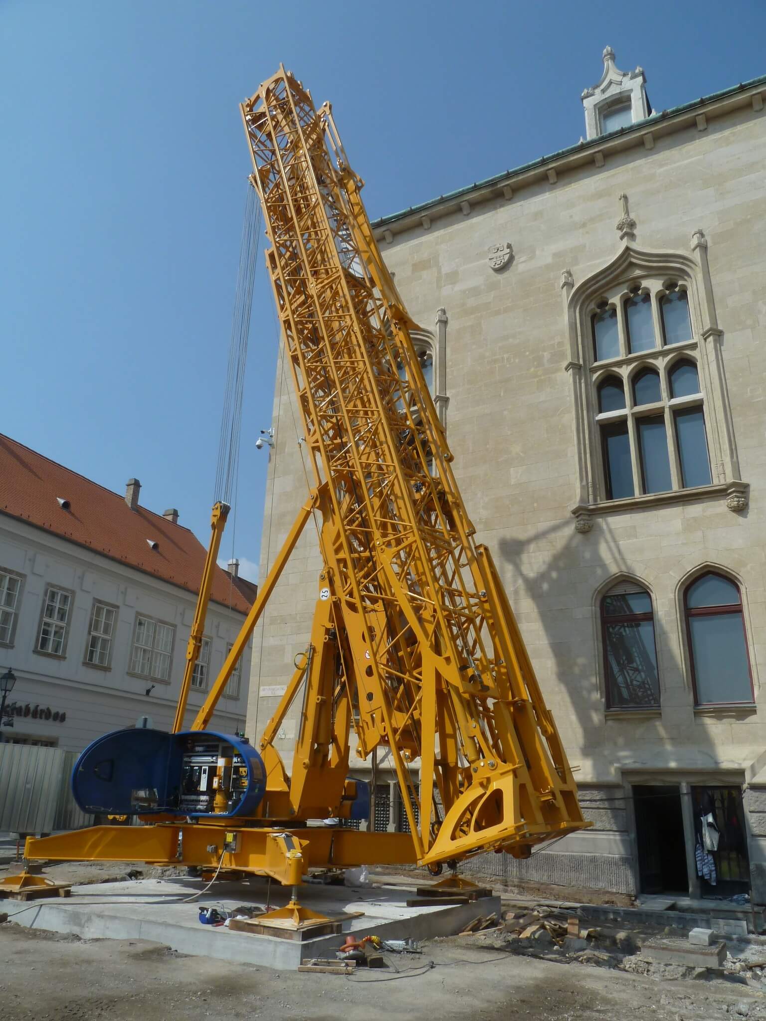 Az építési terület Szentháromság téri részén a darualap betonozását követően, április második hetében szerelték össze a további feladatokhoz, így a szerkezetmegerősítési munkák mellett a rizalit visszaépítéséhez is nélkülözhetetlen toronydarut. A 36 méter emelési magasságú, 6600 kg maximális teherbírású acélszerkezet májusban állt munkába. A kivitelezők nagy gondot fordítanak arra, hogy a felvonulási munkák minél kevésbé zavarják a környéken lakókat.